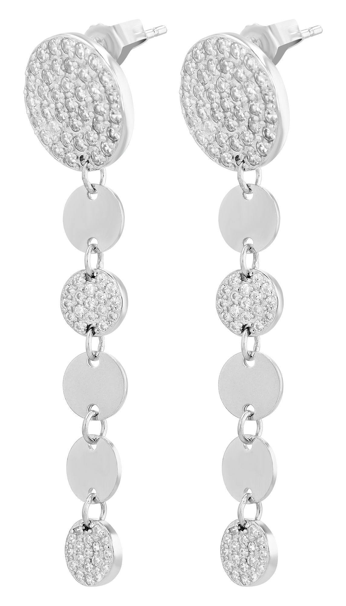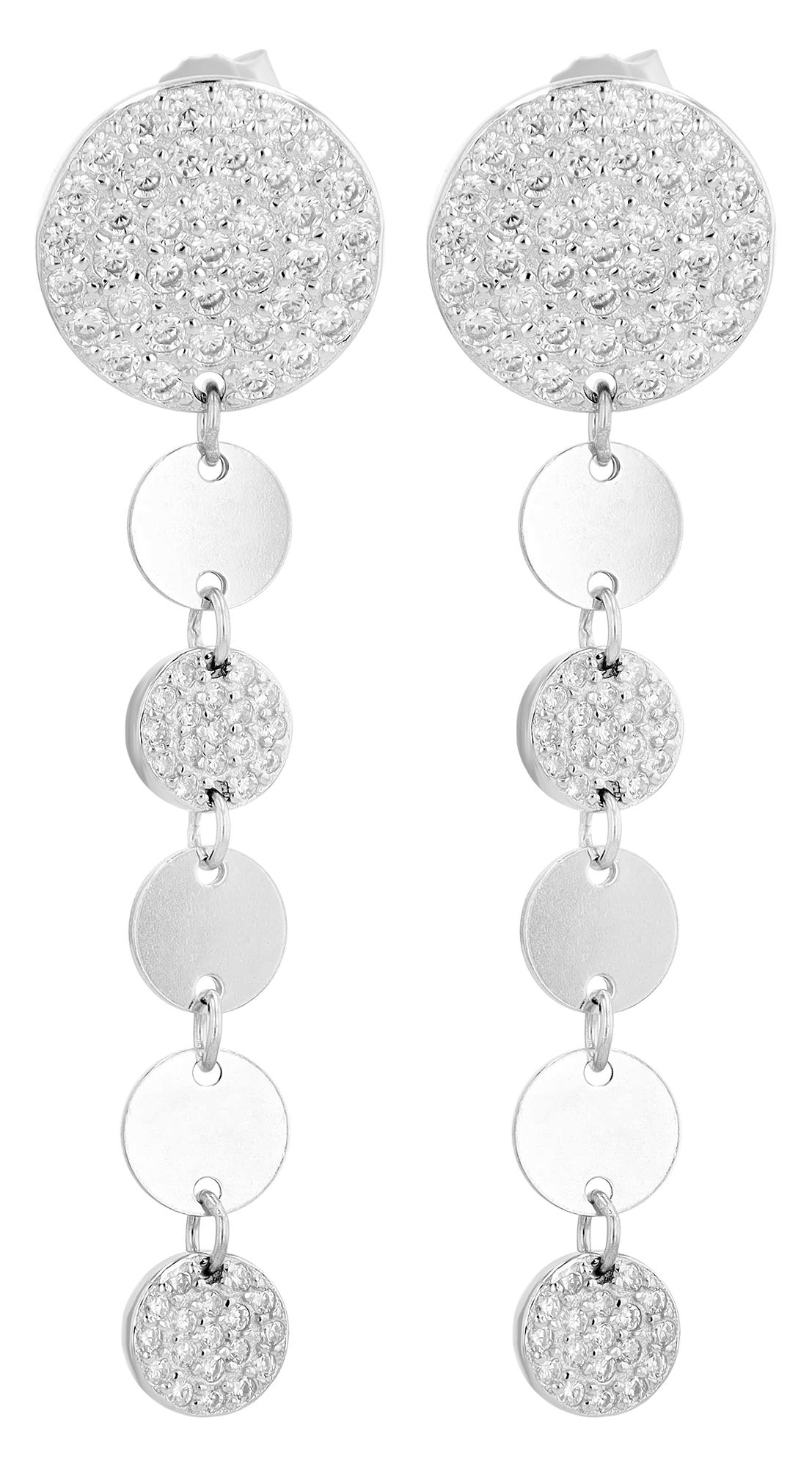 Het ontwerp bestaat uit zes cirkelvormige elementen die met elkaar verbonden zijn en zachtjes wiegen bij elke beweging. De bovenste cirkel met een diameter van 12 mm is volledig bezet met fonkelende zirkonia en trekt ieders aandacht. Daaronder bevinden zich vijf kleinere cirkels met een diameter van 6 mm, waarvan er twee ook bezet zijn met zirkonia, terwijl de overige drie cirkels discreet glinsteren in een gepolijste look.