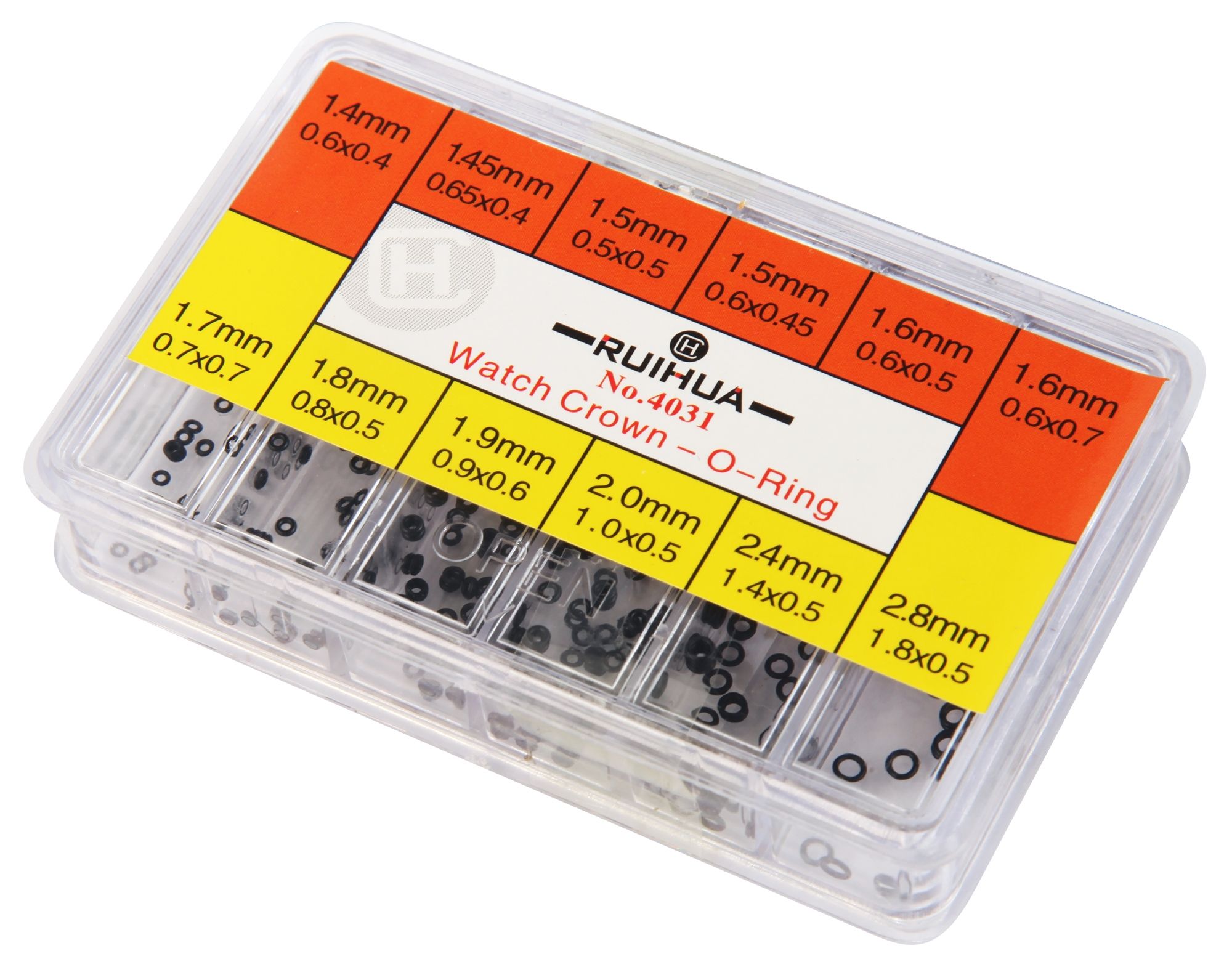 Het assortiment kroonpakking bevat kroonpakkingen in 12 verschillende maten. De kleinste pakking heeft een diameter van 1,4 mm en de grootste pakking is 2,8 mm. De andere pakkingen hebben een diameter van 1,45 mm, 1,5 mm, 1,6 mm, 1,7 mm, 1,8 mm, 1,9 mm, 2,0 mm en 2,4 mm. Ze verschillen ook in dikte. De kroonzegels hebben een dikte van 0,17 mm tot 0,7 mm.