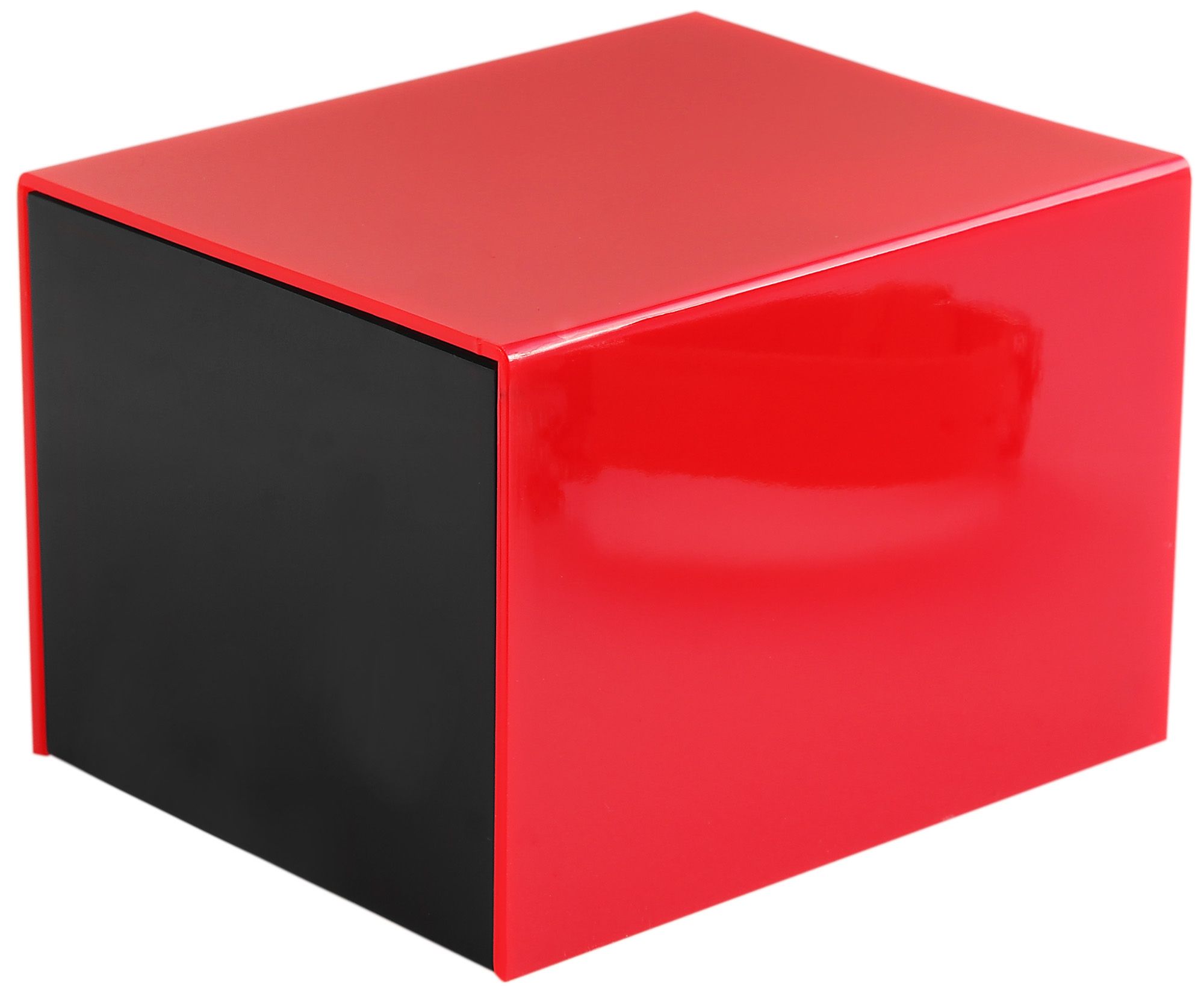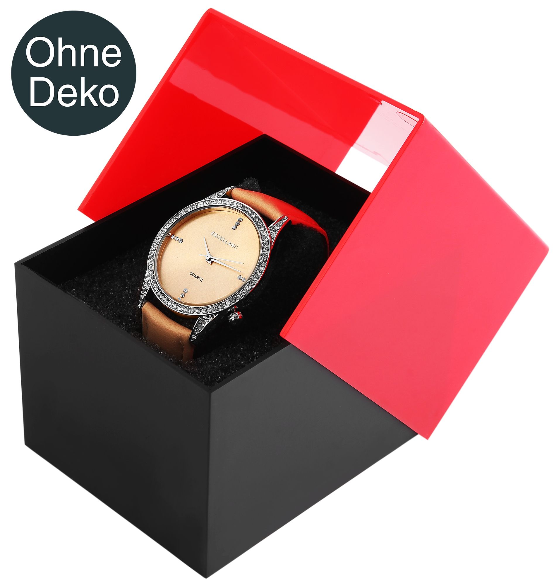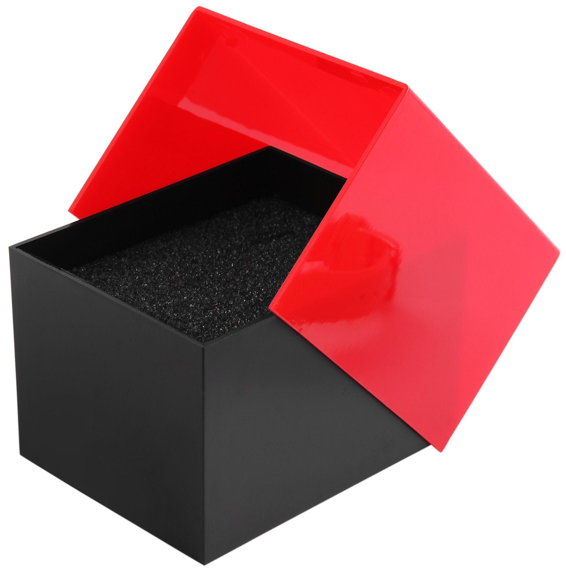 De horlogedoos is gemaakt van plastic, het onderste gedeelte is zwart en het deksel is rood. Binnenin zit een grijze schuimrubberen inleg met een uitneembaar horlogekussentje. De doos is ideaal voor het presenteren en opbergen van horloges, maar ook voor andere geschikte sieraden. De glanzende look en het speciale vouwmechanisme geven de verpakking een uniek design. De afmetingen van de horlogedoos zijn 9,9 cm lang, 8,1 cm breed en 6,8 cm diep.