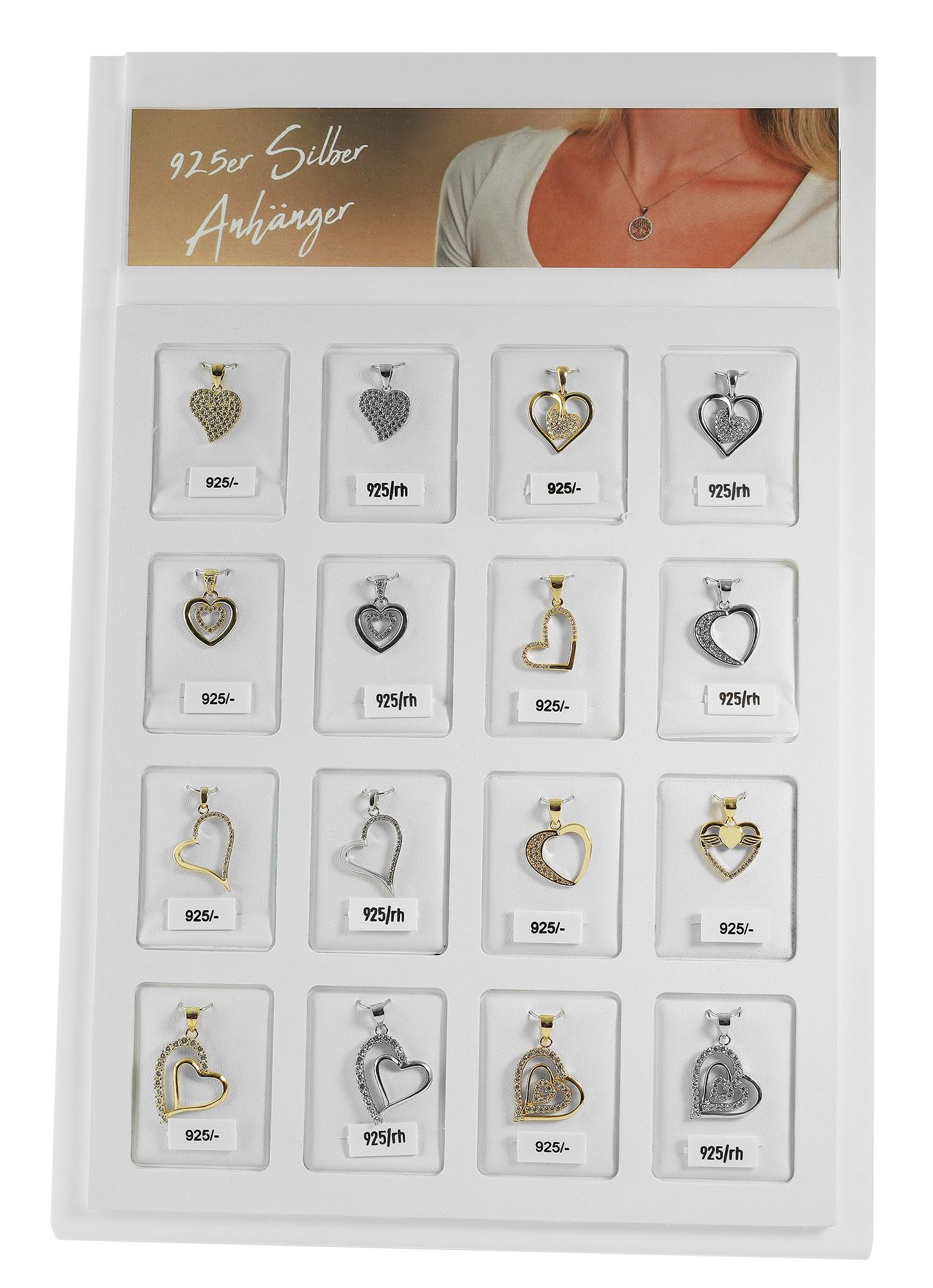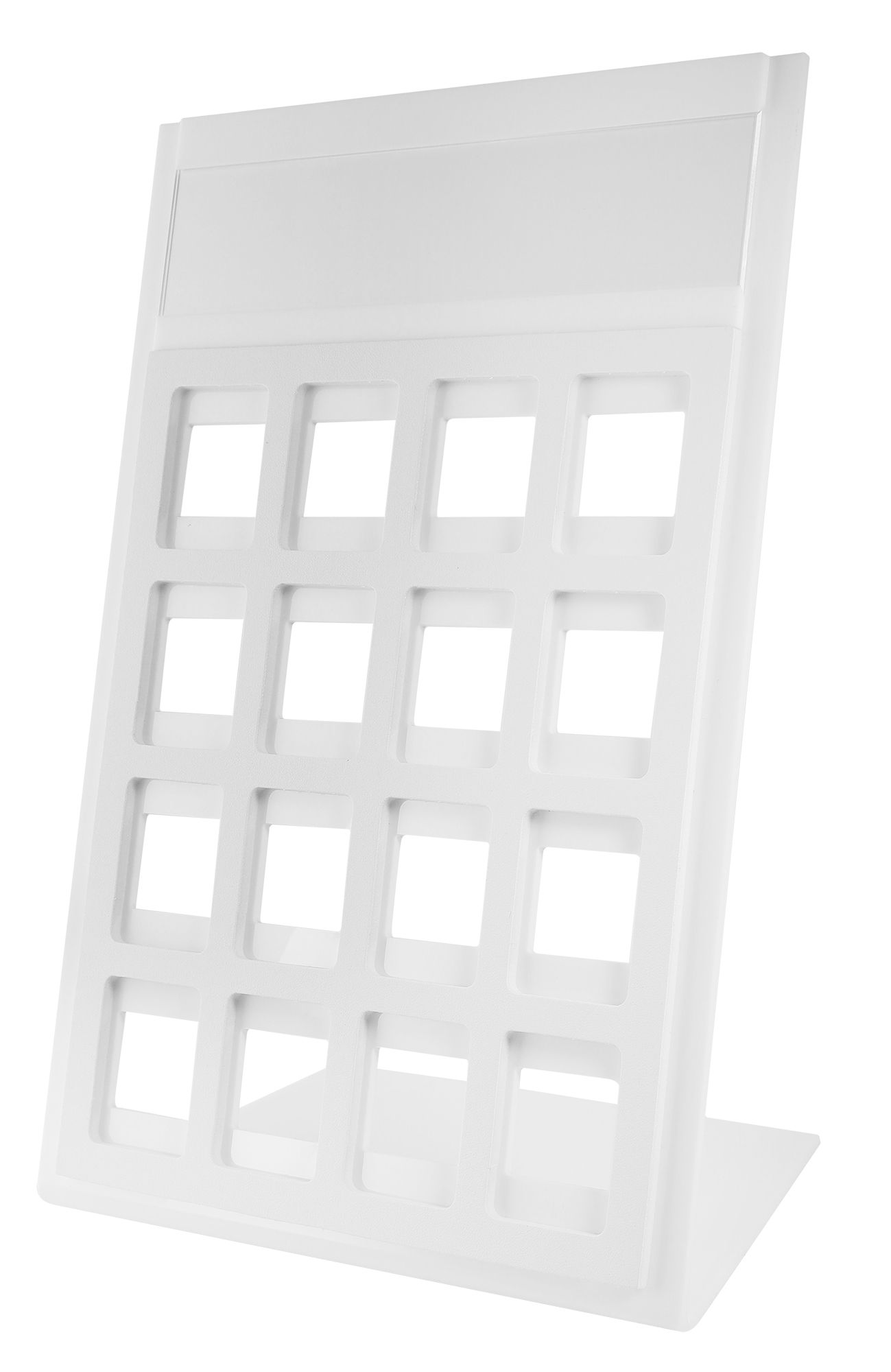 Presenteer uw sieraden perfect en aantrekkelijk met onze hoogwaardige sieradendisplay van wit kunststof. De heldere, stijlvolle uitstraling van deze displays vestigt de aandacht op uw sieraden en zet ze vakkundig in scène op de toonbank of in de etalage. Elke display heeft de optie van een eenzijdige inscriptie op de bovenkant, bijv. individuele belettering of een afbeelding die past bij de getoonde sieraden.