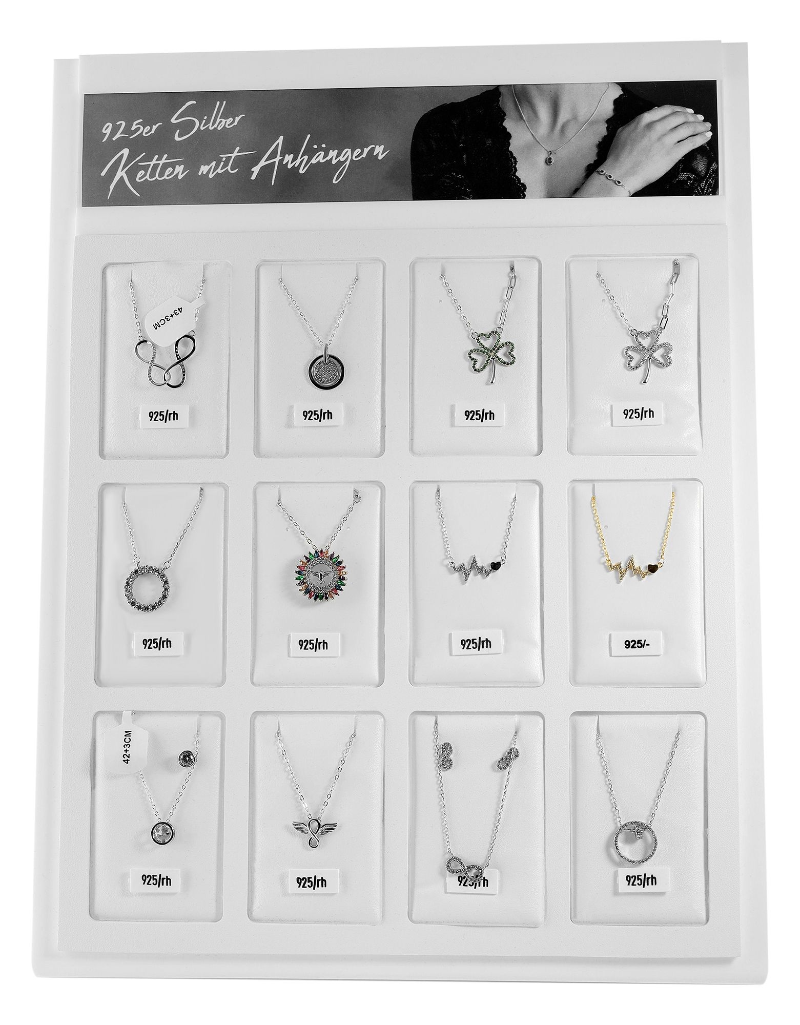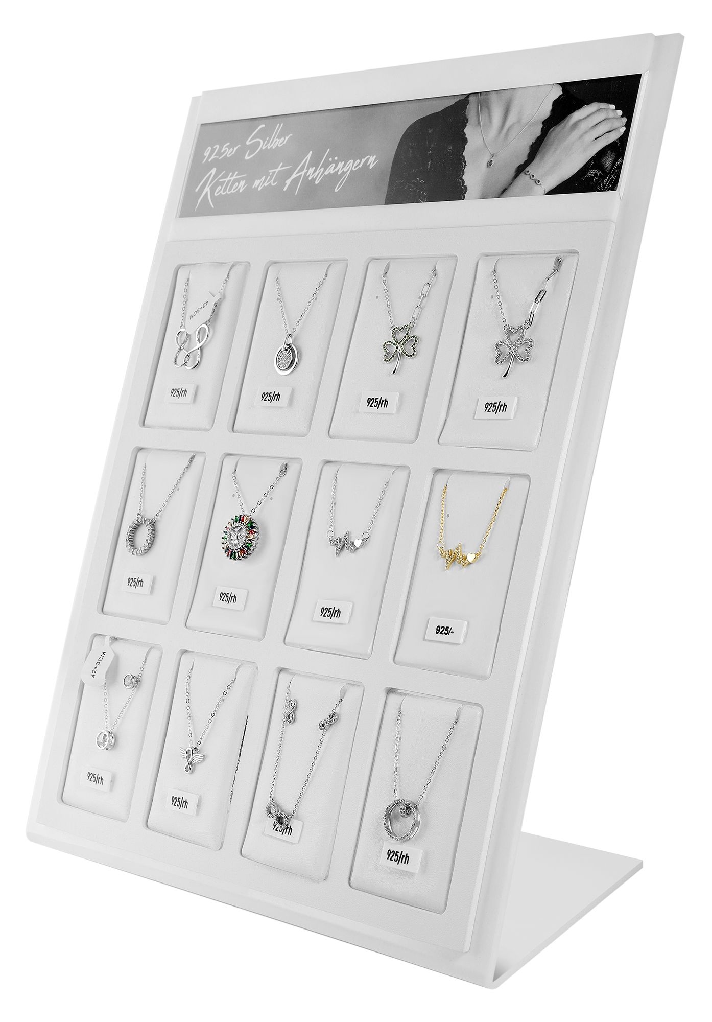 Presenteer uw sieraden perfect en aantrekkelijk met onze hoogwaardige sieradendisplay van wit kunststof. De heldere, stijlvolle uitstraling van deze displays vestigt de aandacht op uw sieraden en zet ze vakkundig in scène op de toonbank of in de etalage. Elke display heeft de optie van een eenzijdige inscriptie op de bovenkant, bijv. individuele belettering of een afbeelding die past bij de getoonde sieraden.