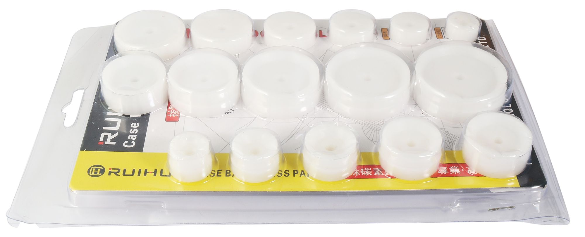 De reserveonderdelenset bevat 16 drukstukken voor een glas-inpersblok of een behuizingsbodemsluiter. Inbegrepen zijn ronde drukstukken in de maten 18 mm - 50 mm. Elk drukstuk kan met een schroefdraad aan de gewenste mal worden bevestigd. De drukstukken zijn gemaakt van kunststof. Dit heeft als voordeel dat horloges beschermd zijn tegen krassen en beschadigingen. Het grote aantal drukstukken met verschillende afmetingen dekt een breed scala aan verschillende horloges die met de drukstukken kunnen worden bediend. Een praktisch hulpmiddel dat helpt om zelfs moeilijk te sluiten horloges moeiteloos te sluiten en om glazen recht en voorzichtig in een kast te drukken.