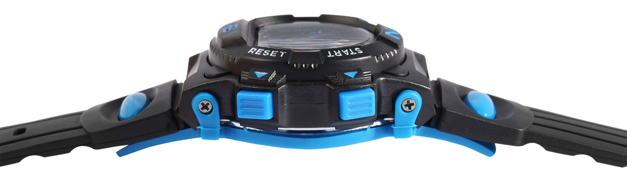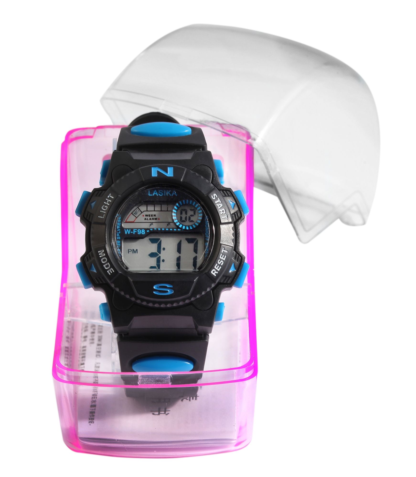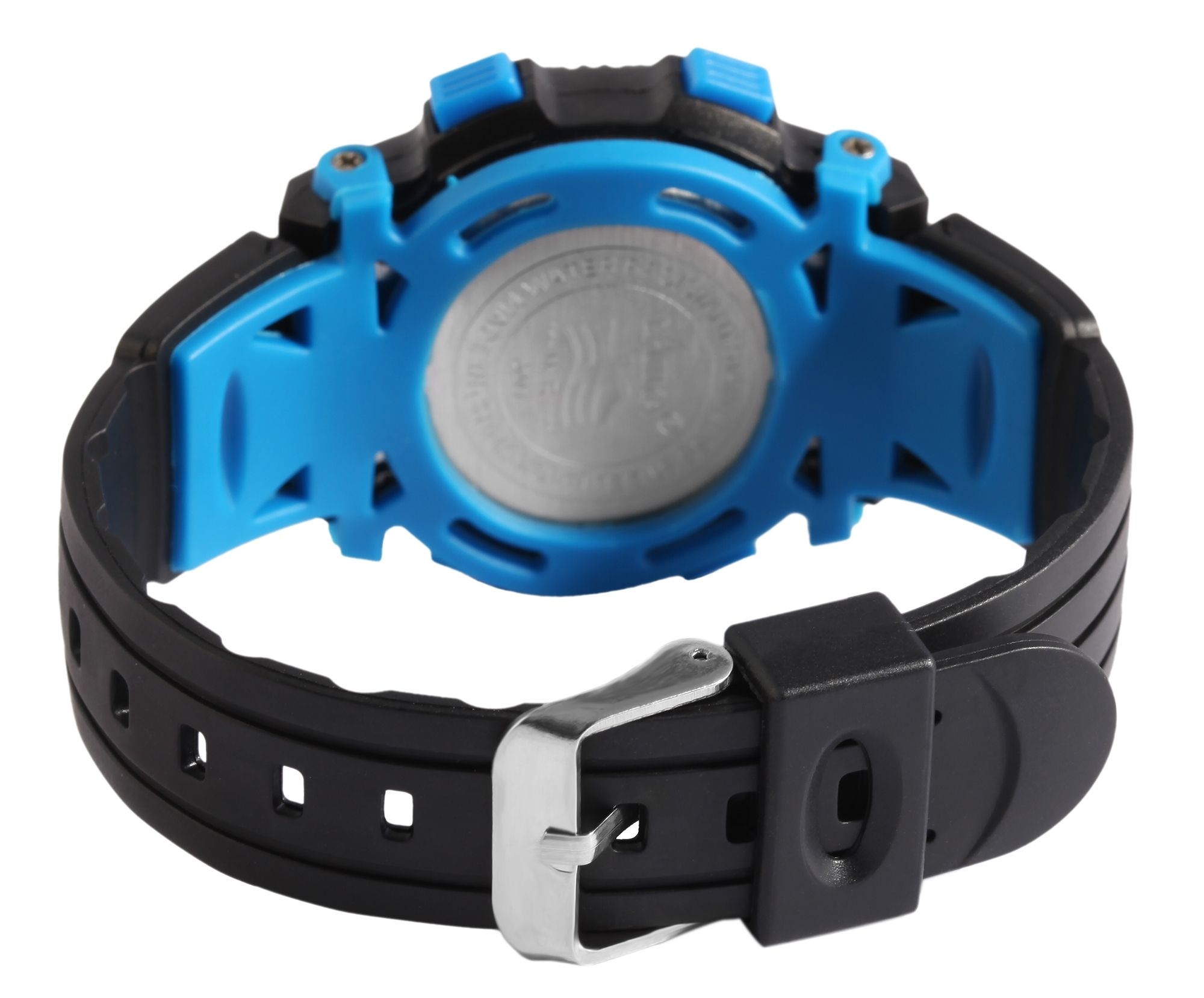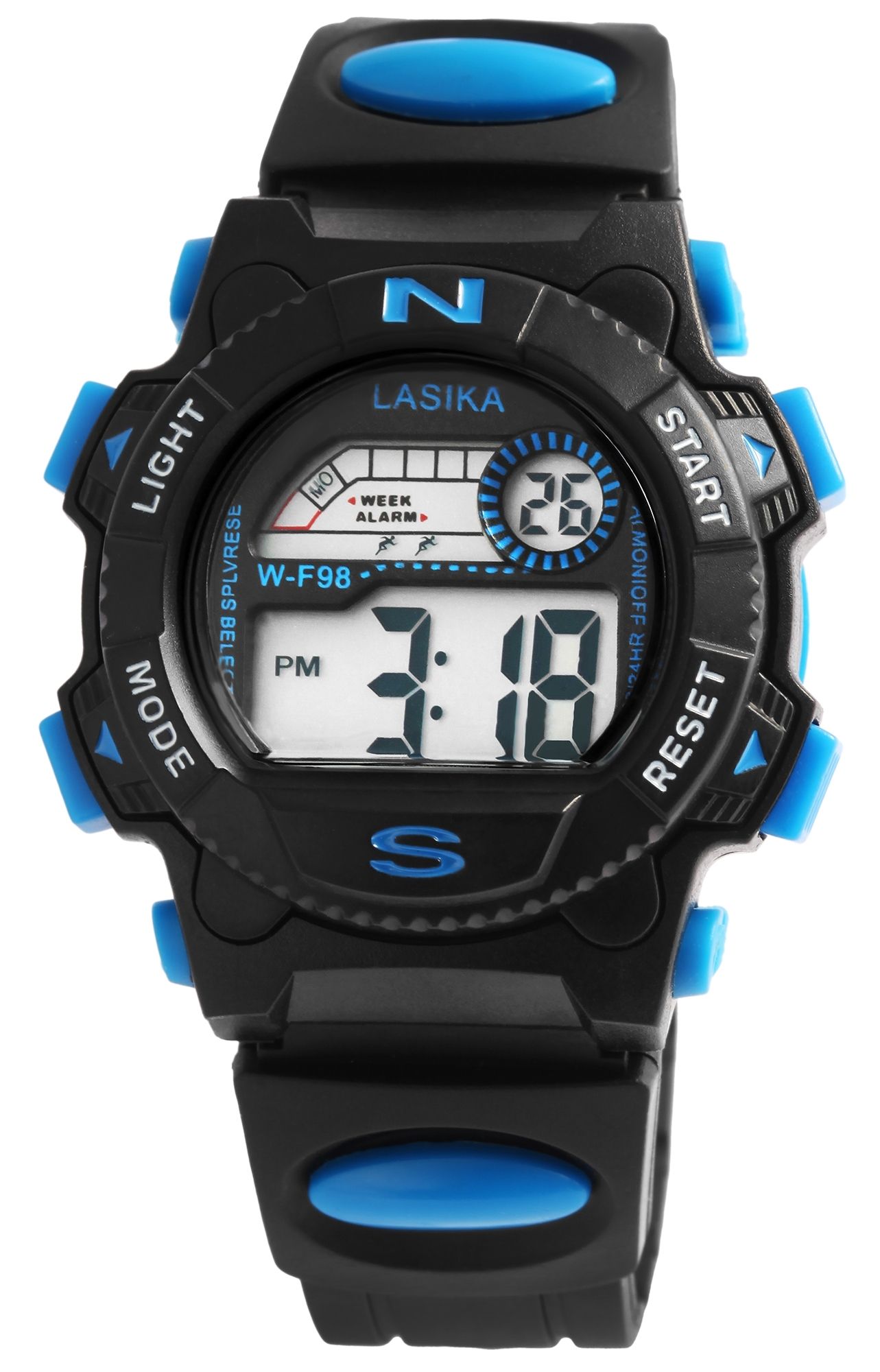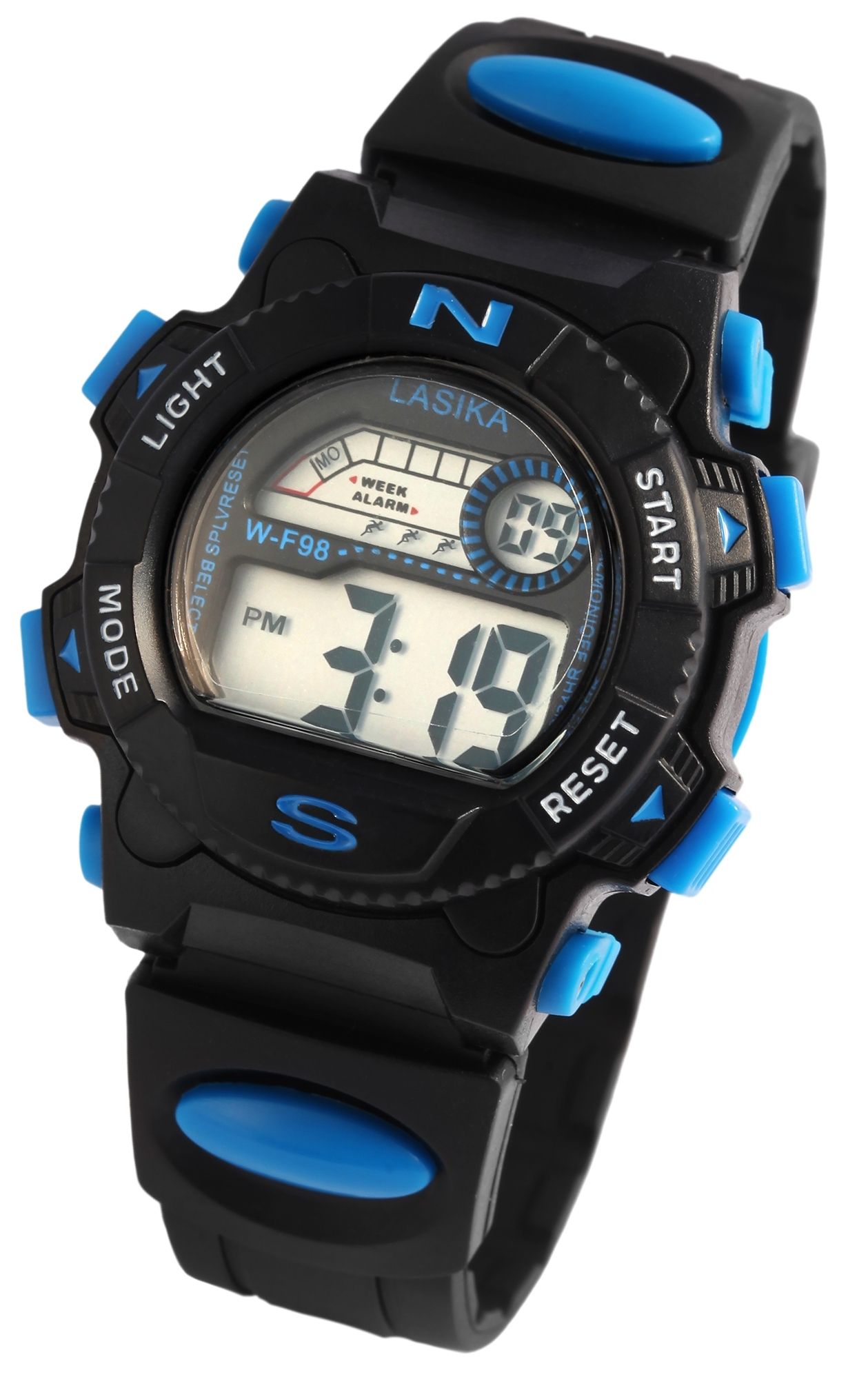 Het digitale kinderpolshorloge van het merk Lasika heeft een digitaal uurwerk van hoge kwaliteit. De zwarte rubberen band is 20 mm breed bij de lug, loopt taps toe tot 16 mm aan het uiteinde en kan worden geopend en gesloten met een zilverkleurige gesp. Het is ook versierd met een blauw rubberen element aan elke kant. De totale lengte van het horloge is 22,5 cm. De zwarte kunststof kast met kunststof kristal heeft een diameter van 38 mm en een kasthoogte van 15 mm. Hij is bijzonder goed bestand tegen schokken en trillingen. De achterkant van de kast is gemaakt van roestvrij staal en is aan de kast bevestigd met 4 roestvrijstalen schroeven. Daarnaast is de achterkant van de kast versierd met een blauw rubberen element dat ook aan de zijkanten van de kast is bevestigd met 4 roestvrijstalen schroeven. Het horloge heeft een waterbestendigheid van 3 bar. De digitale tijd kan worden ingesteld met de vier blauwe drukknoppen op twee, vier, acht en tien uur. Deze drukknoppen kunnen ook worden gebruikt om alle andere functies in te stellen, zoals de datum inclusief de dag van de week en de maand, de displayverlichting, de stopwatchfunctie en de alarmfunctie. Dankzij de lichtfunctie is de tijd bijzonder gemakkelijk af te lezen, zelfs in het donker. Dit product wordt geleverd met doos, gebruiksaanwijzing en garantiekaart.