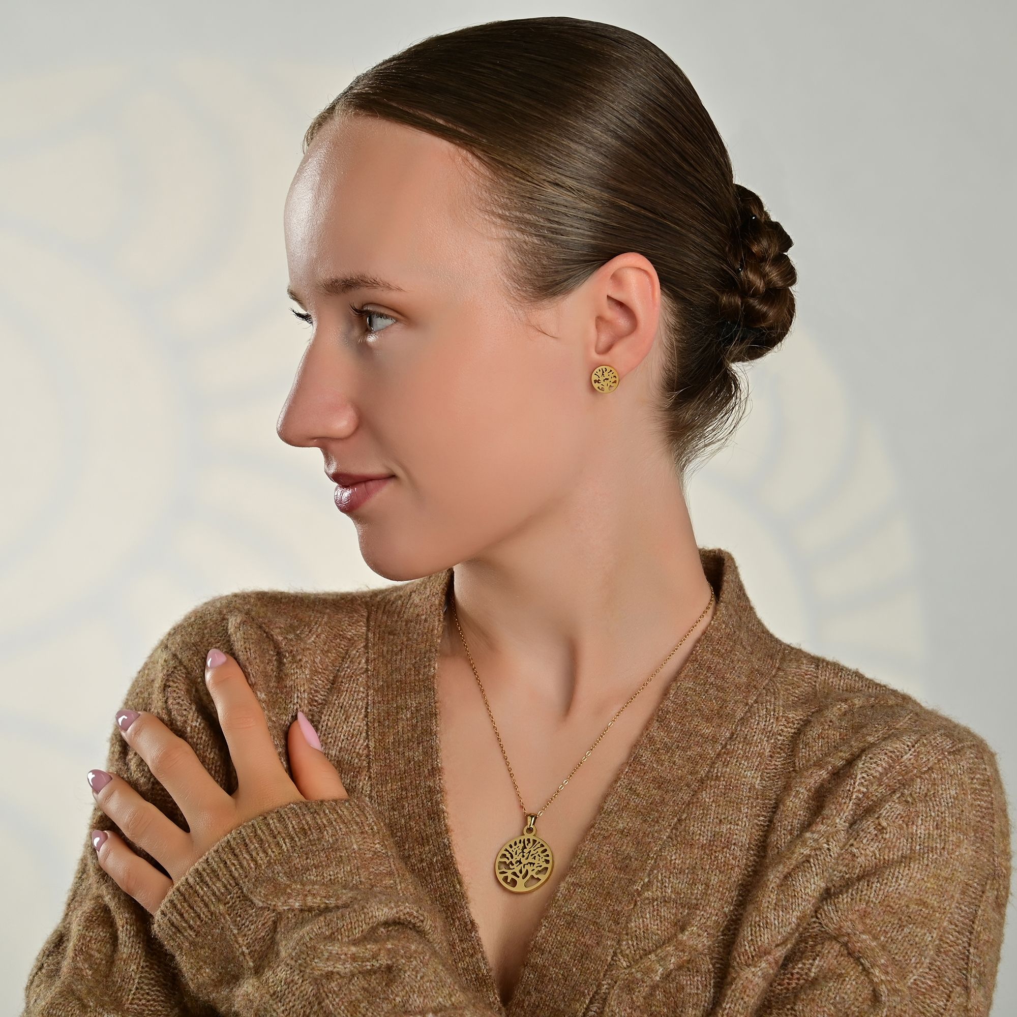 Deze modieuze set van hoogwaardig roestvrij staal biedt een harmonieuze combinatie van een 45 cm lange halsketting met hanger en bijpassende oorstekers, beide versierd met het motief van een levensboom. De set is gemaakt van roestvrij staal en wordt gekenmerkt door zijn duurzaamheid. Het is ook gemakkelijk te onderhouden en hypoallergeen. De lichtheid van het materiaal zorgt voor een aangenaam draagcomfort en een duurzame kwaliteit.