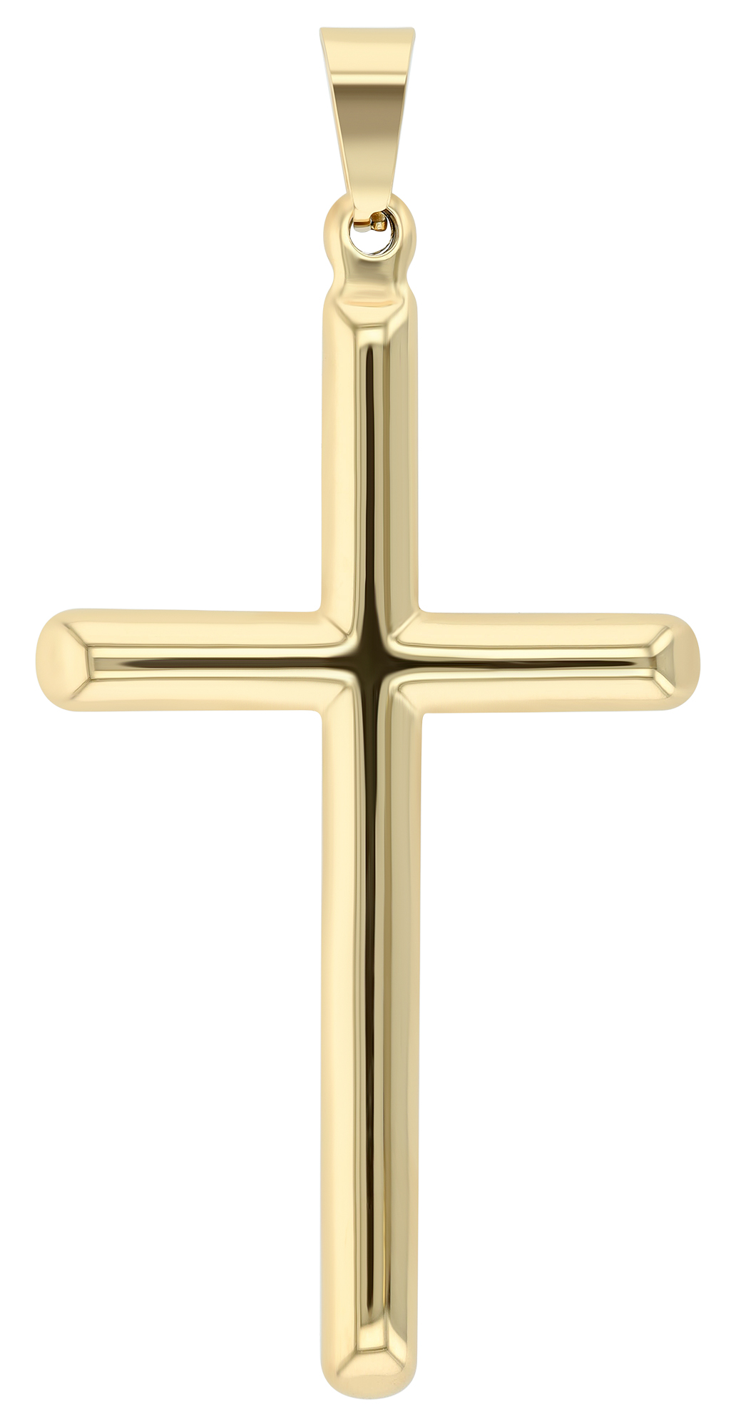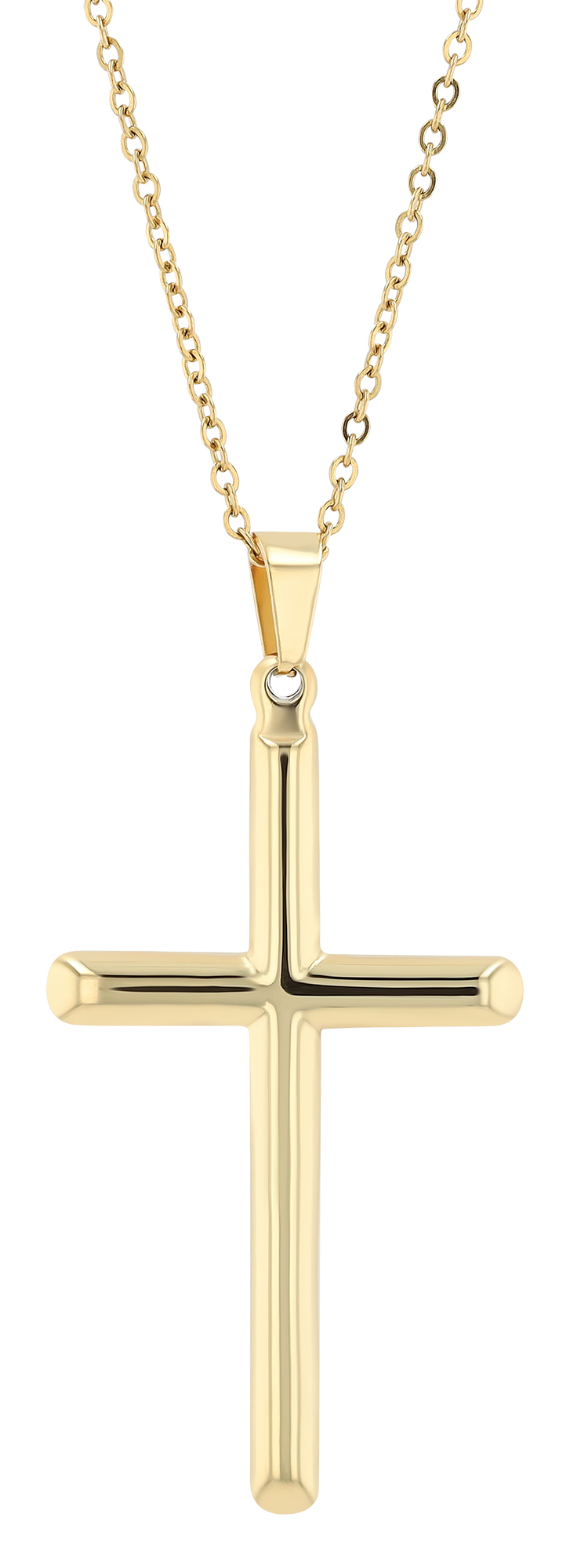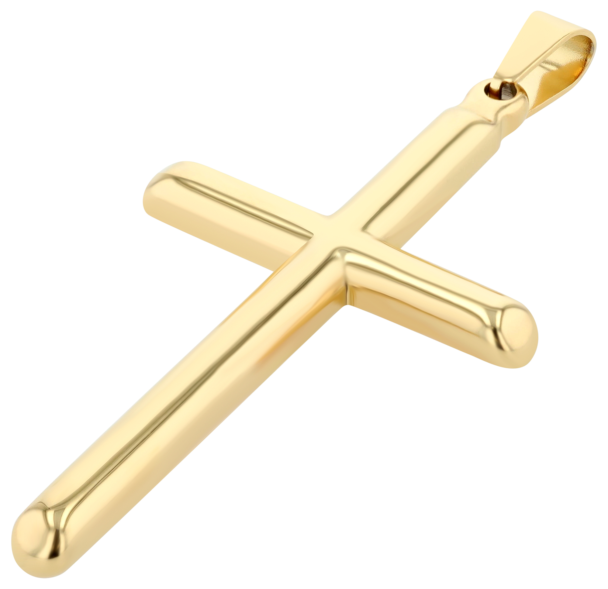 Dit prachtig gevormde, eenvoudige kruis komt overeen met de Latijnse versie met een langere langsstaaf en een kortere dwarsstaaf. De hoeken en uiteinden van het kruis zijn afgerond en gepolijst en het hele sieraad is gemaakt van robuust en duurzaam roestvrij staal. Deze hanger is verkrijgbaar in een stoere zilverkleurige versie, in de elegante goudkleurige versie of in effen zwart, elk met de afmetingen: 51 x 28 x 4 mm.