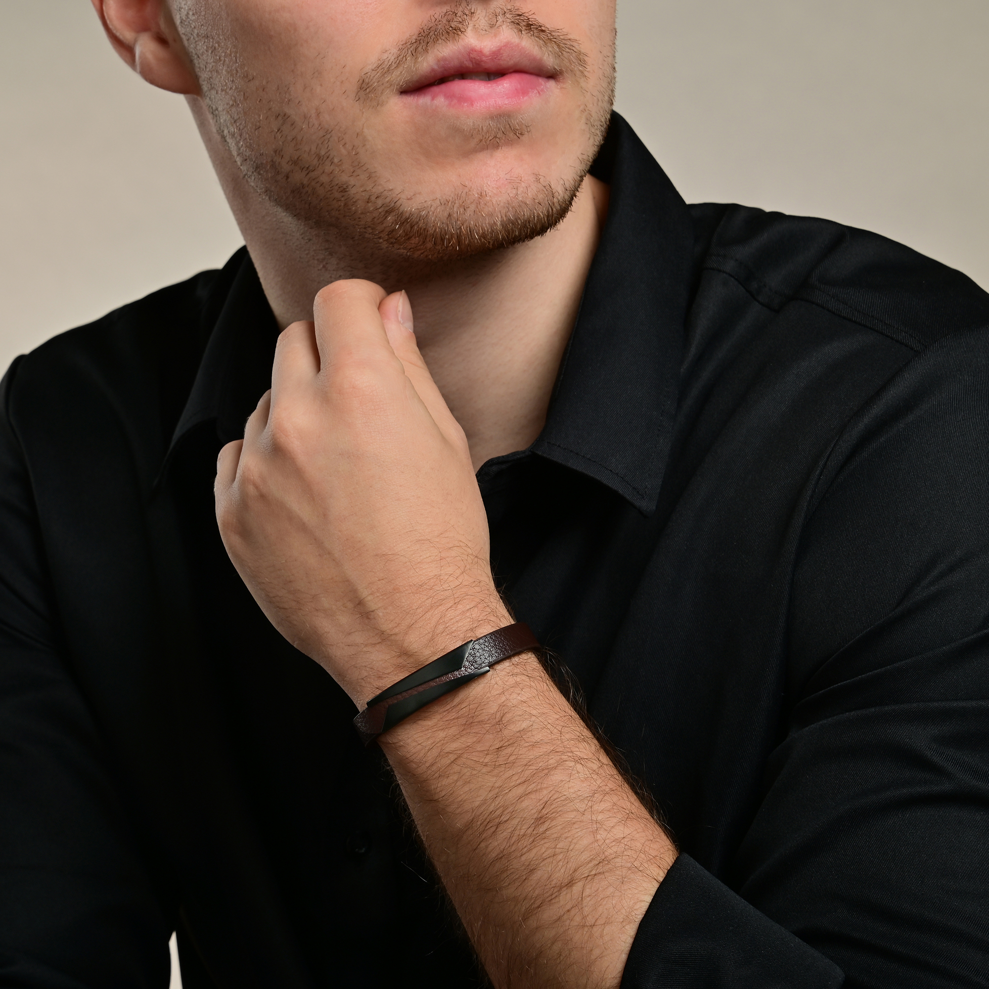 De bruine echt lederen band van het merk Akzent is gemaakt van een 11 mm brede lederen band. In het midden van de band is een zwart, hoekig roestvrijstalen element bevestigd. De eenvoudige sieradenarmband kan worden geopend en gesloten met een zwarte haaksluiting, die ook van roestvrij staal is gemaakt. De afmetingen komen voort uit een totale lengte van 21,5 cm en een materiaaldikte van 0,5 cm.