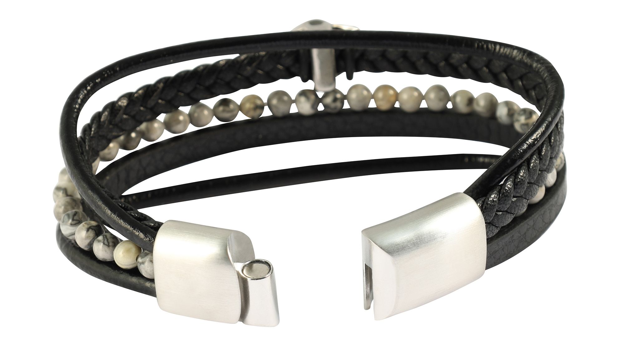 De "Lennie"-armband bestaat uit vier elementen van imitatieleer, die zijn ontworpen in verschillende texturen en zo een gevarieerde en spannende look bieden. De imitatieleren elementen worden aangevuld met jaspis kralen (Ø 4mm), die de armband een natuurlijke maar elegante touch geven.