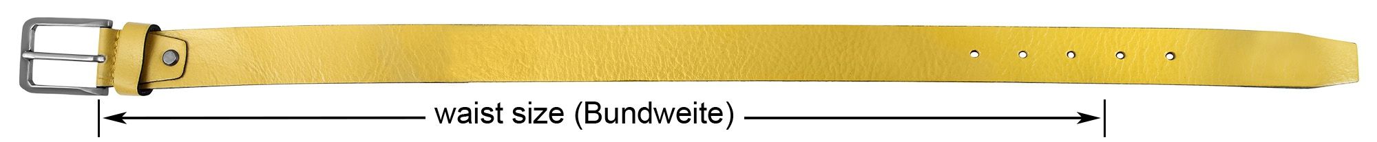 De gele riem van het merk Leonardo Verrelli is gemaakt van echt leer en heeft een gladde afwerking met een aangepaste nerf. Hij heeft een taillewijdte van 105 cm, is 3,4 cm breed en 0,3 cm dik. De gaten zitten 2 cm uit elkaar. Dit maakt de moderne damesriem veelzijdig, omdat hij gemakkelijk door de conventionele riemlussen kan worden gehaald. Dankzij het hoogwaardige, natuurlijke materiaal is deze riem bijzonder robuust, duurzaam en scheurbestendig, waardoor het de ideale metgezel is voor alle gelegenheden. De metalen gesp wordt bevestigd met een schroef, waardoor de riem gemakkelijk kan worden ingekort en aangepast aan elke tailleomvang. De maat van de riem wordt aangegeven in taillebreedte, die 15 cm korter is dan de totale lengte.