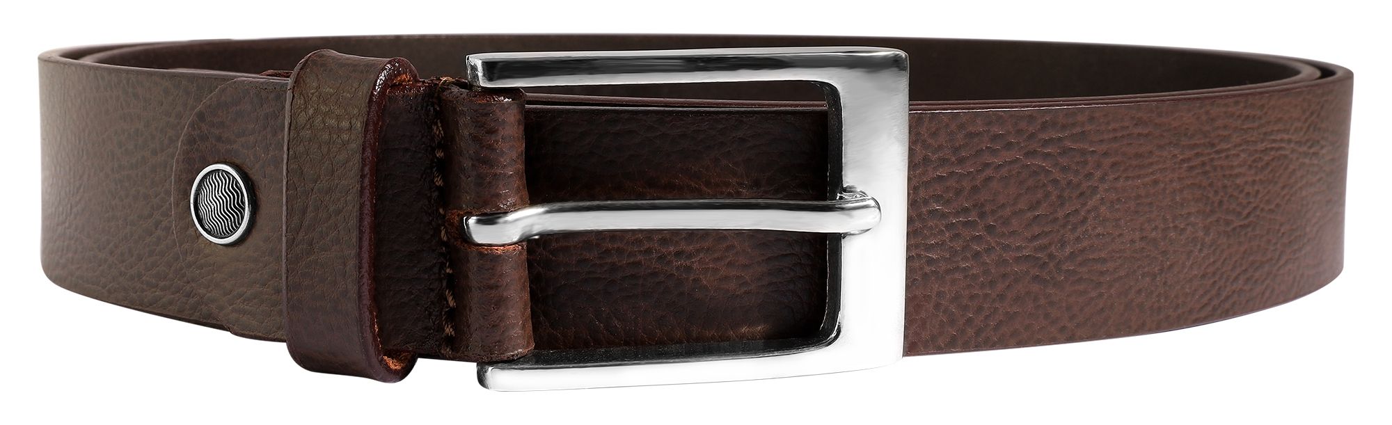 De donkerbruine riem van het merk Leonardo Verrelli is gemaakt van echt leer en heeft een gladde afwerking met een aangepaste nerf. Hij is verkrijgbaar in verschillende taillematen, is 3,5 cm breed en 0,3 cm dik. De gaten zitten 2 cm uit elkaar. Dit maakt de herenriem veelzijdig, omdat hij gemakkelijk door de conventionele riemlussen kan worden gehaald. Dankzij het hoogwaardige, natuurlijke materiaal is deze riem bijzonder robuust, duurzaam en scheurbestendig, waardoor het de ideale metgezel is voor alle gelegenheden. De metalen gesp wordt bevestigd met schroeven, waardoor de riem gemakkelijk kan worden ingekort en aangepast aan elke tailleomvang. De maat van de riem wordt aangegeven in taillebreedte, die 15 cm korter is dan de totale lengte.