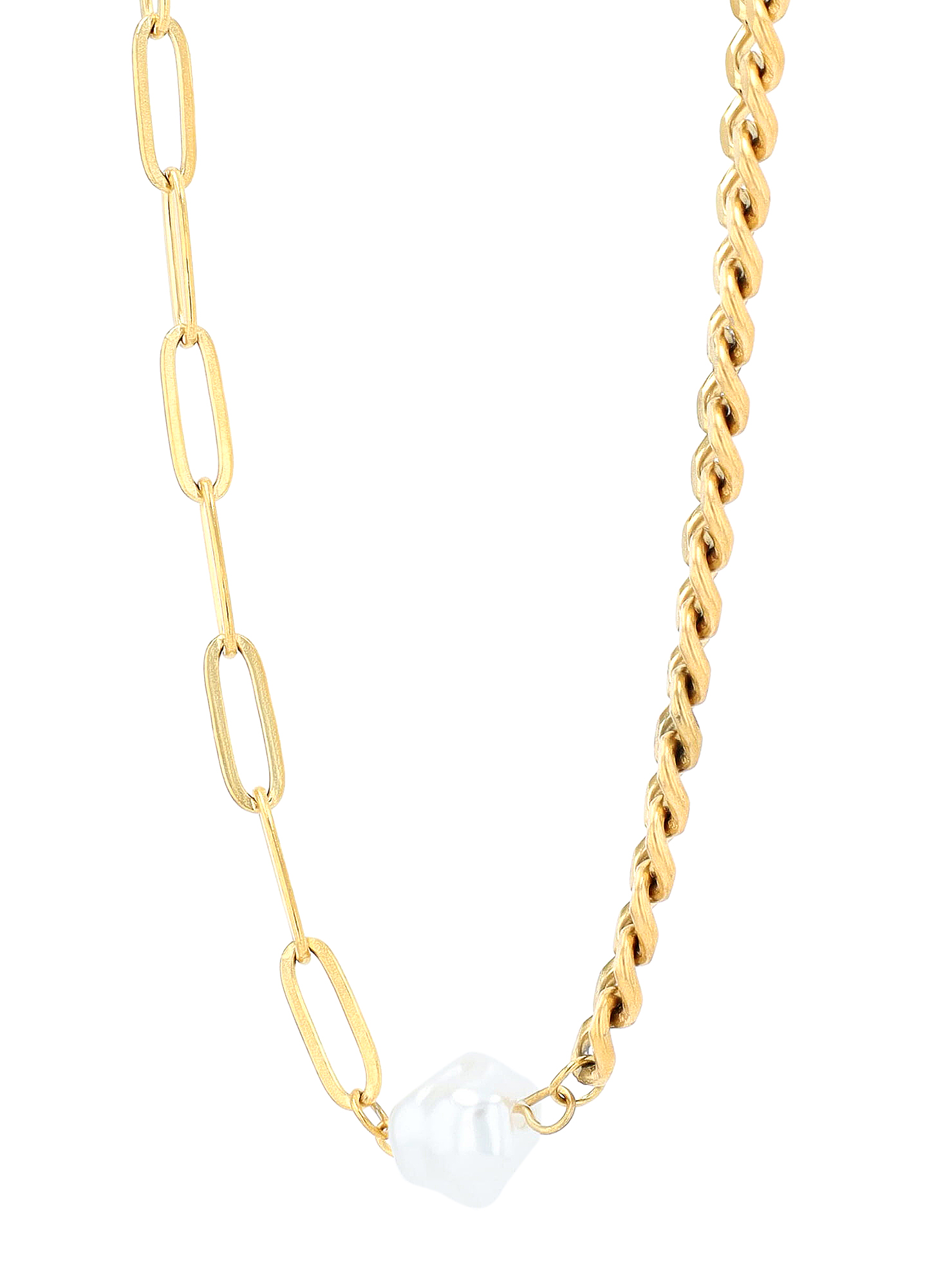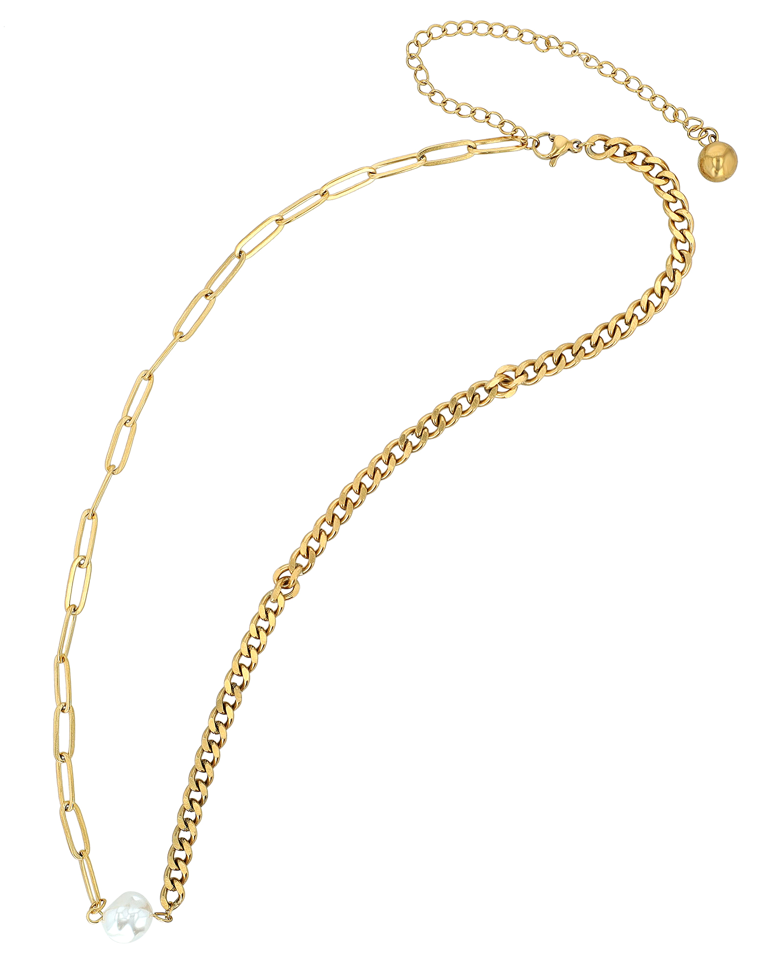 De tweedelige duo ketting combineert op harmonieuze wijze twee verschillende soorten schakels. De ene kant is voorzien van een klassieke, opvallende platte krulketting, terwijl de andere kant wordt gekenmerkt door opvallende, grove schakels (paperclipstijl). De twee kettingdelen worden gescheiden door een fijne, witte parel (Ø ca. 9 mm), die in het midden als verbindingselement fungeert. Met een basislengte van 45 cm en een royale verlenging van 10 cm kan de ketting aan elk decolleté worden aangepast.