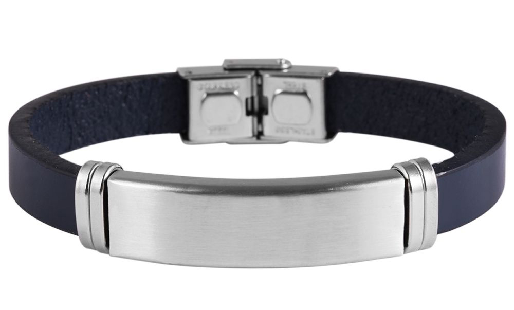 Productinformatie ""Lino", accentarmband, echt leer, graveerplaatje van roestvrij staal, blauw/zilverkleurig, 21 cm"
