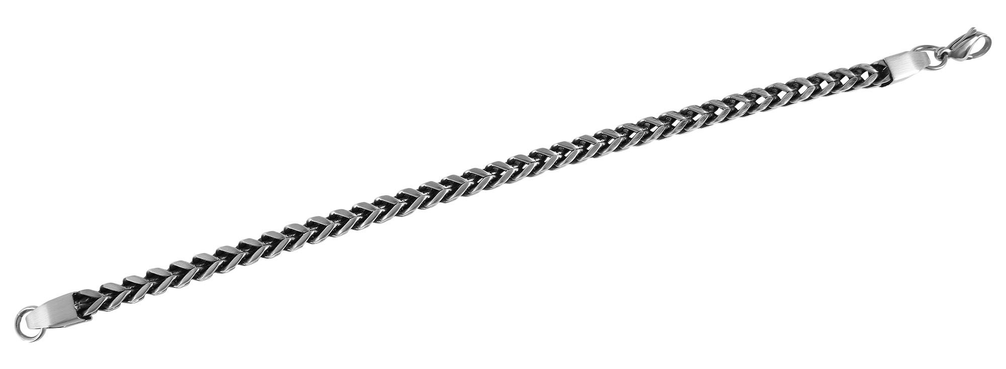 Deze solide gepantserde armband van hoogwaardig, geborsteld roestvrij staal combineert op vakkundige wijze kracht en stijl. De nauwkeurige afwerking en opvallende structuur met een breedte en hoogte van elk 5 mm maken het een echte blikvanger. De robuuste roestvrijstalen karabijnhaak zorgt voor een veilige en comfortabele pasvorm.