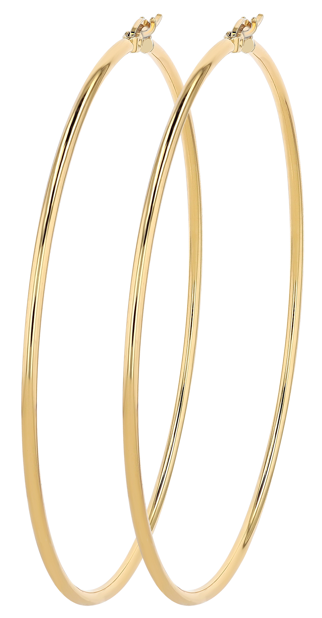 Deze hoogglanzende, goudkleurige oorbellen van robuust roestvrij staal zijn met een diameter van 70 mm en een dikte van 2 mm een echte blikvanger. Door het heldere ontwerp en de praktische roestvrijstalen sluiting zijn ze het ideale accessoire voor elke gelegenheid.