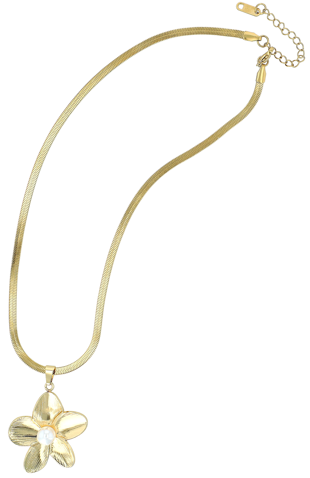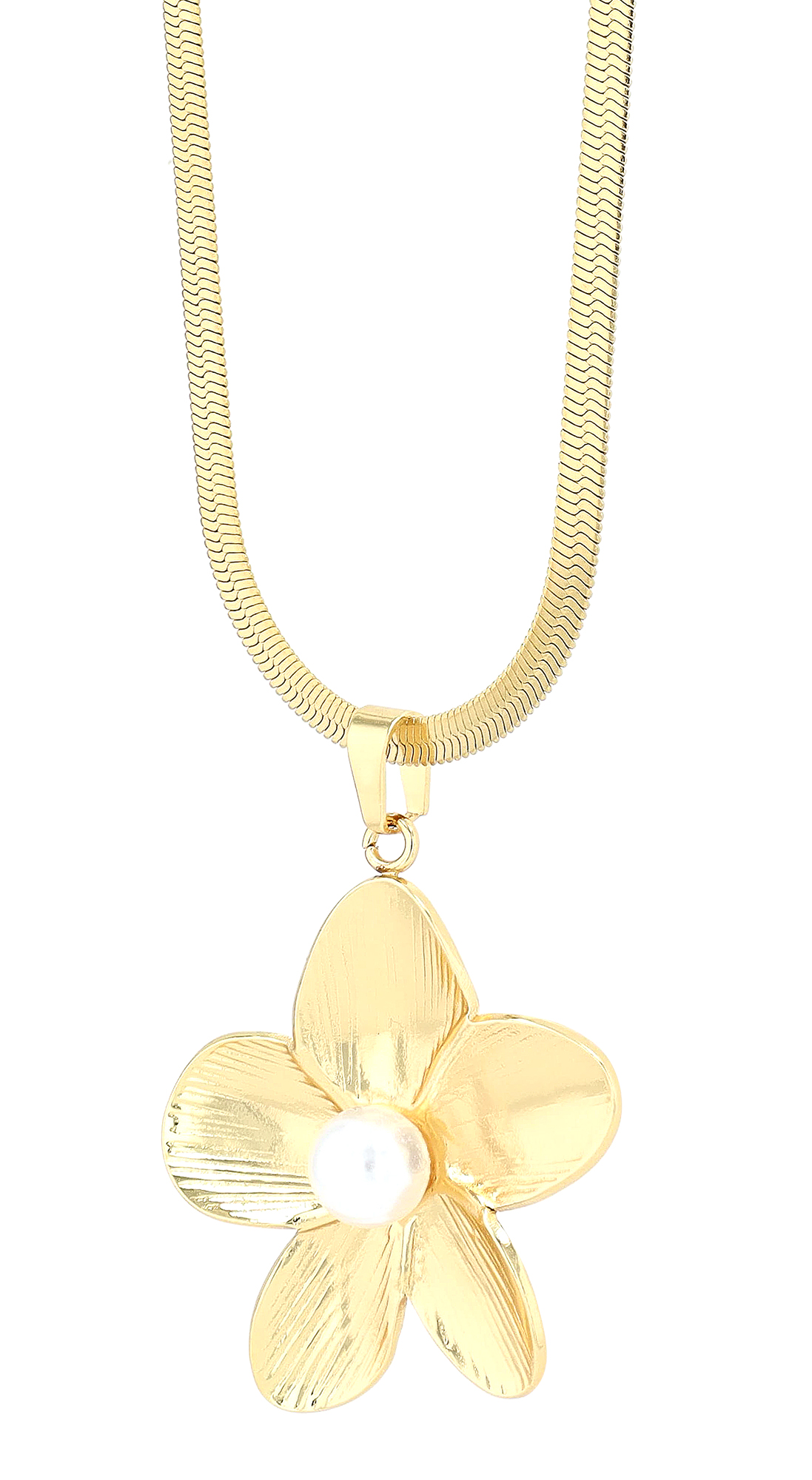 De platte slangenketting heeft een lengte van 40 cm en kan worden aangepast dankzij de verlenging van 5 cm. Hij hangt elegant en is voorzien van een indrukwekkende bloemenhanger (ca. 37 x 32 mm). Het middelpunt van de bloem is een glinsterende witte parel, die bijzonder elegant afsteekt tegen de goudkleurige, fijn gegroefde bloemblaadjes.