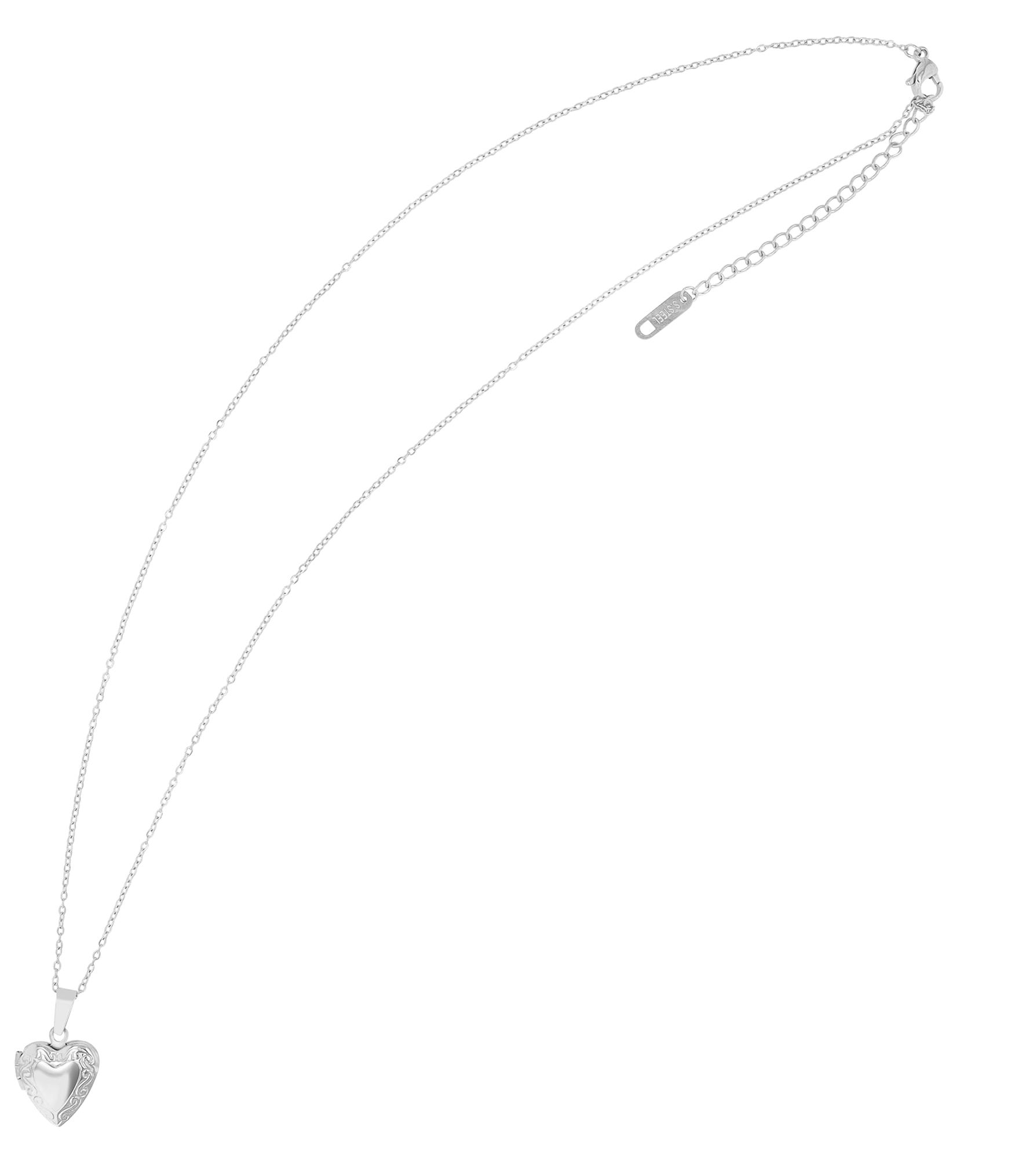 Deze ketting en de hanger zijn gemaakt van duurzaam roestvrij staal, waardoor ze slijtvast, duurzaam en extreem robuust zijn. De ketting is verkrijgbaar in zilver en goud, voor elke individuele smaak. Met een lengte van 43 cm en een extra verlengketting van 5 cm biedt dit collier de flexibiliteit om zich perfect aan te passen aan elke halsvorm. De praktische karabijnsluiting zorgt voor een veilige sluiting. Het scharnierende medaillon met een lengte van 1,5 cm en een totale lengte van 2 cm (met beweegbaar oogje) biedt ruimte voor persoonlijke herinneringen, of het nu een foto of een boodschap is. De gepolijste achterkant en een deel van de voorkant van de hanger kunnen worden gegraveerd met filigraanmotieven om dit sieraad een heel persoonlijk tintje te geven.