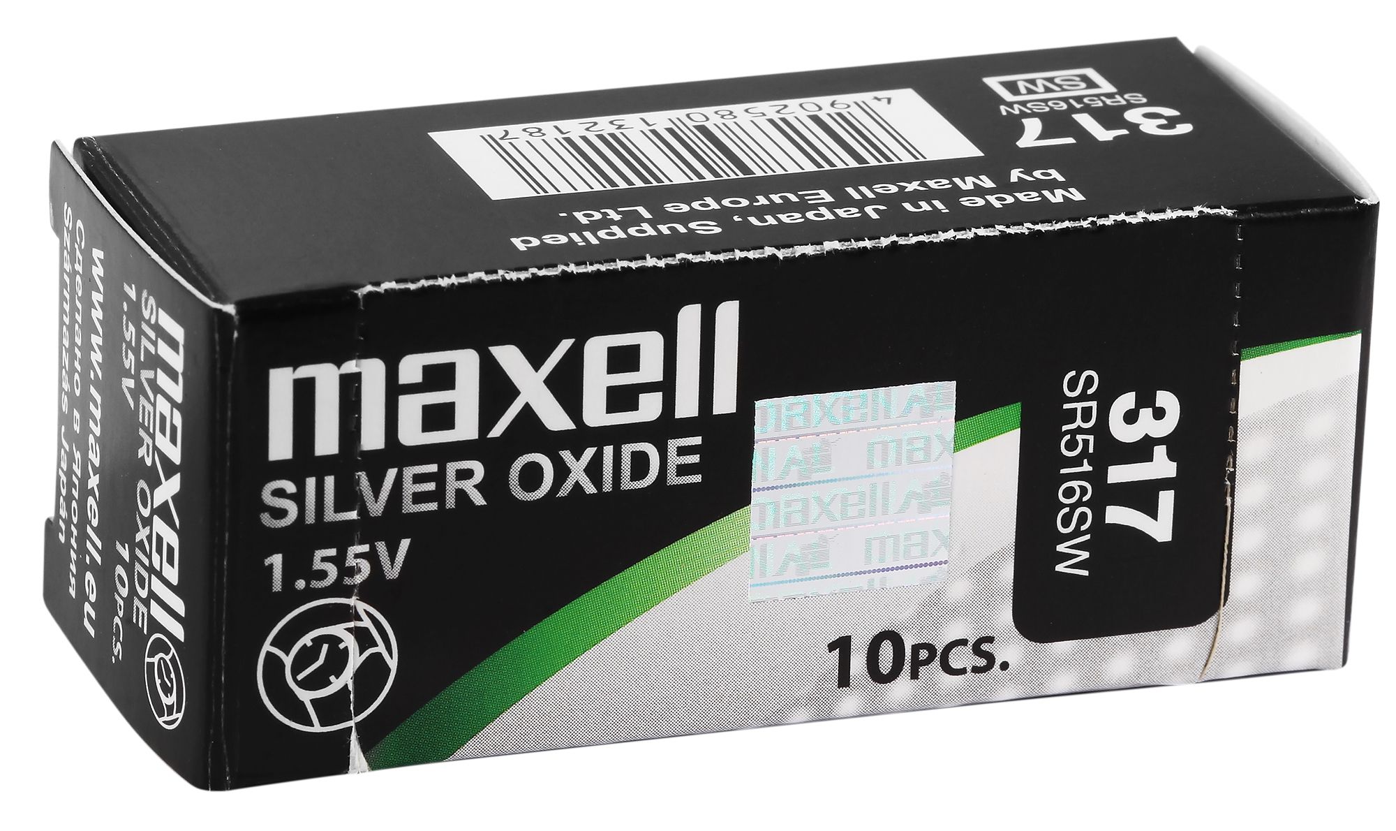 Knoopcellen nr. 317 van het merk Maxell voor horloges met 0% kwik in blisterverpakking van 10, individueel verpakt. Verschillende maten voor verschillende uurwerken. De elektrische spanning voor elke batterij is 1,55 V.