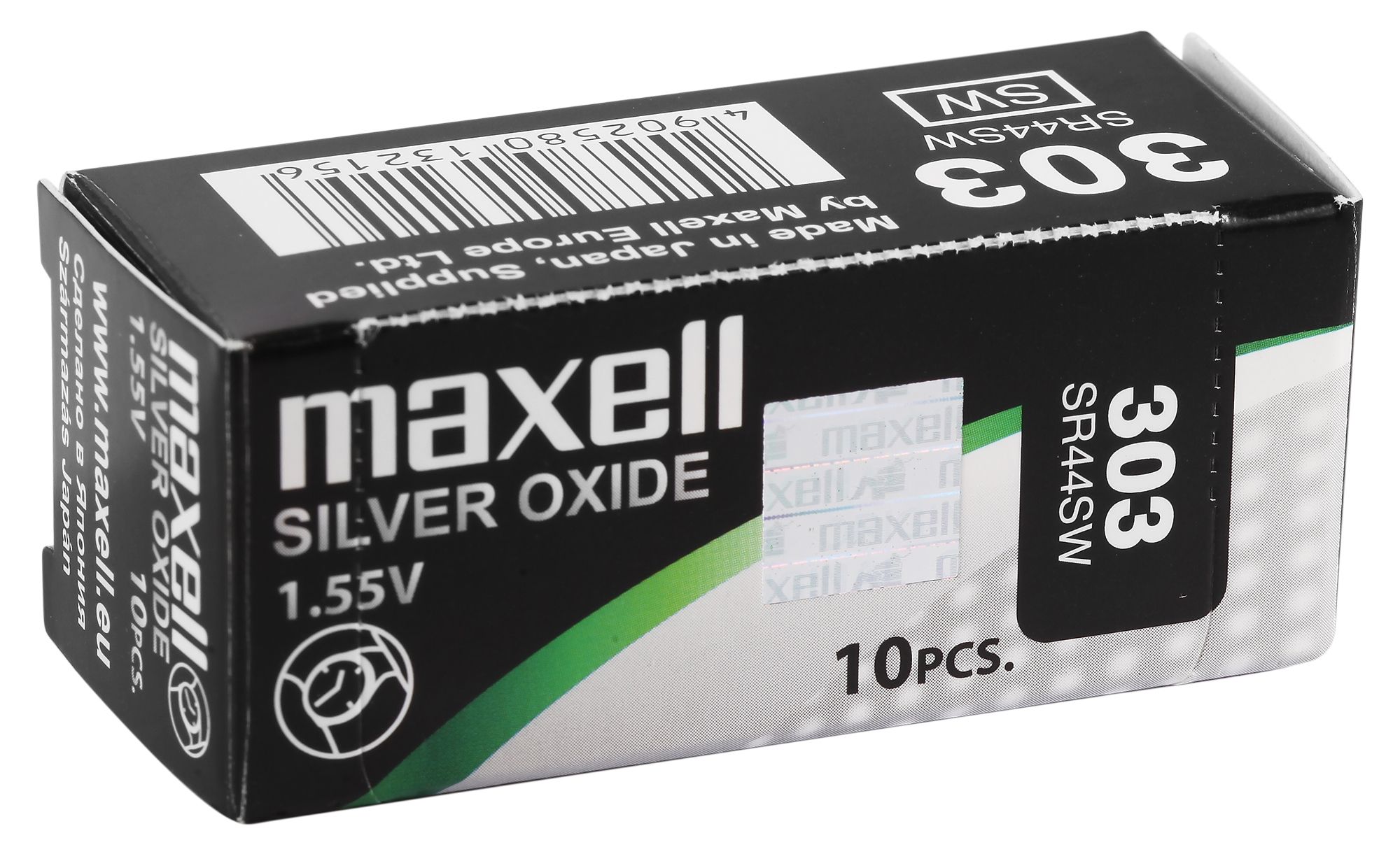Knoopcellen van het merk Maxell, nr. 303 voor horloges met 0% kwik in blisterverpakking van 10, individueel verpakt. Verschillende maten voor verschillende uurwerken. De elektrische spanning voor elke batterij is 1,55 V.
