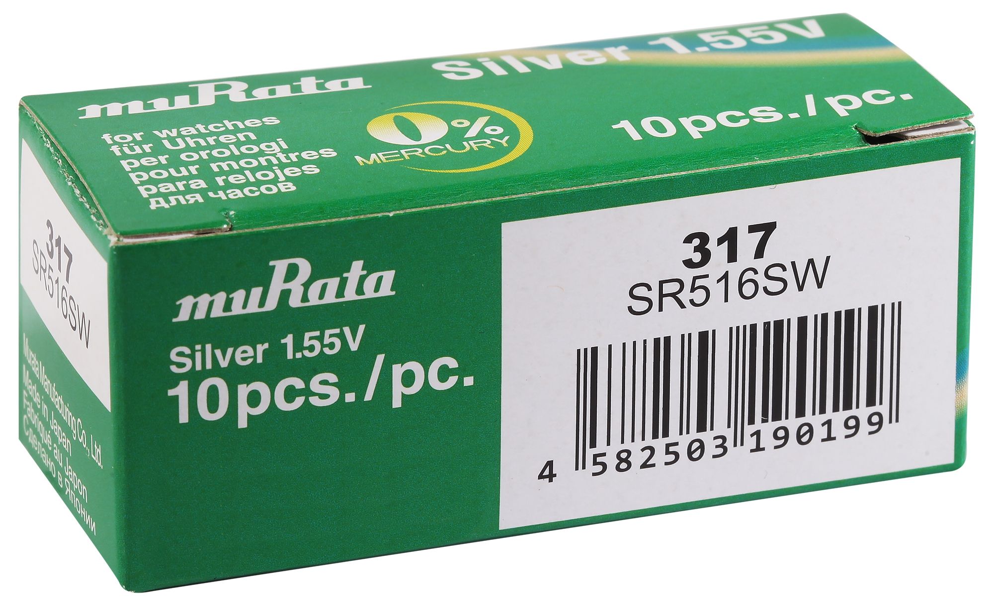 Knoopcellen nr. 317 van het merk Murata voor horloges met 0% kwik in blisterverpakking van 10, individueel verpakt. Verschillende maten voor verschillende uurwerken. De elektrische spanning voor elke batterij is 1,55 V.