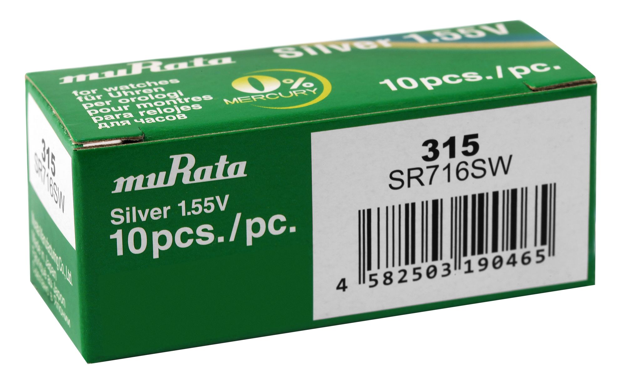 Knoopcellen nr. 315 van het merk Murata voor horloges met 0% kwik in blisterverpakking van 10, individueel verpakt. Verschillende maten voor verschillende uurwerken. De elektrische spanning voor elke batterij is 1,55 V.