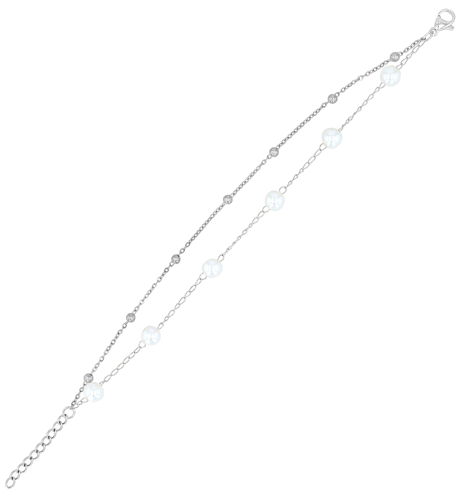 De twee perfect op elkaar afgestemde armbanden worden samengebracht om een gelaagde look te creëren met slechts één sluiting. De ene ketting is versierd met zes glanzende glazen kralen (Ø 5,5 mm), die gelijkmatig verdeeld zijn en een vrouwelijke glans creëren. De tweede ketting is versierd met vijf kleinere roestvrijstalen kralen (Ø 3,5 mm), die het ontwerp perfect afronden.