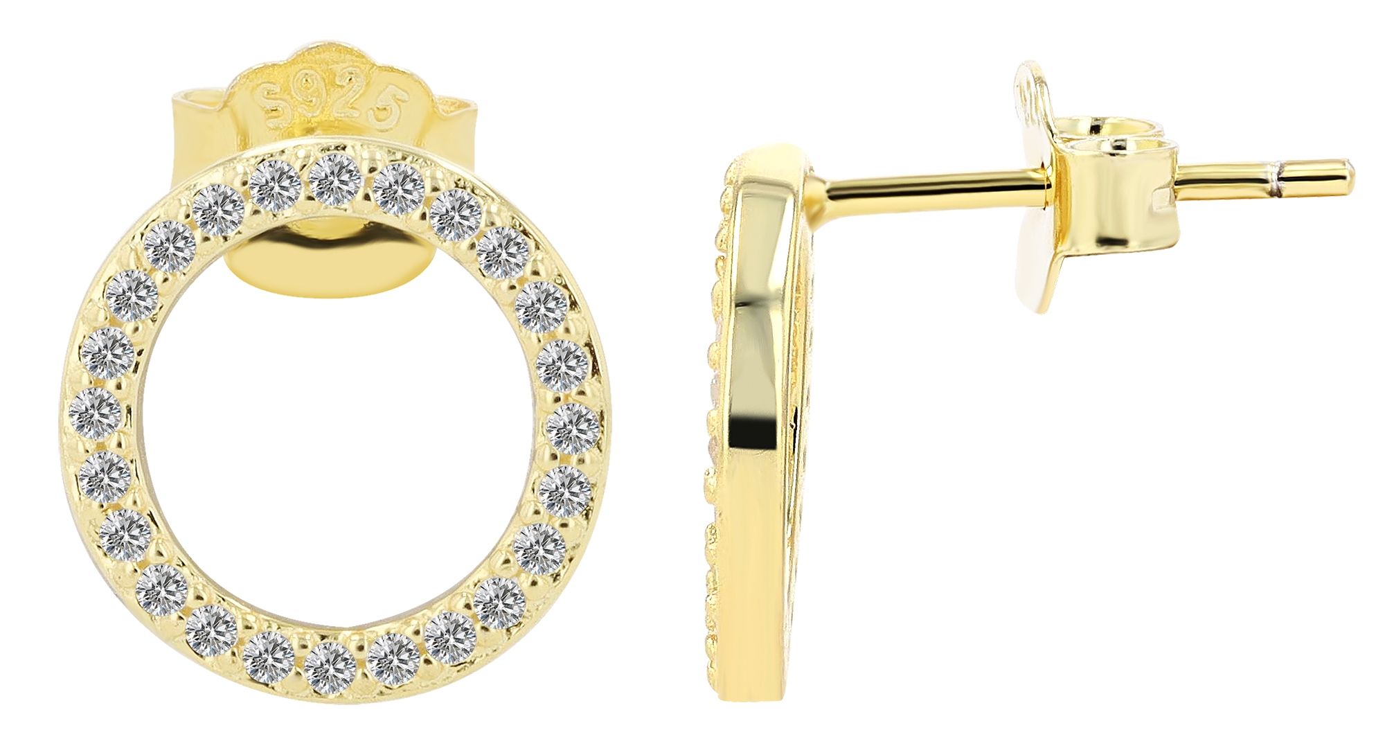 - Variant 1: Een vergulde open cirkel versierd met fonkelende witte zirkonia. Dit luxueuze ontwerp voegt een vleugje glamour en elegantie toe aan elke outfit.