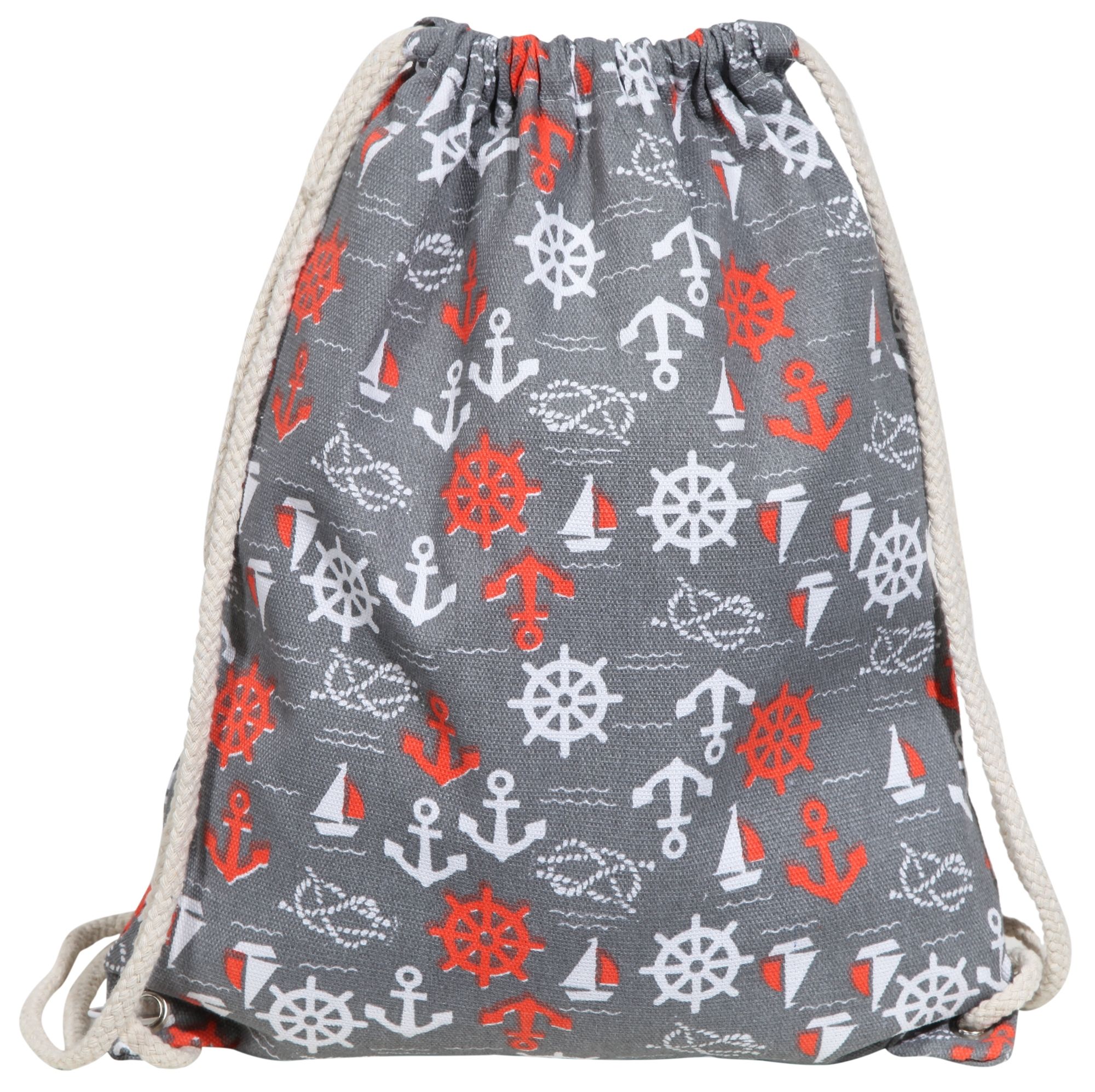 De maritieme sporttas is gemaakt van textiel en kan eenvoudig worden geopend en gesloten met twee gevlochten koorden door er simpelweg aan te trekken. De slijtvaste tas biedt veel opbergruimte. De maritieme symbolen zoals een anker, een scheepsrad, een zeilboot of een scheepstouw op beide zijden van het materiaal maken van de rugzak een echte blikvanger. De afmetingen van het item zijn: lengte 41 cm, breedte 32 cm en hoogte 3 mm. De maritieme gymtas is grijs en versierd met rood/witte symbolen.