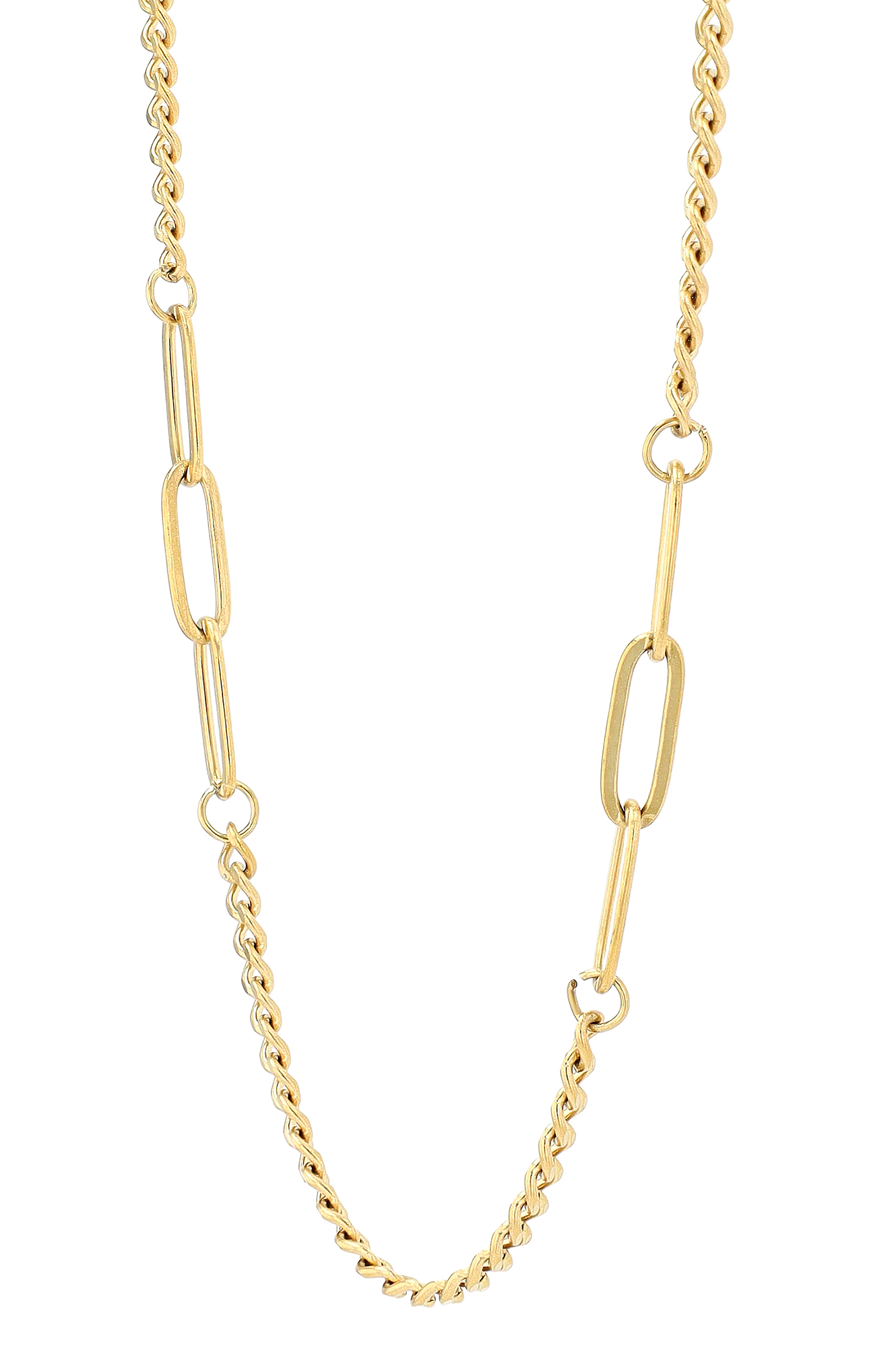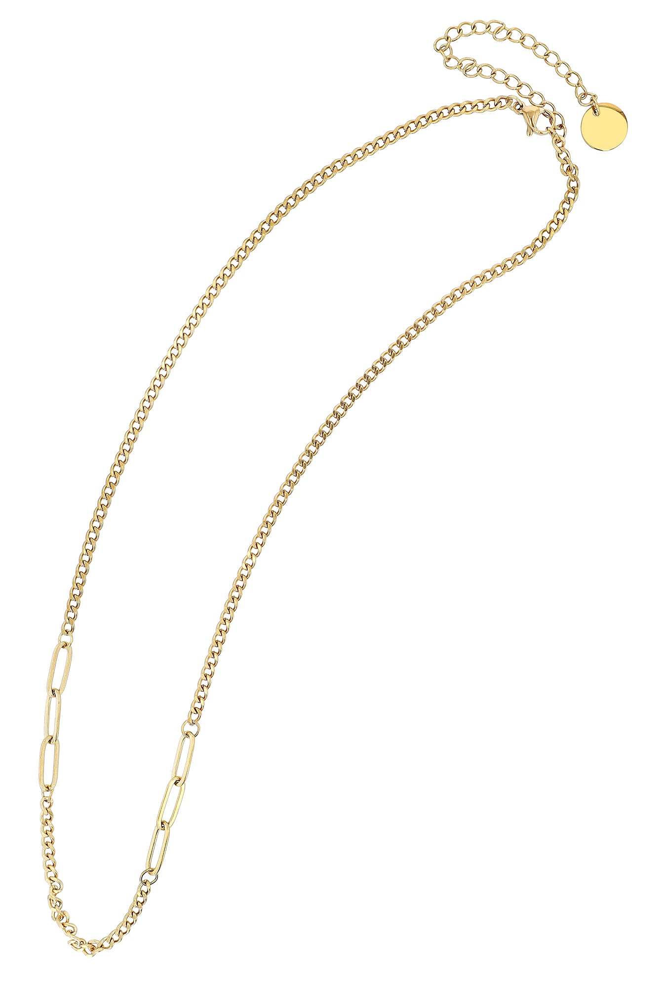 Het collier in een trendy duo-design, waarbij een klassieke platte krulketting samenkomt met twee bewust geplaatste delen met grovere schakels, wat het collier een moderne en dynamische uitstraling geeft. Met een basislengte van 45 cm en een royale verlenging van 8 cm kan de ketting flexibel worden aangepast aan elk decolleté.