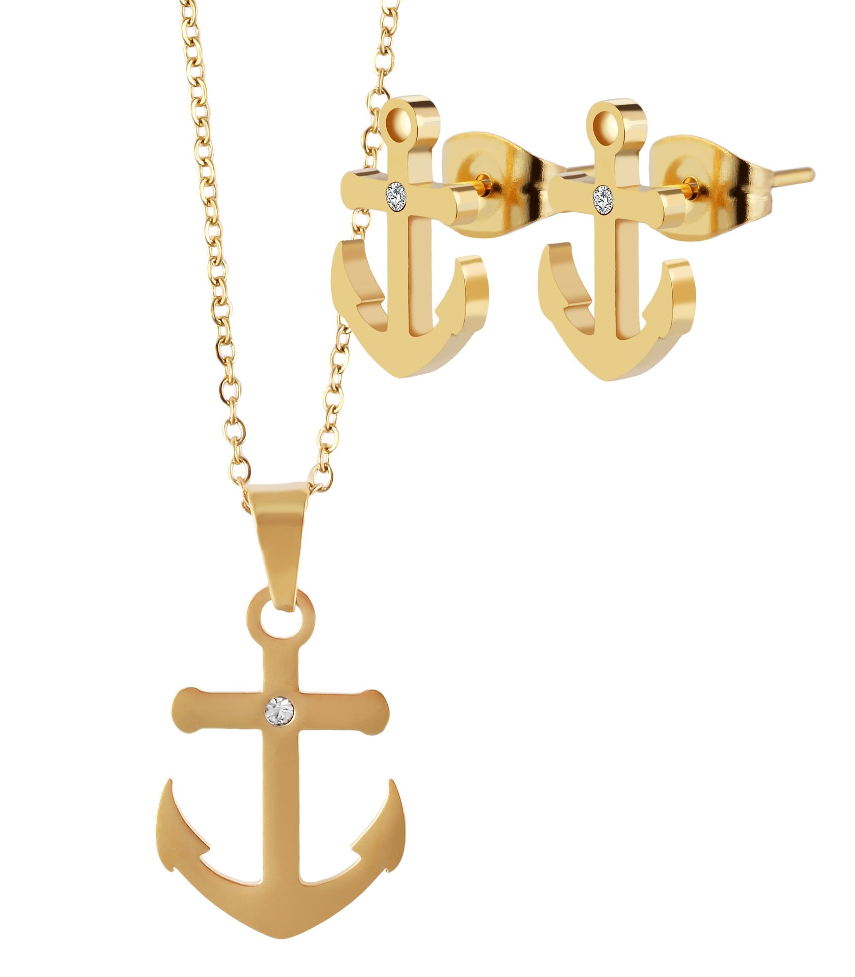 De goudkleurige sieradenset, bestaande uit oorstekers en een bijpassende hanger met ketting in een maritiem ankerontwerp, is gemaakt van roestvrij staal en heeft een IPG-coating. De oorstekers in het populaire ankermotief zijn elk versierd met een witte similietsteen. Ze zijn 12 mm lang, 8,5 mm breed en 1,5 mm dik. De oorbellen kunnen met een vleugelschroef aan het oorgat worden bevestigd. De siliconen oorknop zorgt voor extra houvast. De bijpassende hanger met een ketting van 43 cm, die nog eens met 5 cm verlengd kan worden, kan heel goed gecombineerd worden met de anker oorstekers. De ankerhanger is ook versierd met een witte similietsteen. De maat resulteert in een lengte van 23 mm, een breedte van 16 mm en een dikte van 1,5 mm. De sieradenset is een geweldige allround blikvanger en ook een uitstekend cadeau.