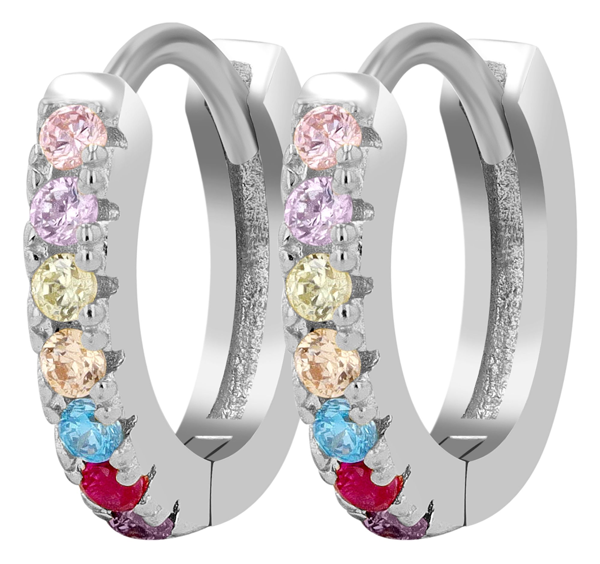 Variant 4 - presenteert zich in een elegante gerhodineerde zilverkleur en is ook versierd met elk 7 gekleurde zirkonia steentjes. Deze versie combineert tijdloze elegantie met een vleugje speelsheid en is perfect voor iedereen die zich graag van zijn levendige kant laat zien.