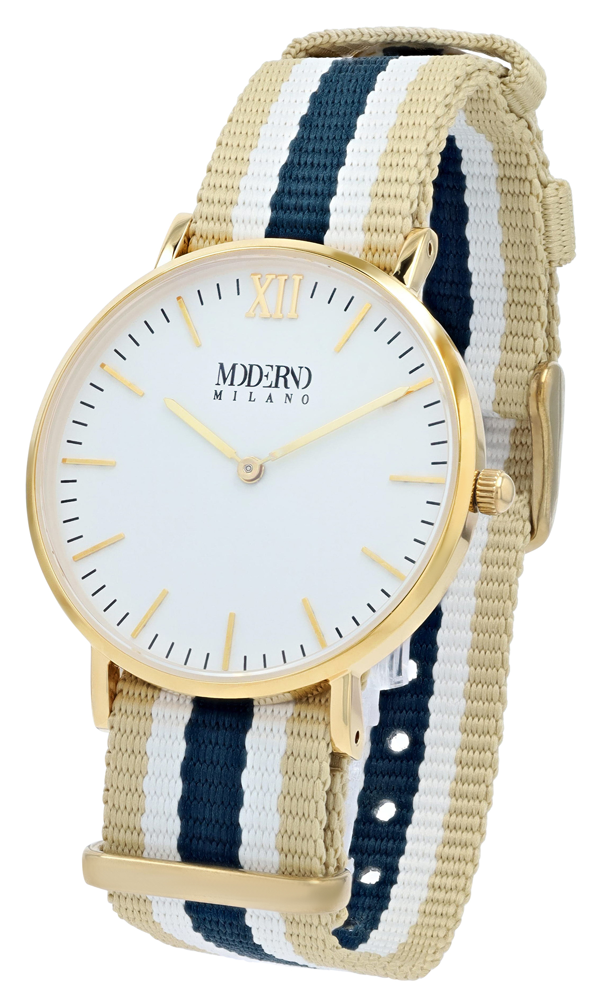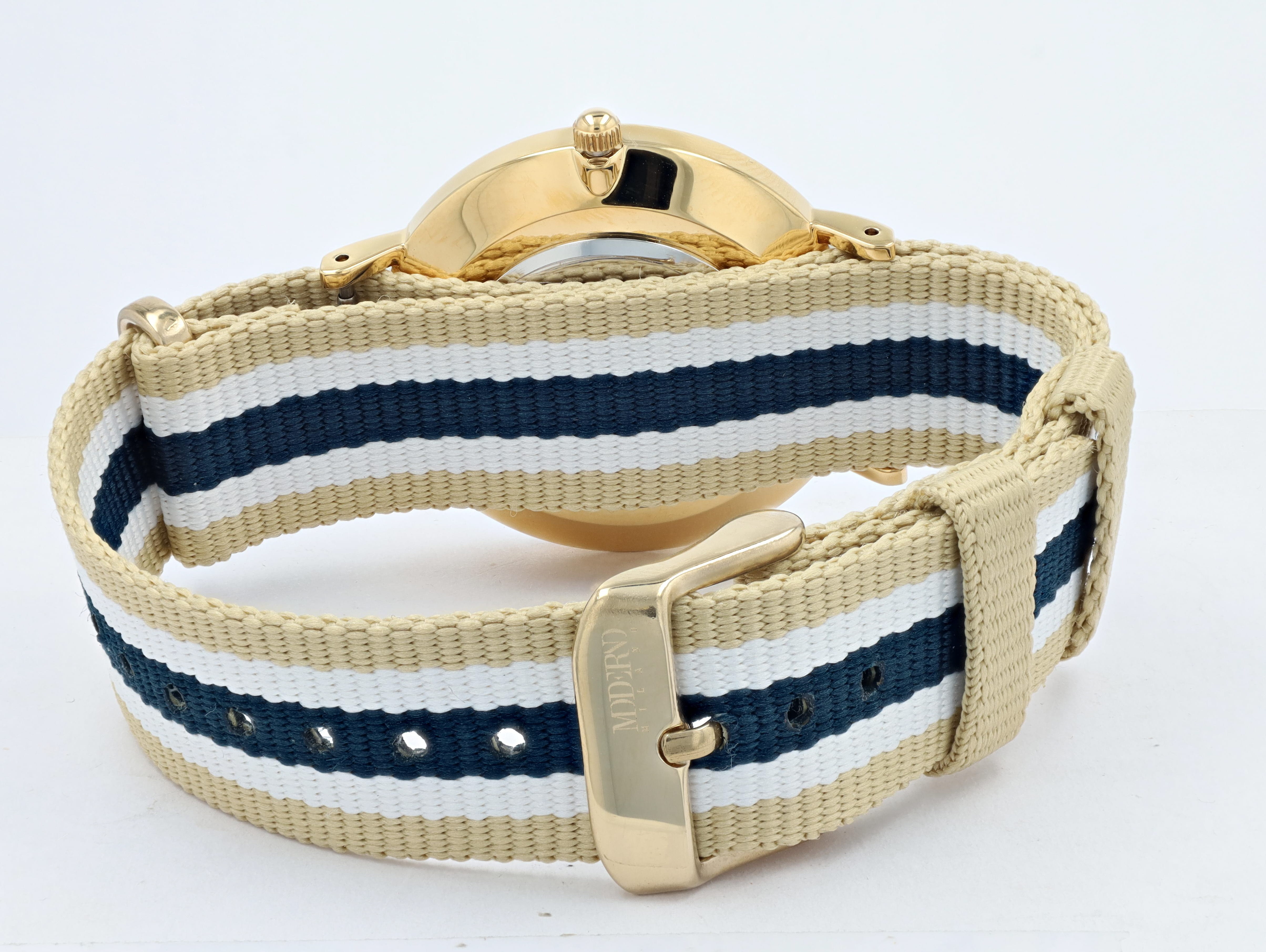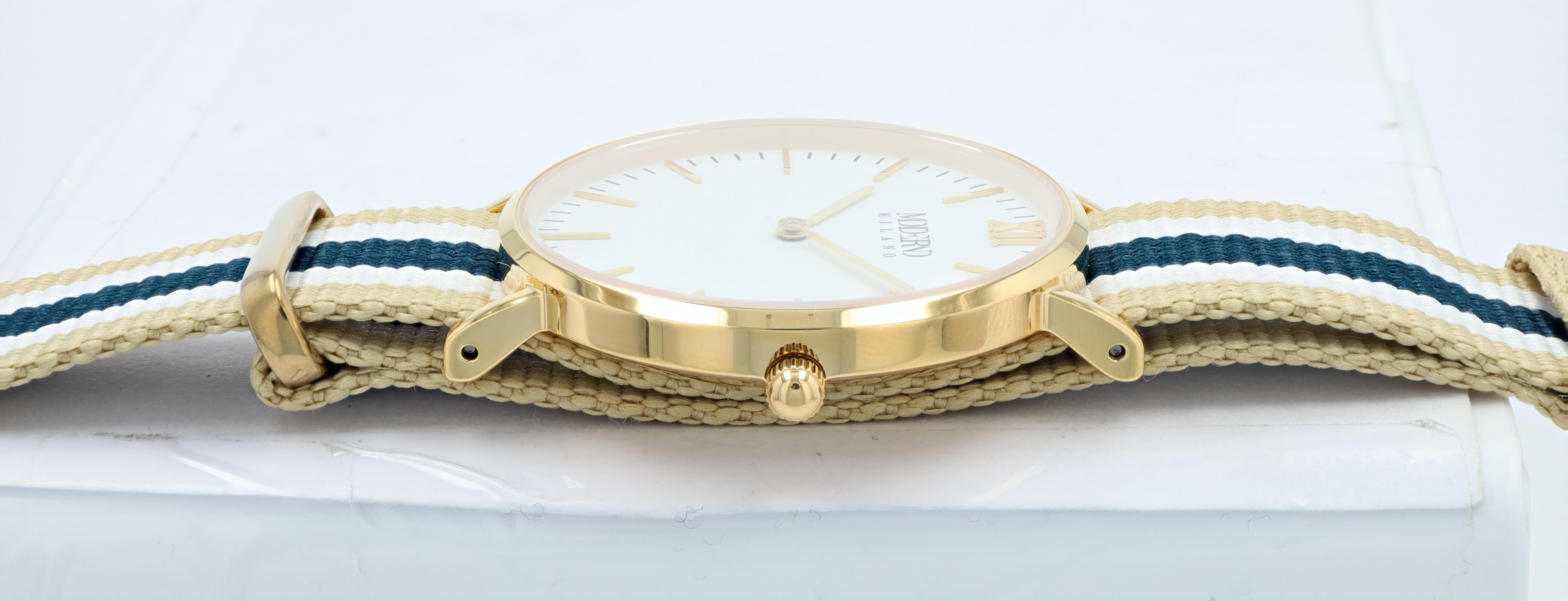 Productinformatie "Moderno Milano Edelstahl Damenuhr 36,5 mm, Saphirglas & Nylon-NATO-Band (Blau-Beige-Weiß), goldfarben"