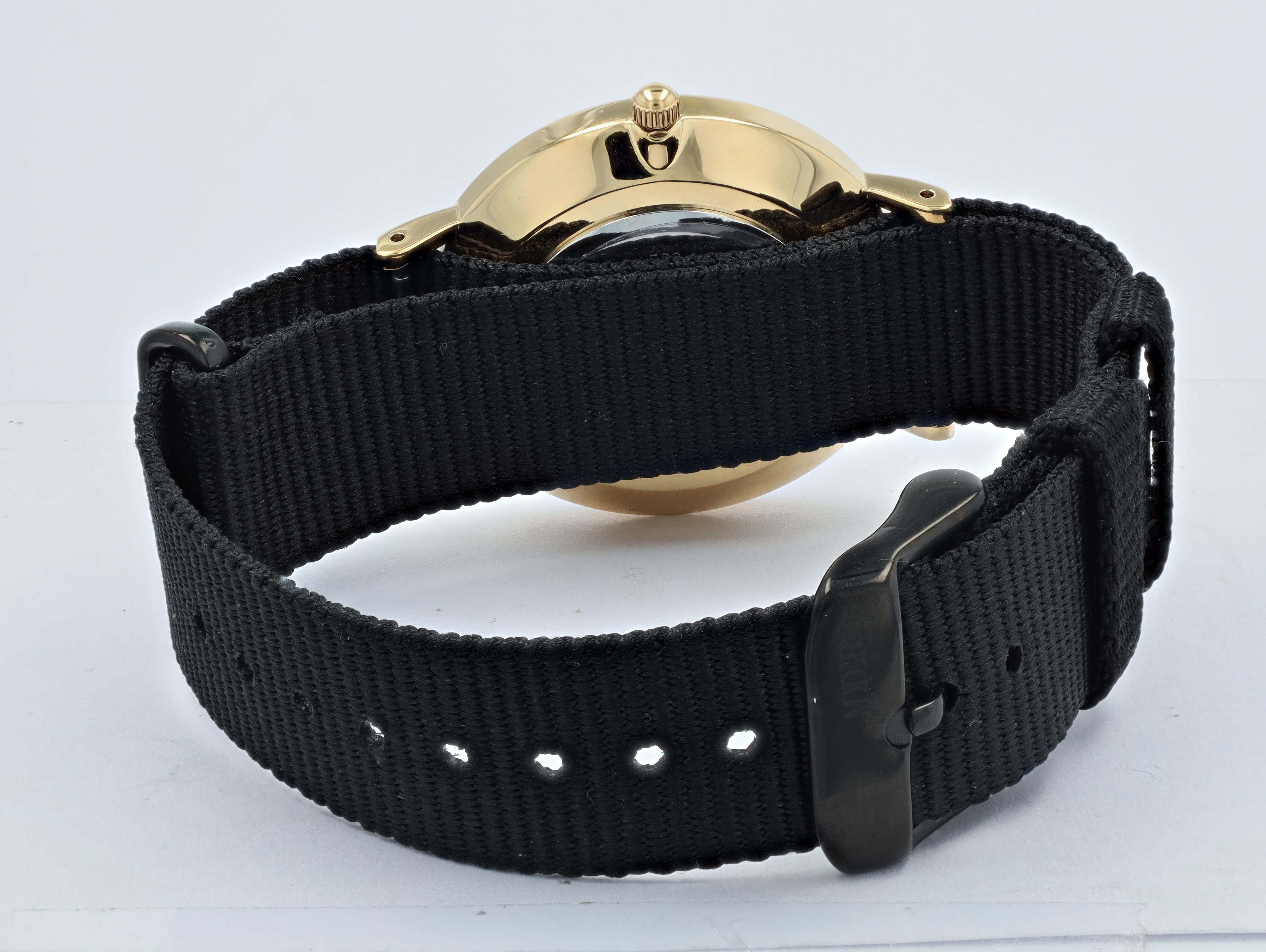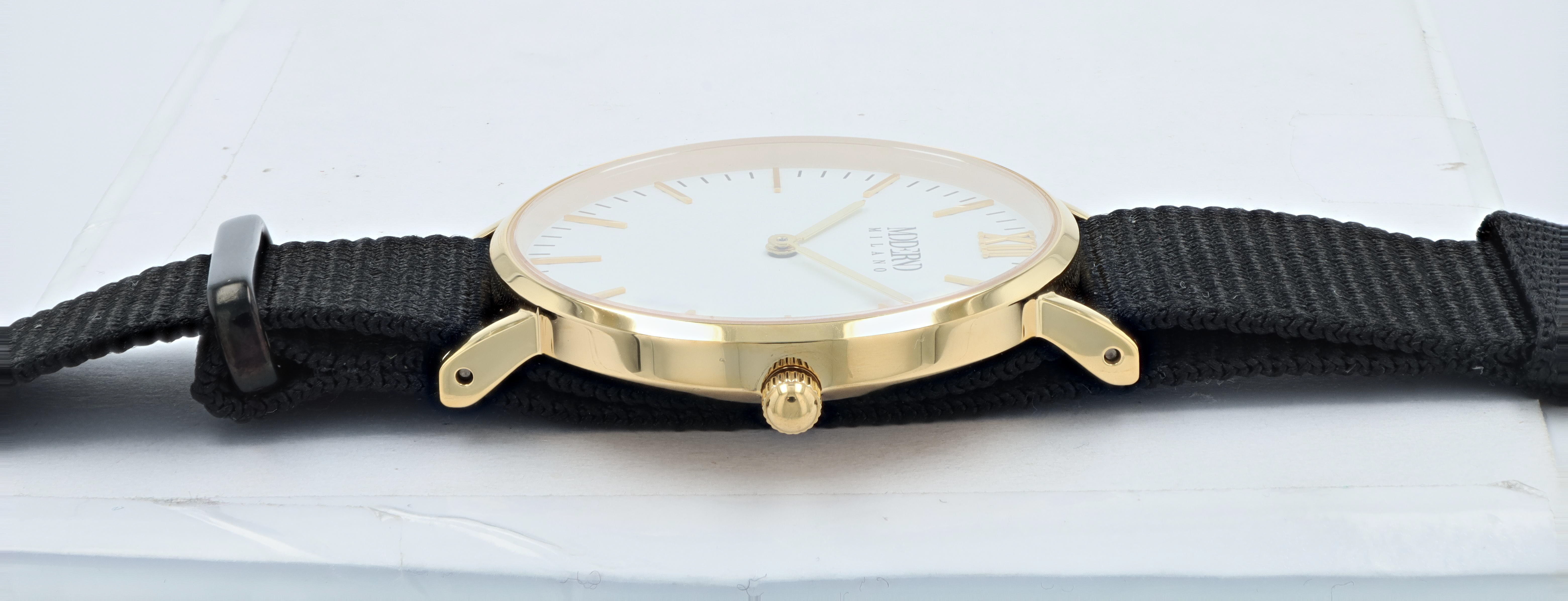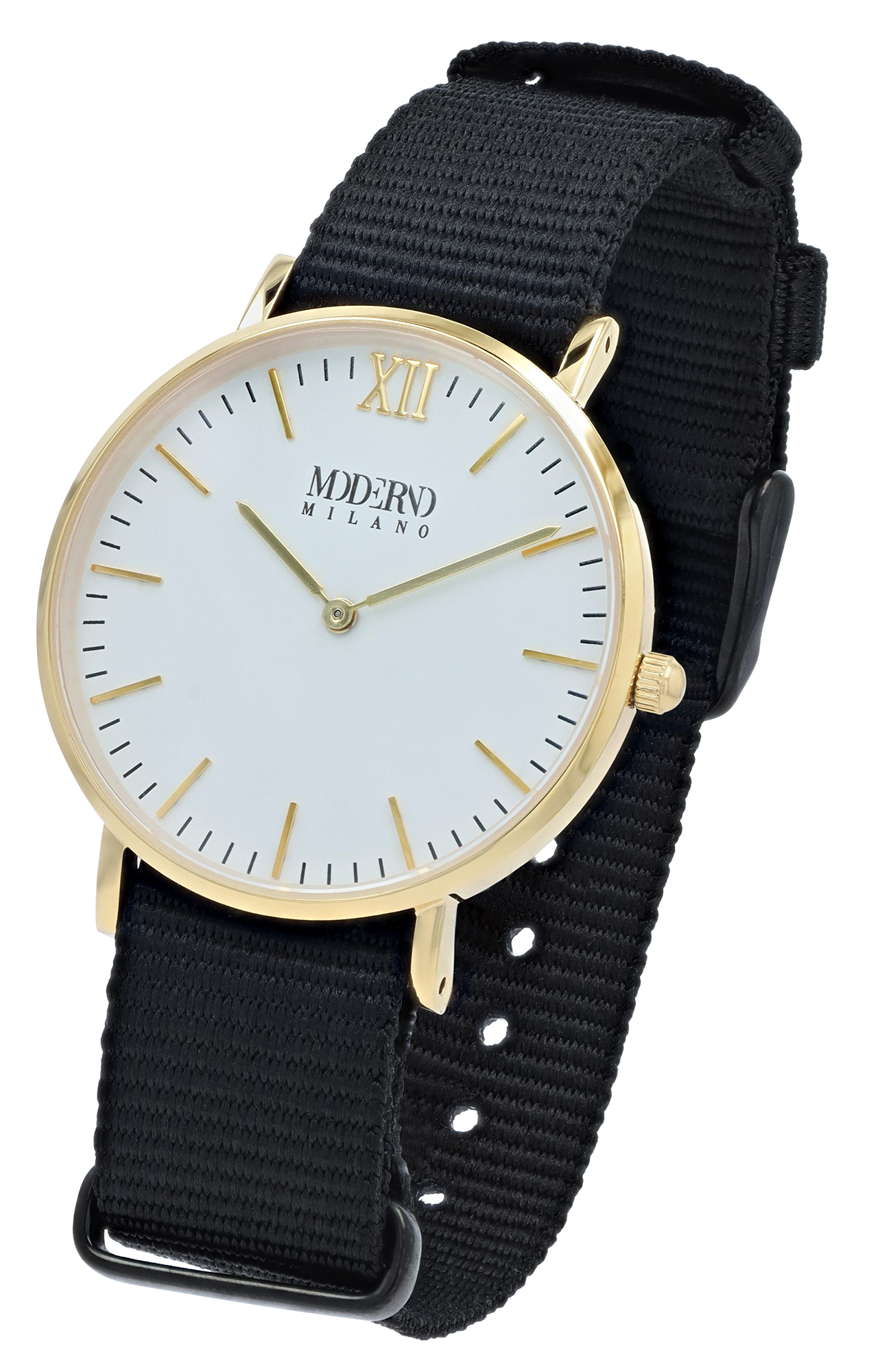 Productinformatie "Moderno Milano Edelstahl Damenuhr 36,5 mm, Saphirglas & Nylon-NATO-Band (Schwarz), goldfarben"