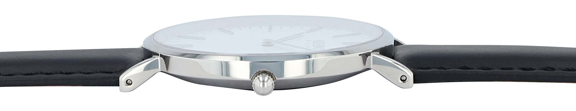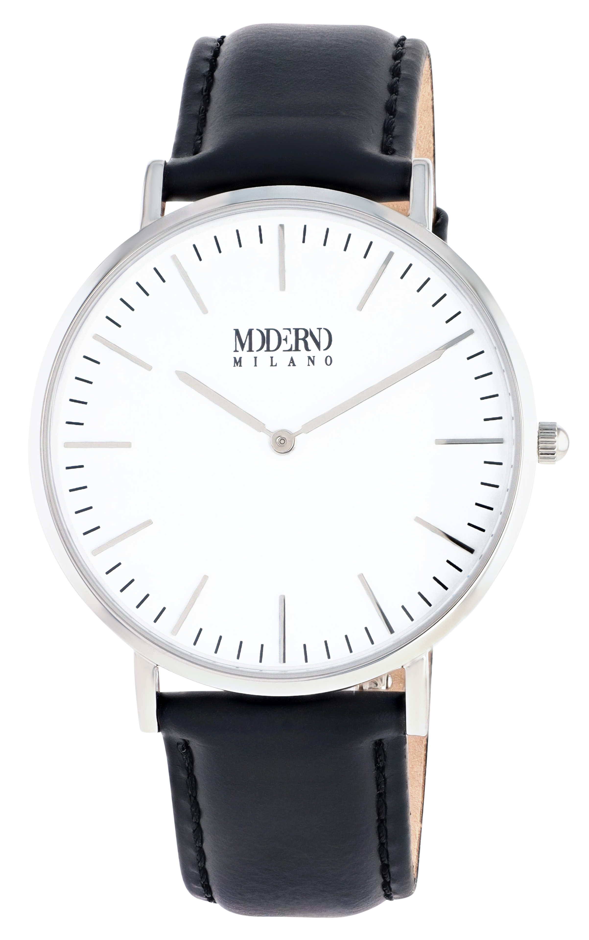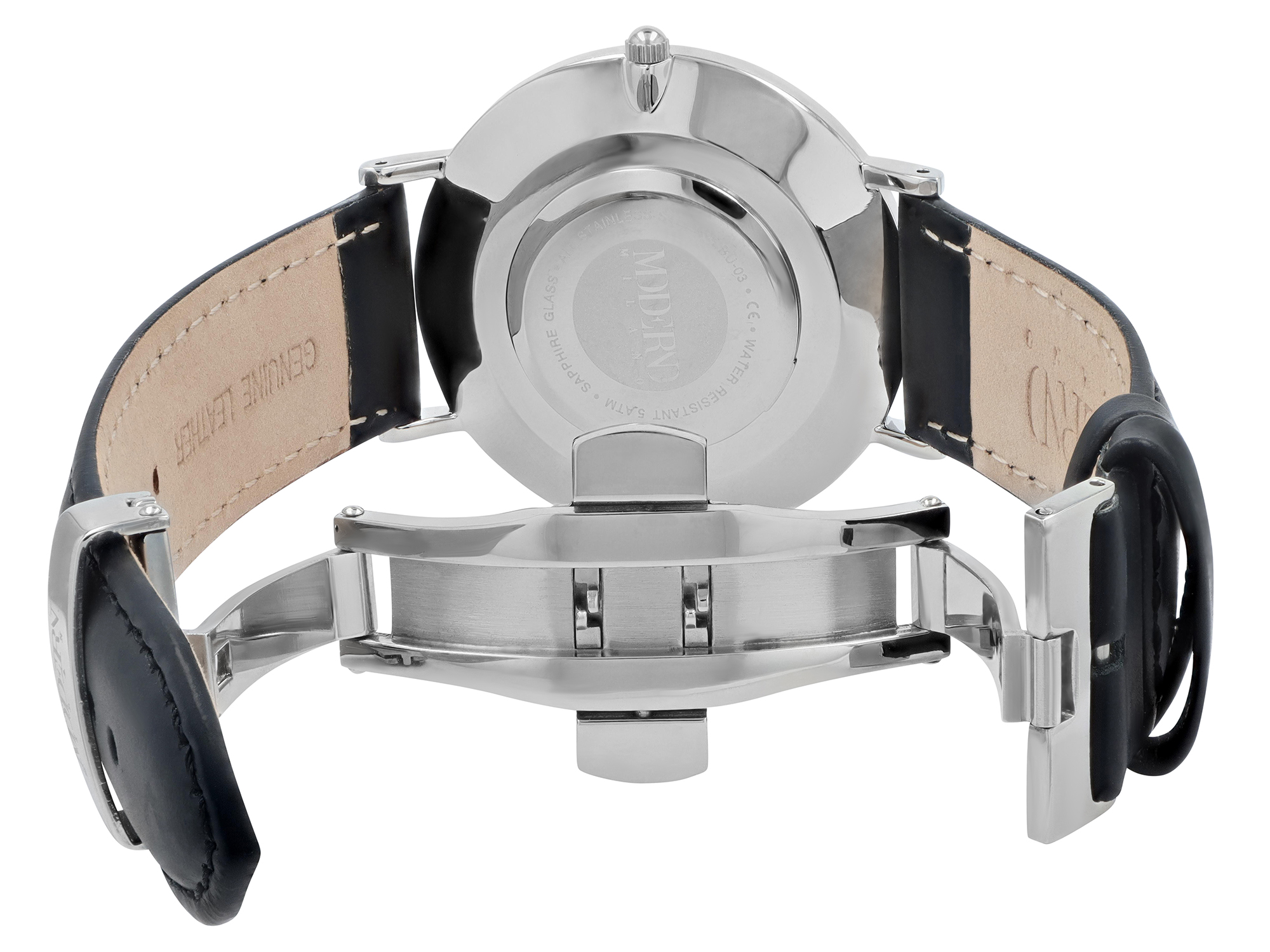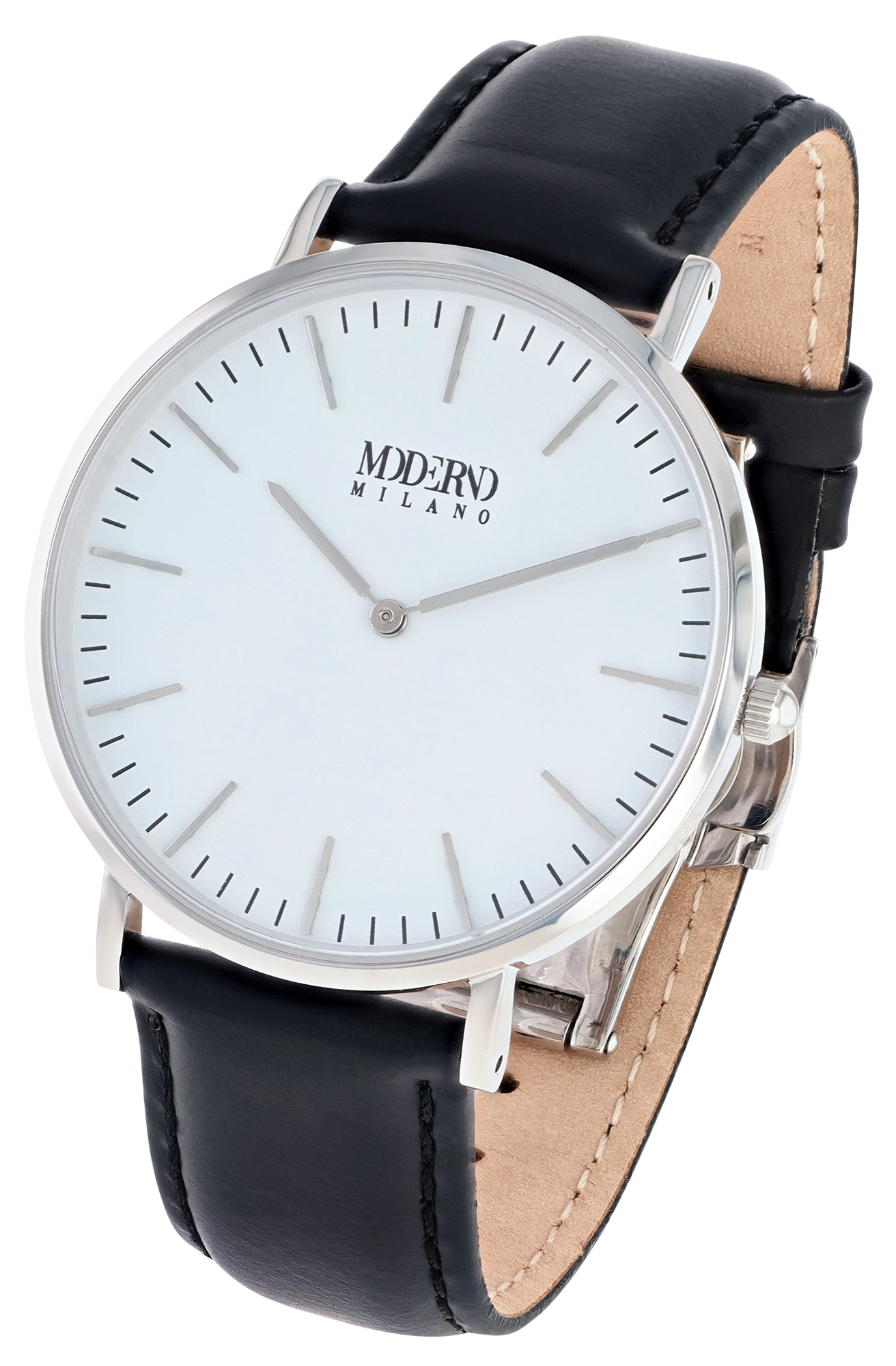 Productinformatie "Moderno Milano Edelstahl Herrennuhr Ø 41 mm, Echtlederband, Saphirglas, schwarz/ silberfarben"