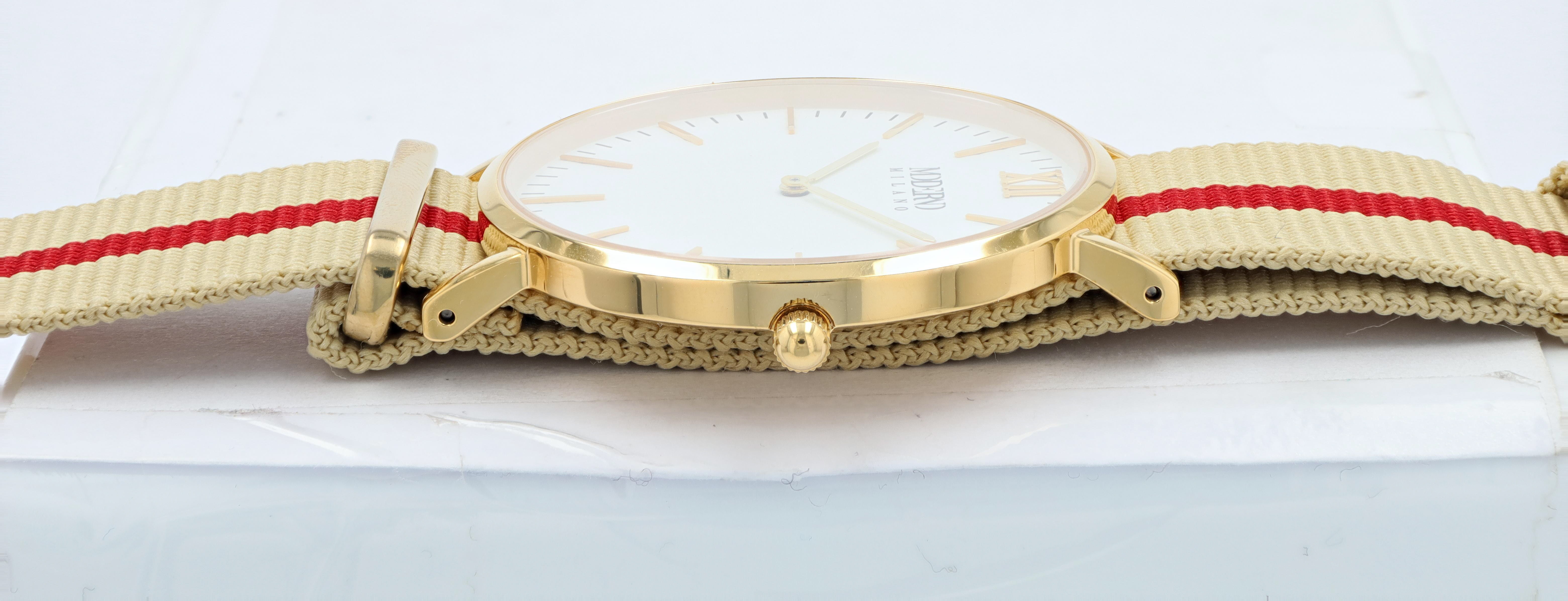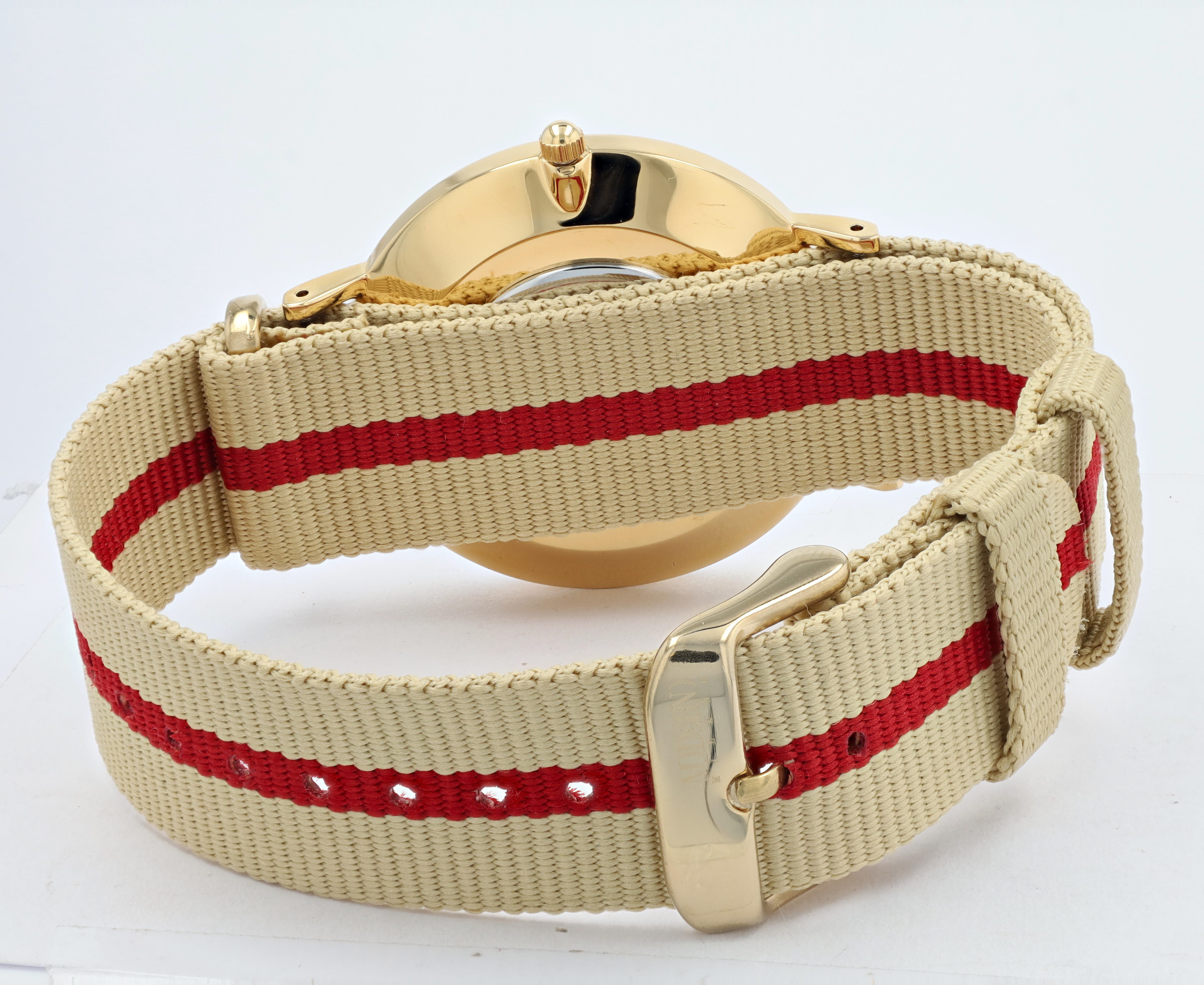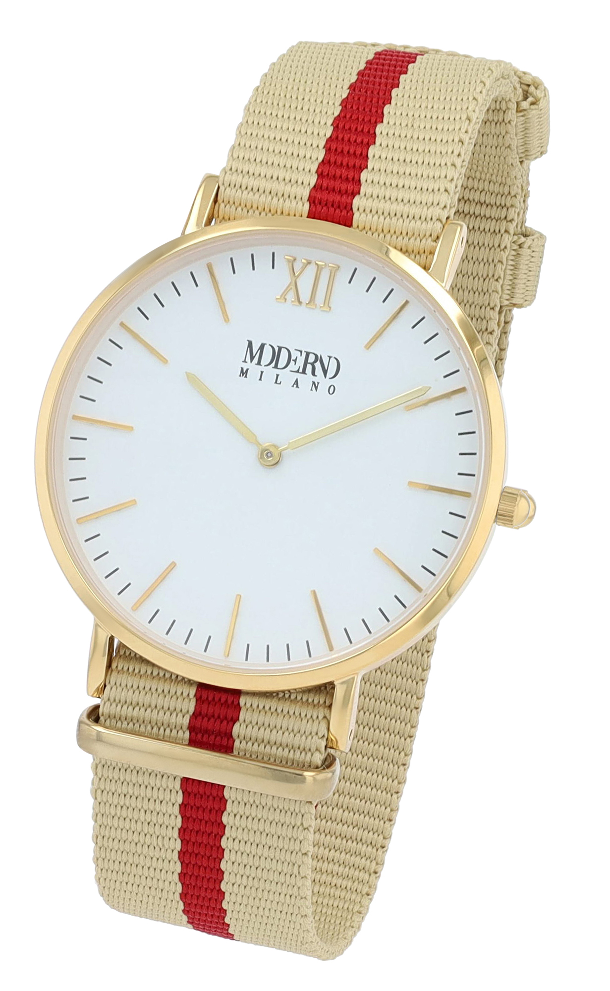 Productinformatie "Moderno Milano Edelstahl Herrenuhr 41 mm, Saphirglas & Nylon-NATO-Band (beige-rot), goldfarben"