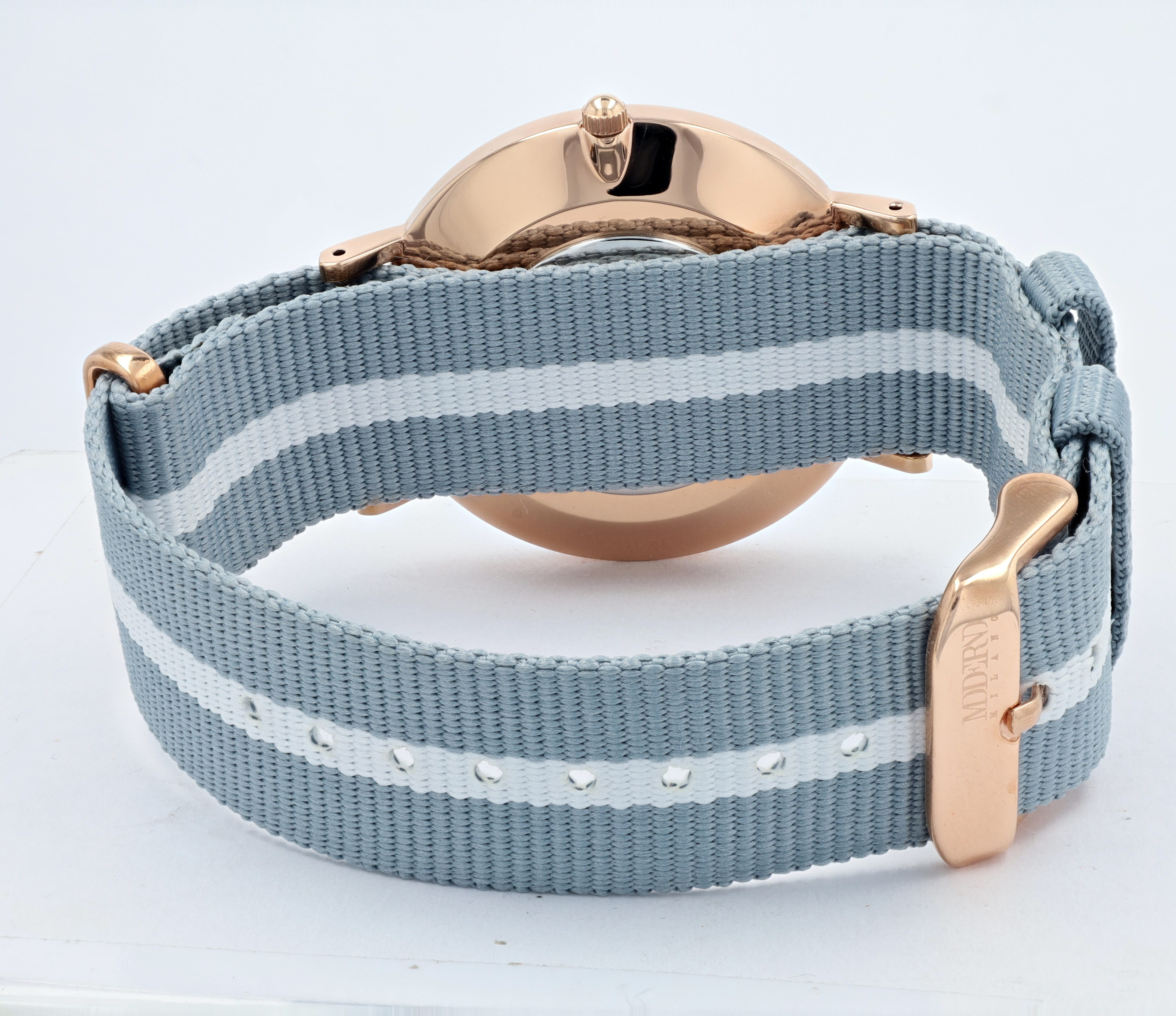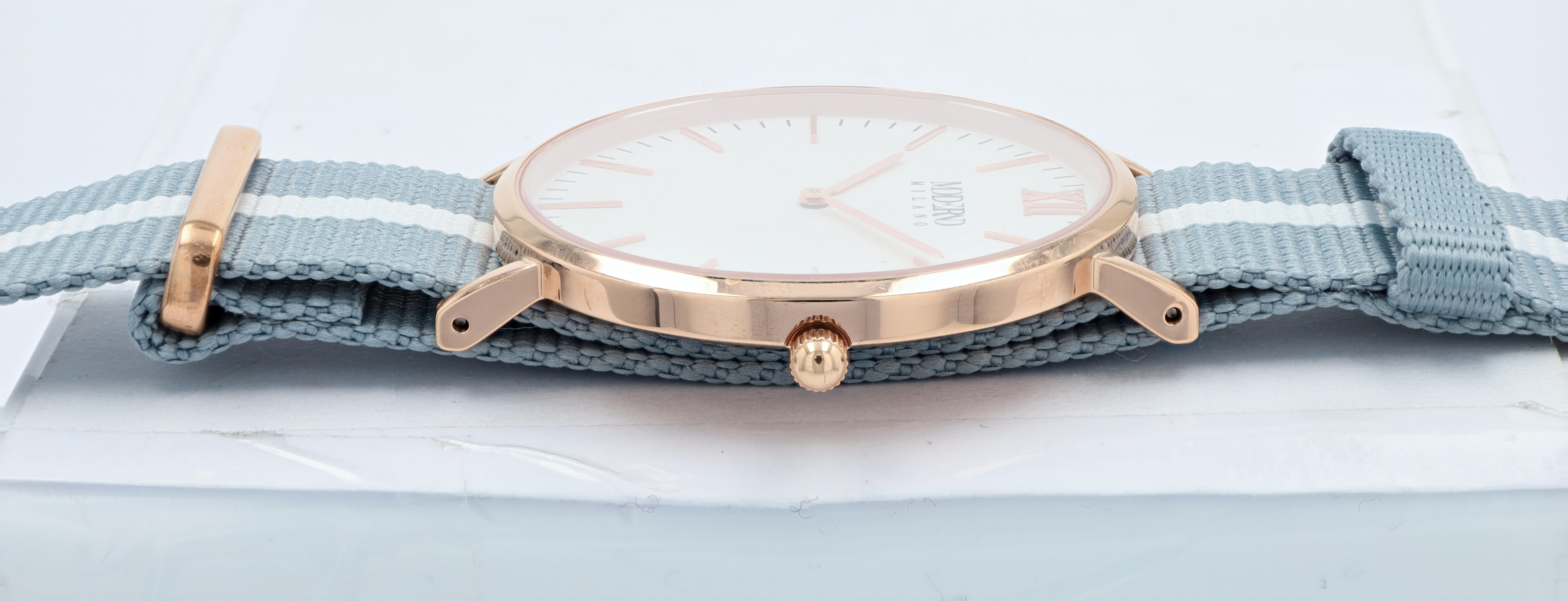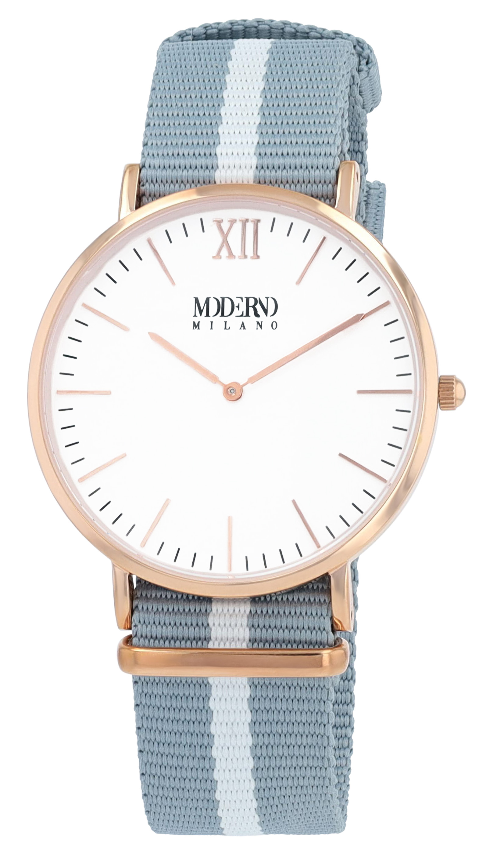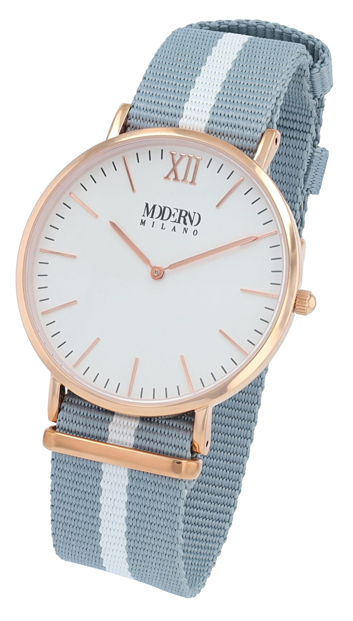 Productinformatie "Moderno Milano Edelstahl Herrenuhr 41 mm, Saphirglas & Nylon-NATO-Band (hellblau-weiß), rosegoldfarben"