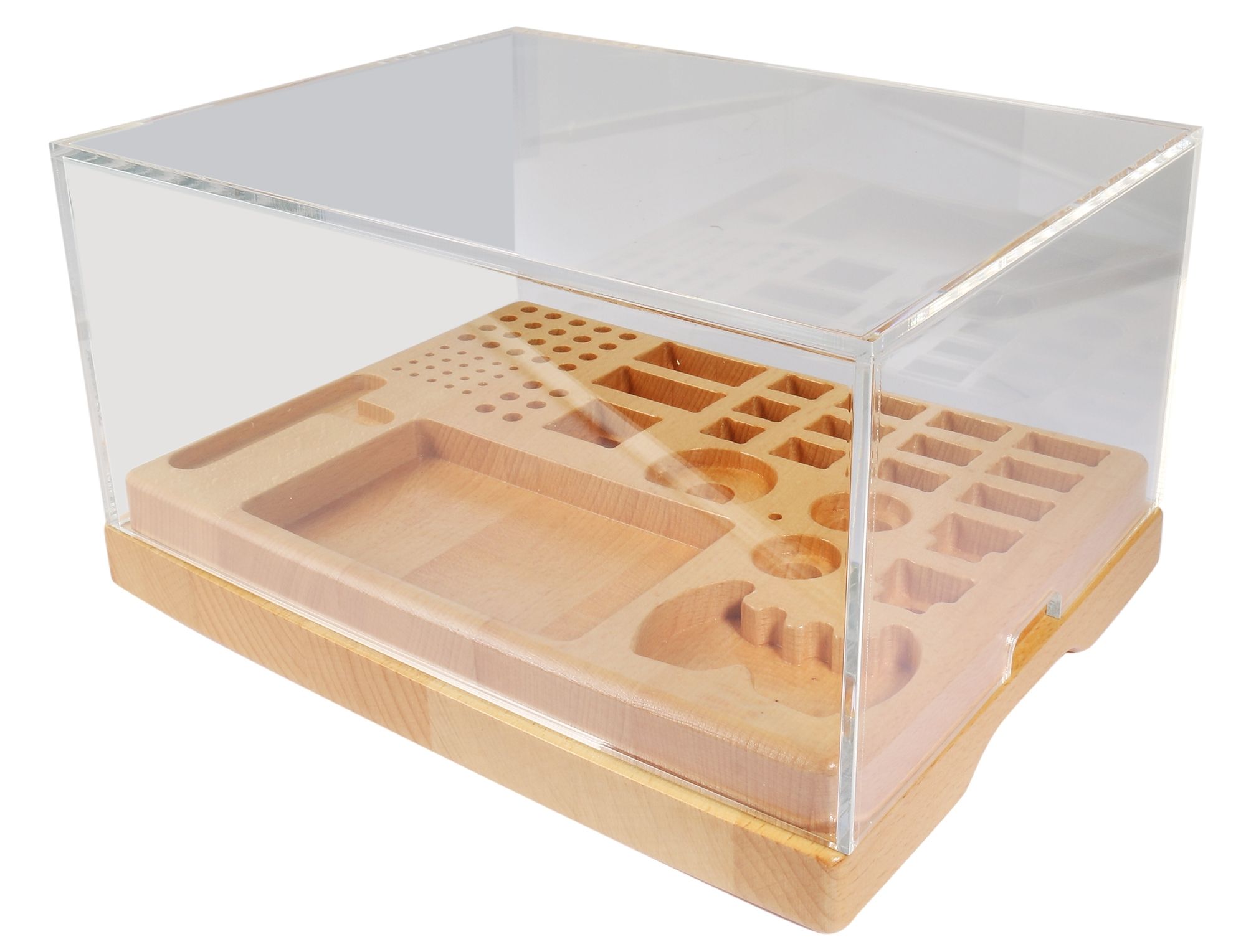 Alle reserveonderdelen van het multifunctionele gereedschap zijn netjes georganiseerd op een hoogwaardige houten plaat met precieze uitsparingen. Deze doordachte organisatie zorgt niet alleen voor een opgeruimde werkplek, maar maakt ook snelle toegang tot het benodigde gereedschap mogelijk. De tool wordt ook geleverd met een transparant perspex deksel, dat niet alleen dient als bescherming maar ook een duidelijk zicht op het gereedschap biedt.