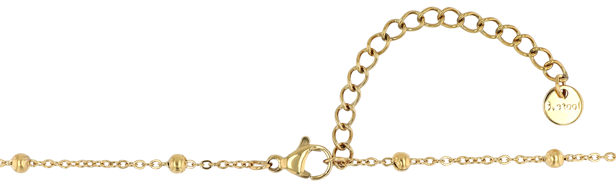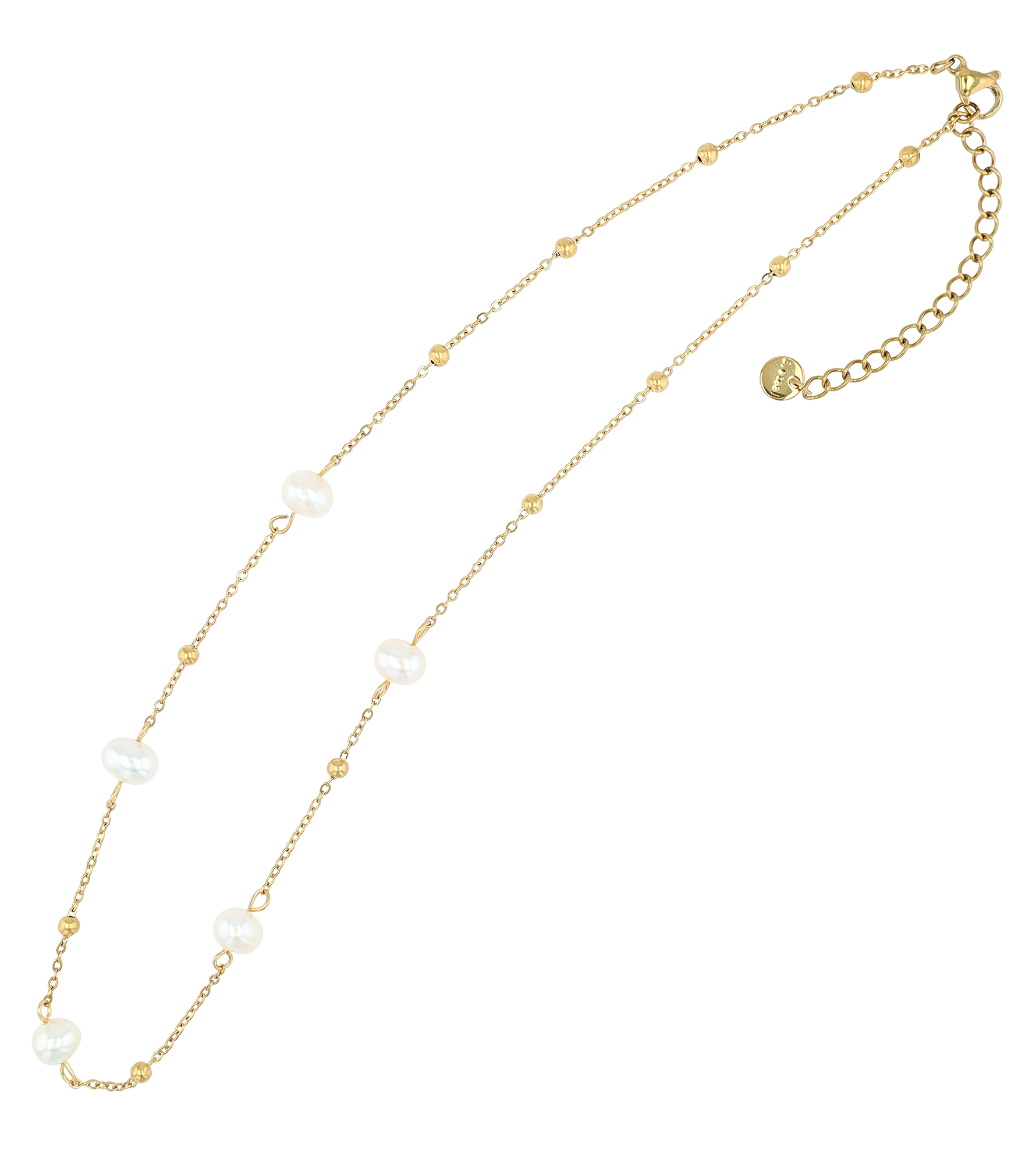 De basis is een duurzame roestvrijstalen ketting. Kleine roestvrijstalen kralen zijn gelijkmatig over de ketting verdeeld. Als bijzonder highlight zijn in het voorste gedeelte afwisselend met de kralen vijf echte zoetwaterparels gezet, die het sieraad een natuurlijke elegantie geven. De parels hebben een diameter van ca. Ø 7 mm.