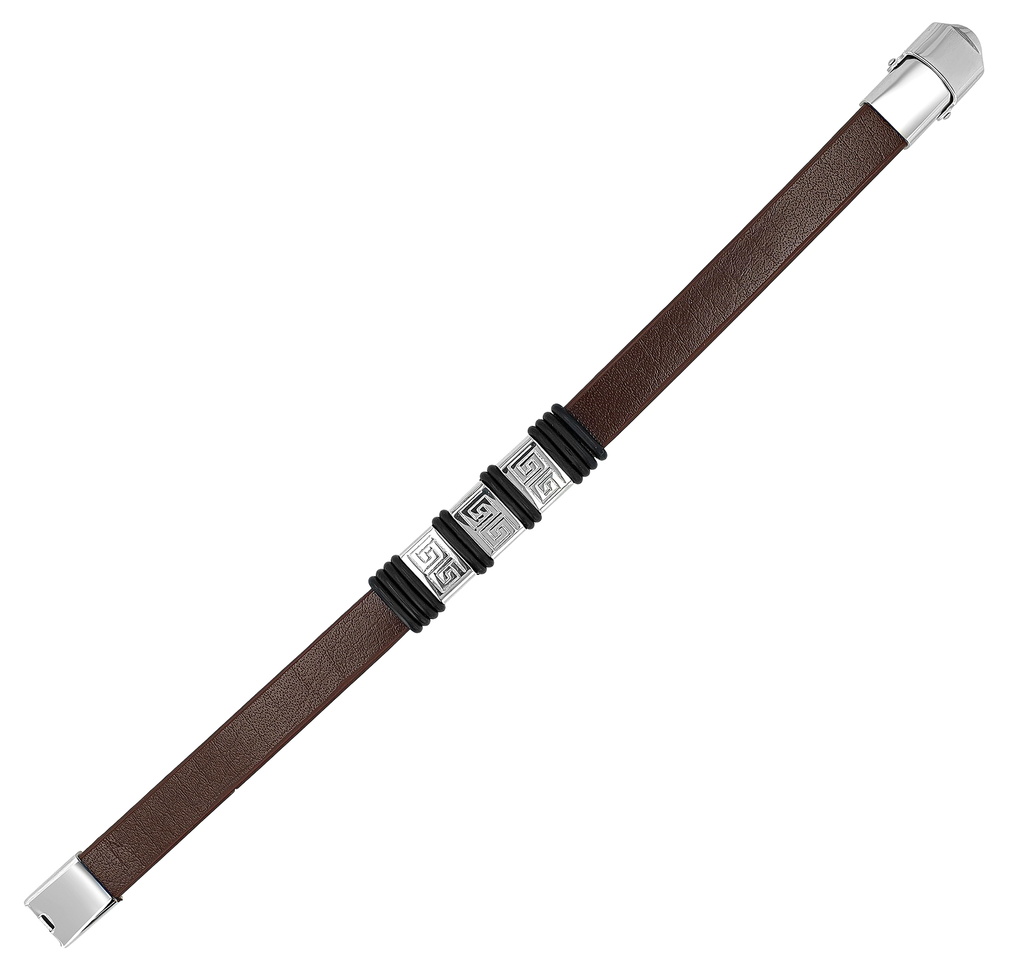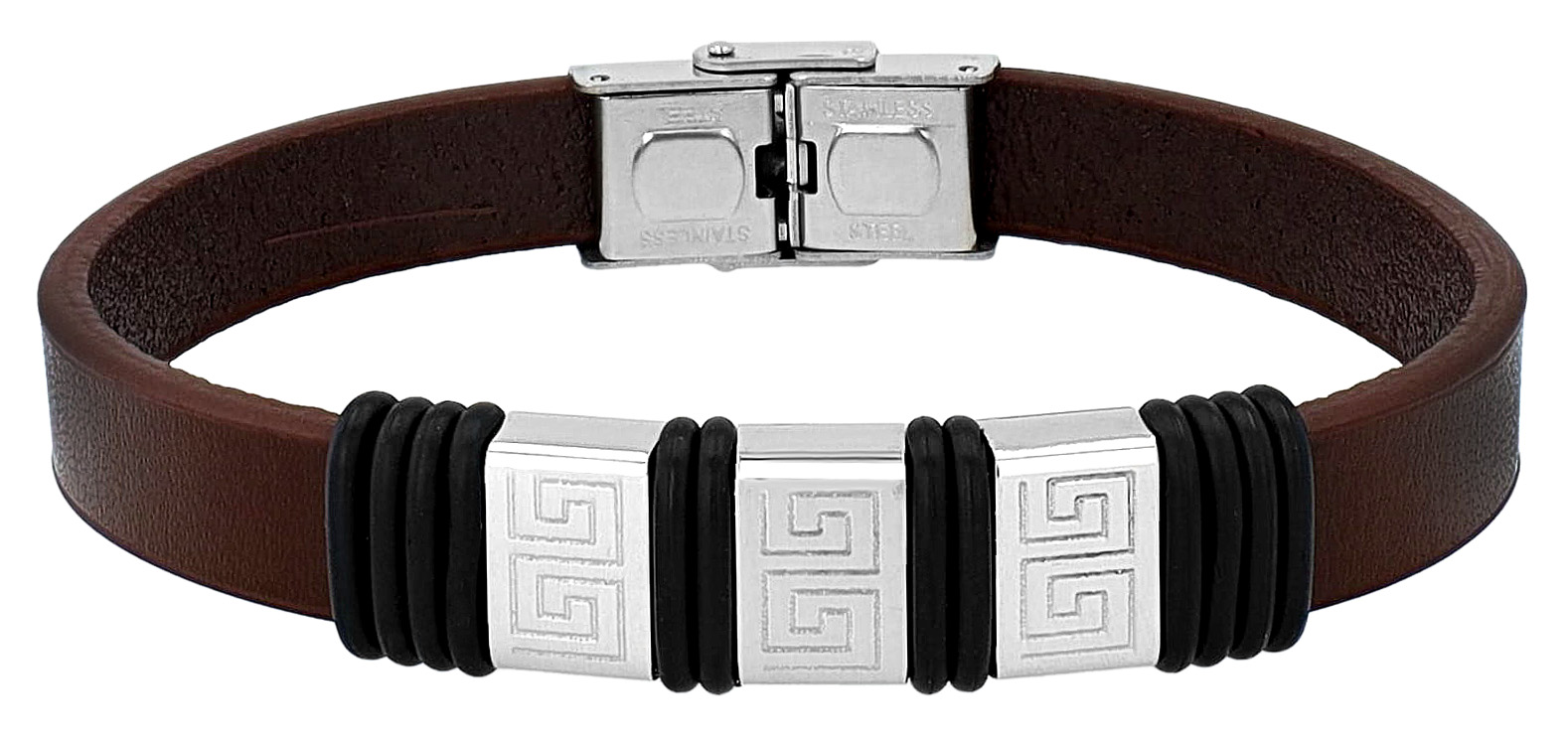 De echt lederen armband van het merk Akzent is gemaakt van een 1,3 cm brede lederen band. Deze is voorzien van drie zilverkleurige roestvrijstalen elementen van dezelfde grootte. Deze zijn versierd met Griekse symbolen. De roestvrijstalen elementen zijn van elkaar gescheiden en worden op hun plaats gehouden door zwarte rubberen banden. De totale lengte van de armband is 21 cm.