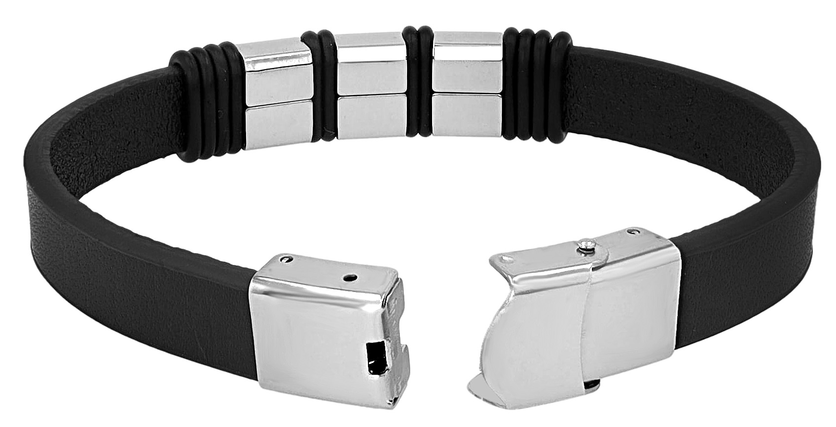 De echt lederen armband van het merk Akzent is gemaakt van een 1,3 cm brede lederen band. Deze is voorzien van drie zilverkleurige roestvrijstalen elementen van dezelfde grootte. Deze zijn versierd met Griekse symbolen. De roestvrijstalen elementen zijn van elkaar gescheiden en worden op hun plaats gehouden door zwarte rubberen banden. De totale lengte van de armband is 21 cm.