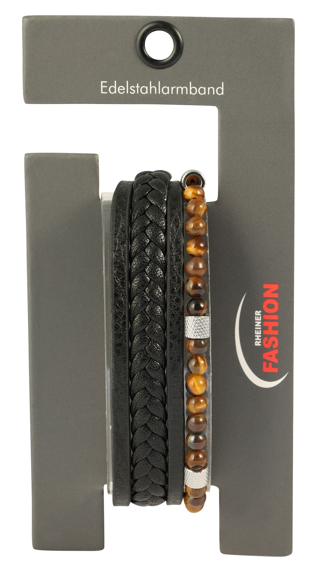 Drei Stränge aus Lederimitat – mal glatt, mal geflochten – harmonieren perfekt mit dem vierten Strang, der mit Natursteinen und Edelstahlelementen besetzt ist.