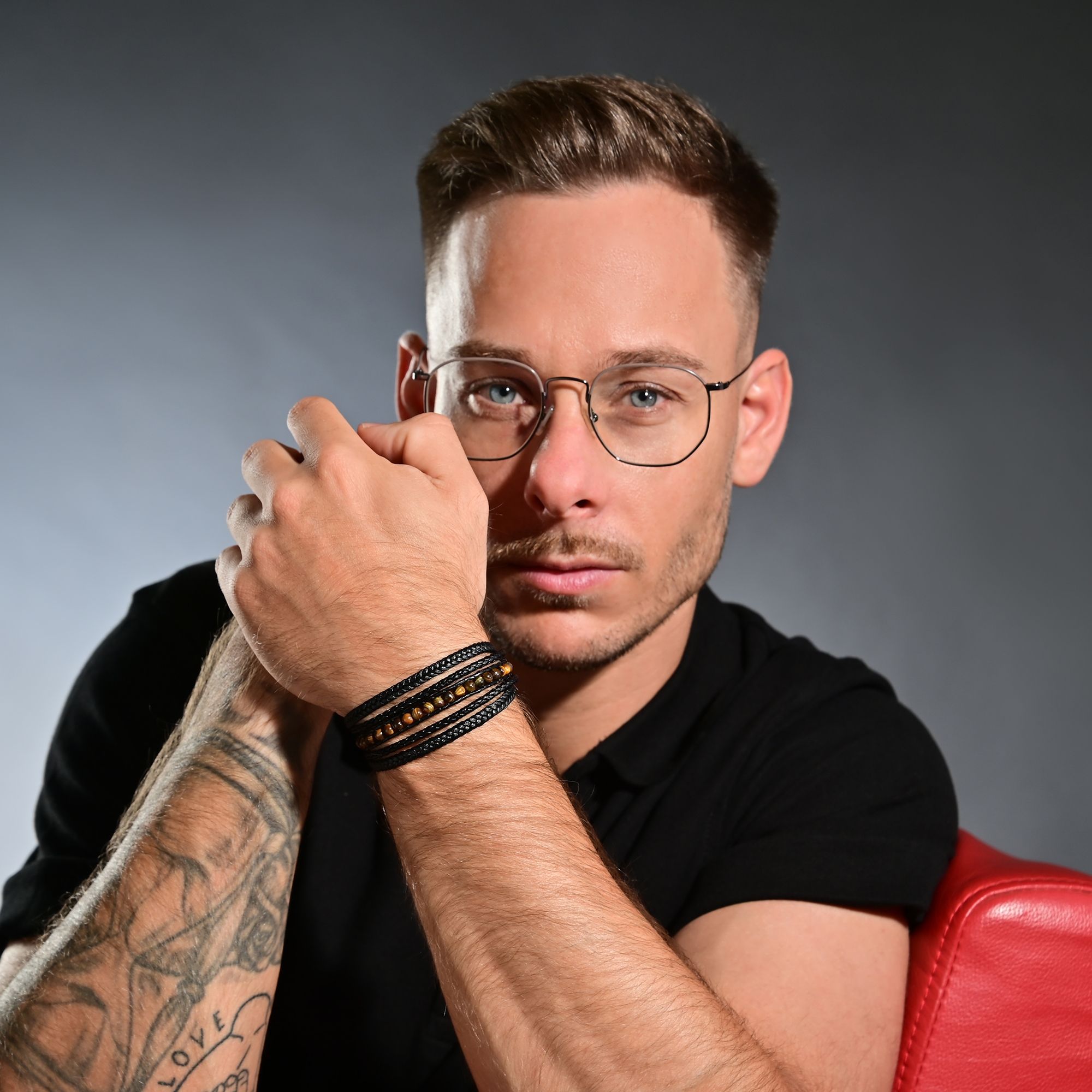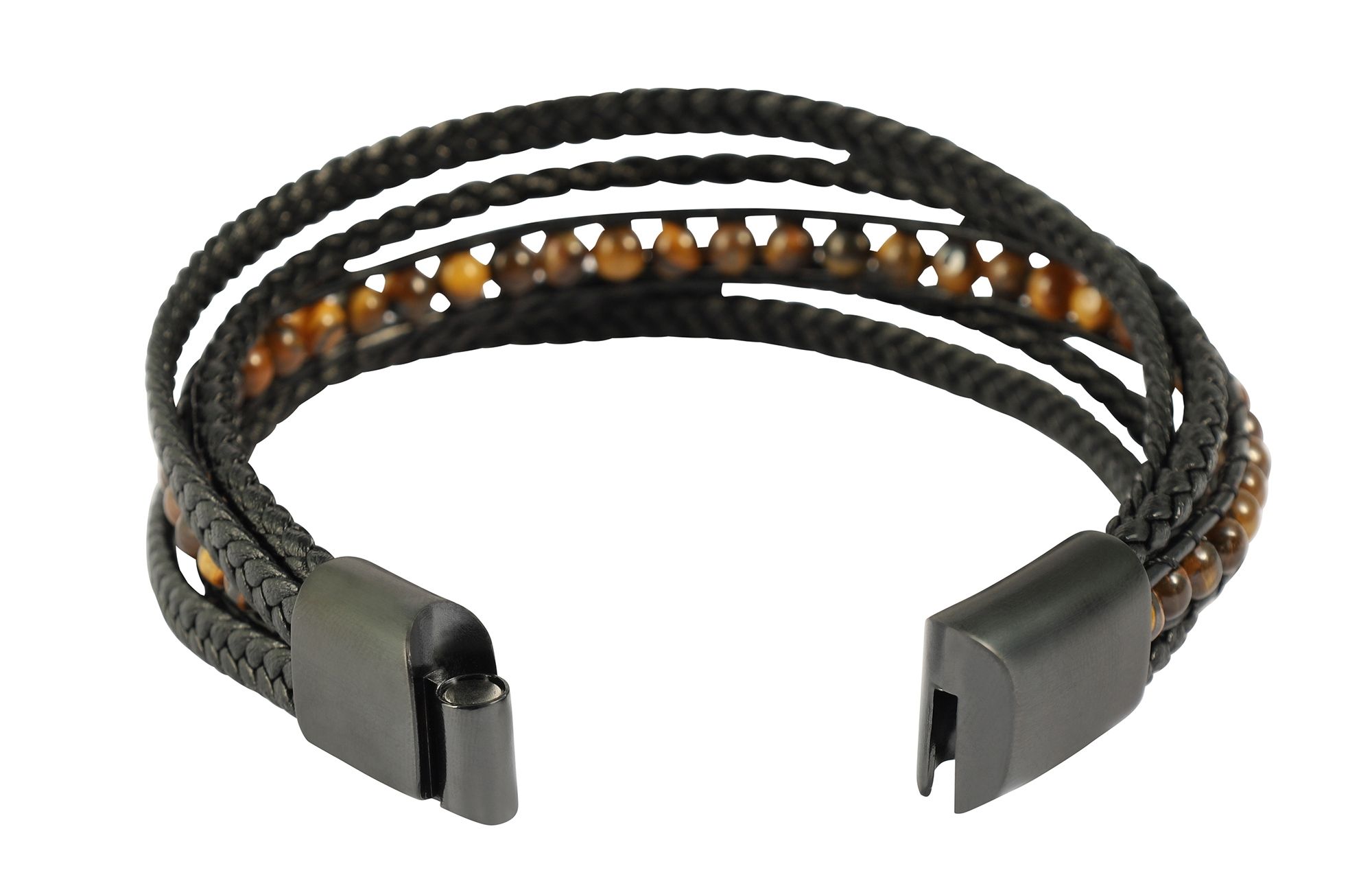 De armband "Natan" wordt gekenmerkt door de geraffineerde combinatie van vijf strengen van imitatieleer. De middelste streng, versierd met kostbare tijgeroogkralen met een Ø van 0,45 mm, vormt het visuele middelpunt. De buitenste strengen zijn op twee verschillende manieren gevlochten, waardoor de armband een gevarieerde maar harmonieuze structuur heeft.