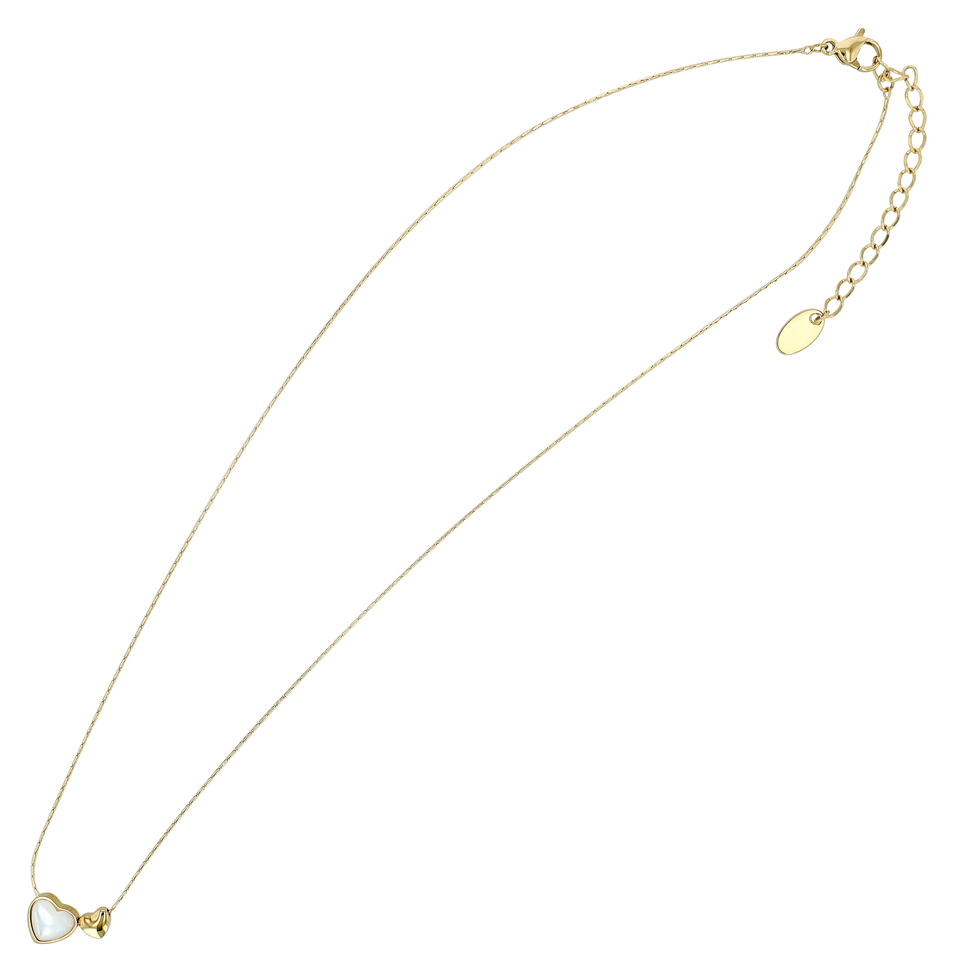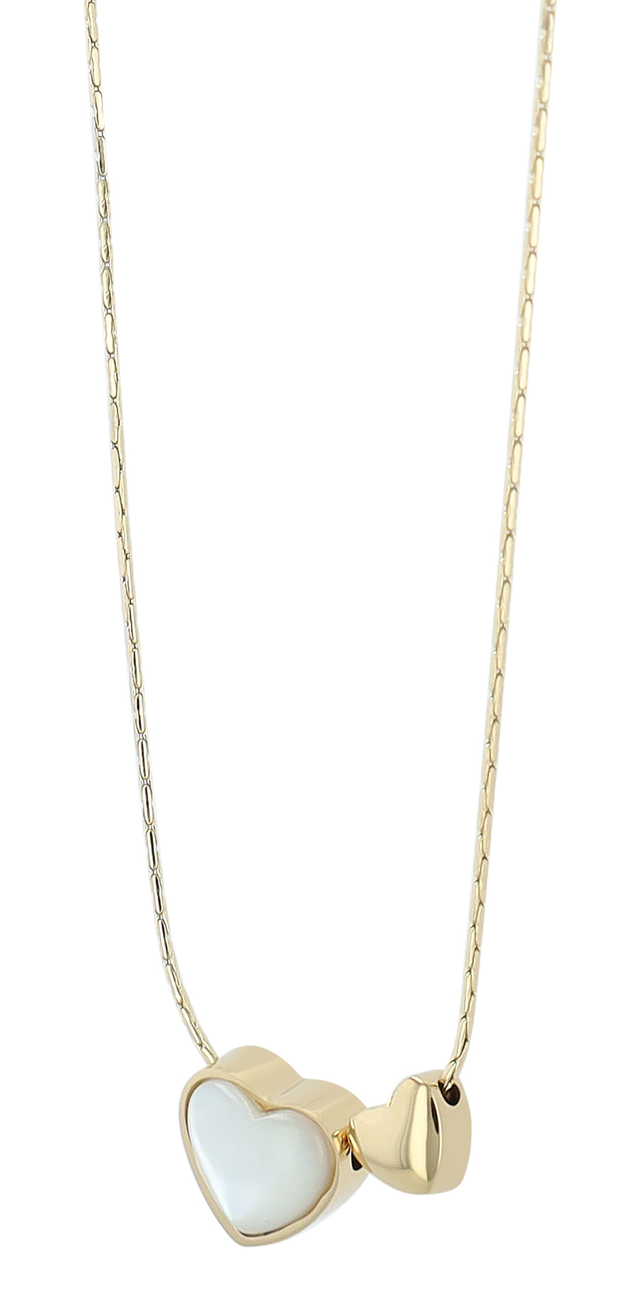 Dit accessoire is gemaakt van roestvrij staal en heeft een modern ontwerp met romantische elegantie. De belangrijkste hanger, een hart (L 7 mm / B 8 mm) liefdevol omlijst met glinsterend parelmoer, wordt aangevuld met een ander klein, delicaat hart. Beide hangers zijn stevig geïntegreerd in de ketting zodat ze niet kwijt kunnen raken. Met een kettinglengte van 41 cm en een verlenging van 5 cm past dit sieraad zich flexibel aan elke halslijn aan. De elegante goudkleurige afwerking geeft de ketting een luxe uitstraling - perfect voor iedereen die stijlvolle accenten wil zetten.