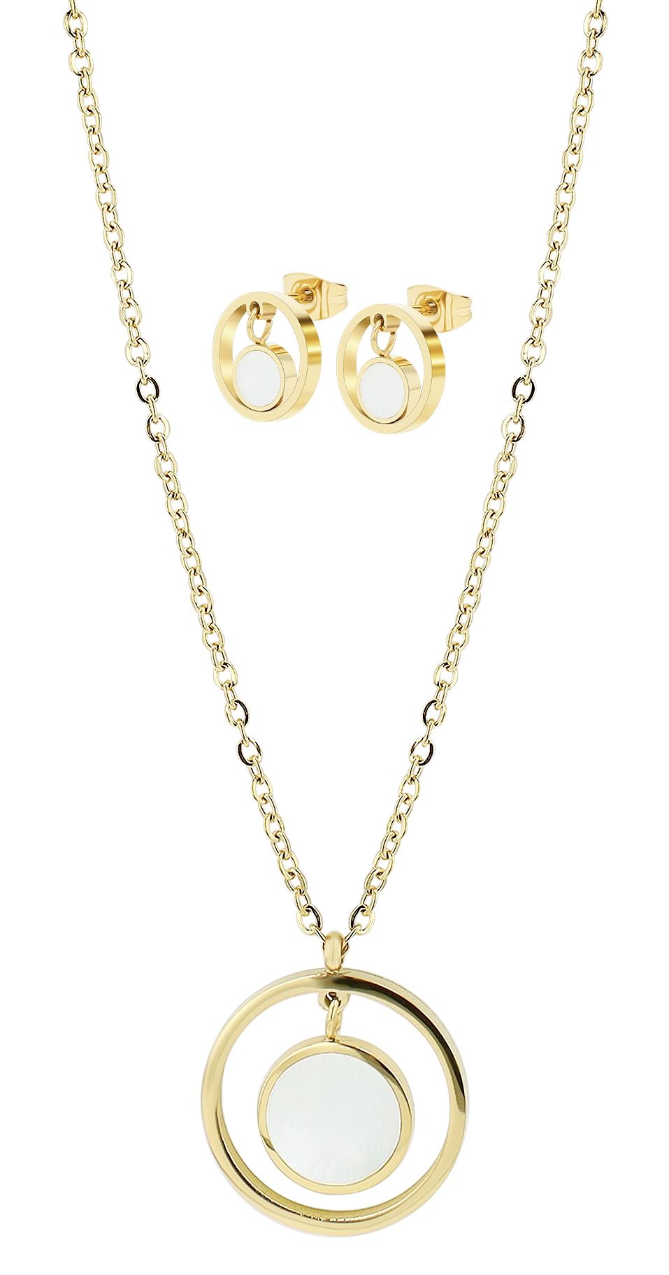 Deze sieradenset is gemaakt van robuust roestvrij staal en wordt niet alleen gekenmerkt door zijn duurzaamheid en onderhoudsgemak, maar ook door zijn hypoallergene eigenschappen, waardoor het de ideale keuze is om elke dag te dragen. Het lichte gewicht van het materiaal zorgt voor een aangenaam draagcomfort en een duurzame kwaliteit. De set is gemaakt van hoogwaardig roestvrij staal en bestaat uit een halsketting van 45 cm met een hanger en bijpassende oorstekers. De sieraden worden gepresenteerd als ronde cirkels, waarop een klein, rond parelmoeren element zweeft en elegant zwaait bij elke beweging.