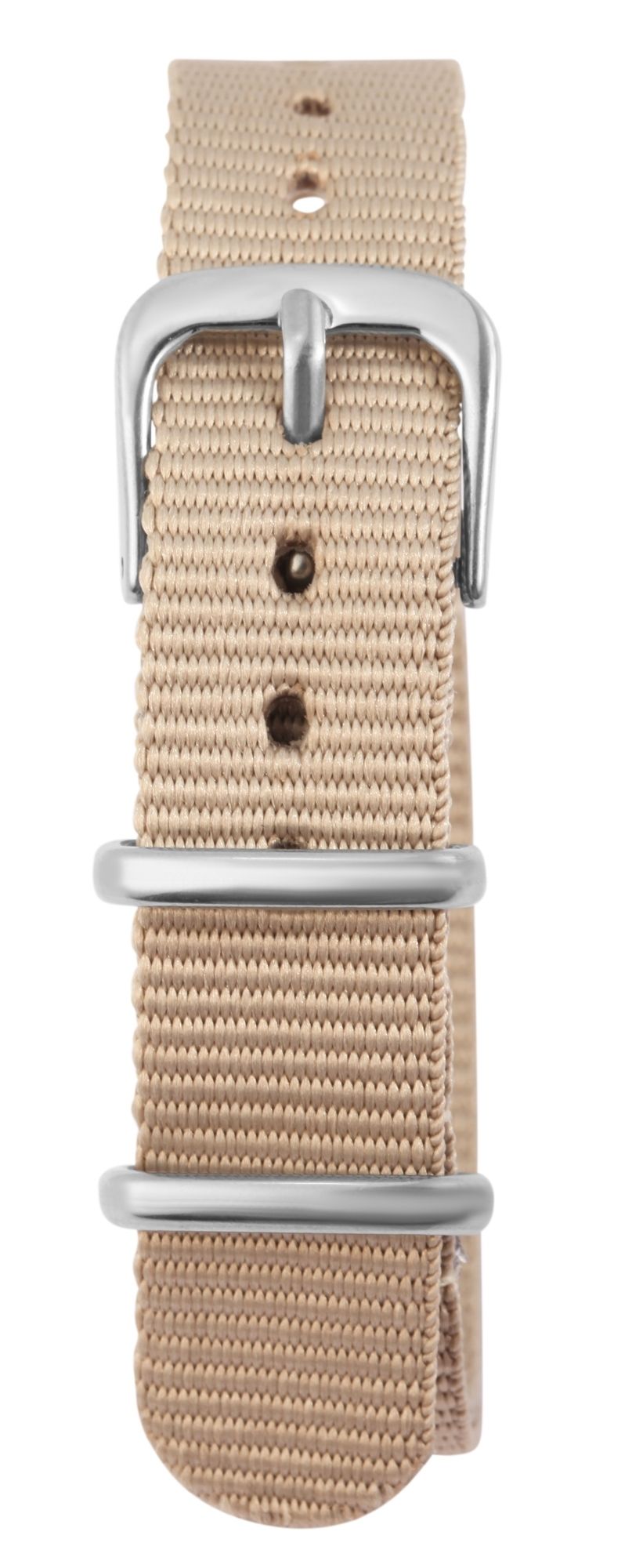 De beige nylon horlogeband heeft een lugbreedte van 14 mm. Het kan eenvoudig aan de horlogekast worden bevestigd met twee standaard veerpennen. Het horlogebandje heeft een totale lengte van 24,5 cm. Het horlogebandje kan worden geopend en gesloten met een zilverkleurige gesp. Twee metalen lussen zijn ook stevig aan het horlogebandje genaaid. Het zachte materiaal maakt de horlogeband bijzonder comfortabel om te dragen. Het eenvoudige uiterlijk maakt het mogelijk om de horlogeband aan elk type horloge te bevestigen. Het past goed bij het algemene uiterlijk van de horloges.
