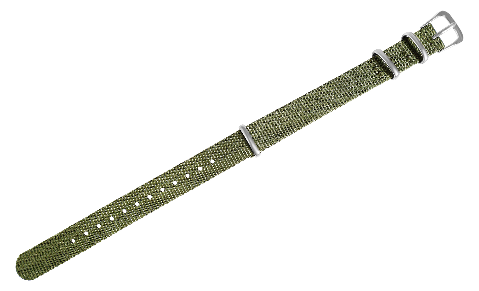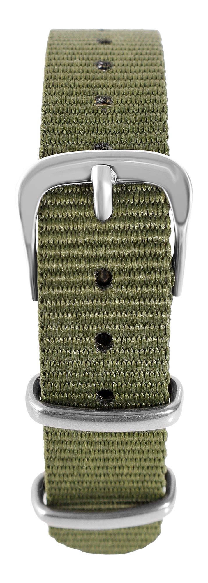 Het kakikleurige nylon horlogebandje is verkrijgbaar met lugbreedtes van 14 mm, 16 mm, 18 mm en 20 mm. Het kan eenvoudig aan de horlogekast worden bevestigd met twee standaard veerpennen. Het horlogebandje heeft een totale lengte van 24,5 cm, 25,5 cm en 26,5 cm. De totale lengte is afhankelijk van de breedte van de lug. Het horlogebandje kan worden geopend en gesloten met een zilverkleurige gesp. Twee metalen lussen zijn ook stevig aan het horlogebandje genaaid. Het zachte materiaal maakt de horlogeband bijzonder comfortabel om te dragen. Het eenvoudige uiterlijk maakt het mogelijk om de horlogeband aan elk type horloge te bevestigen. Het past goed bij het algemene uiterlijk van de horloges.
