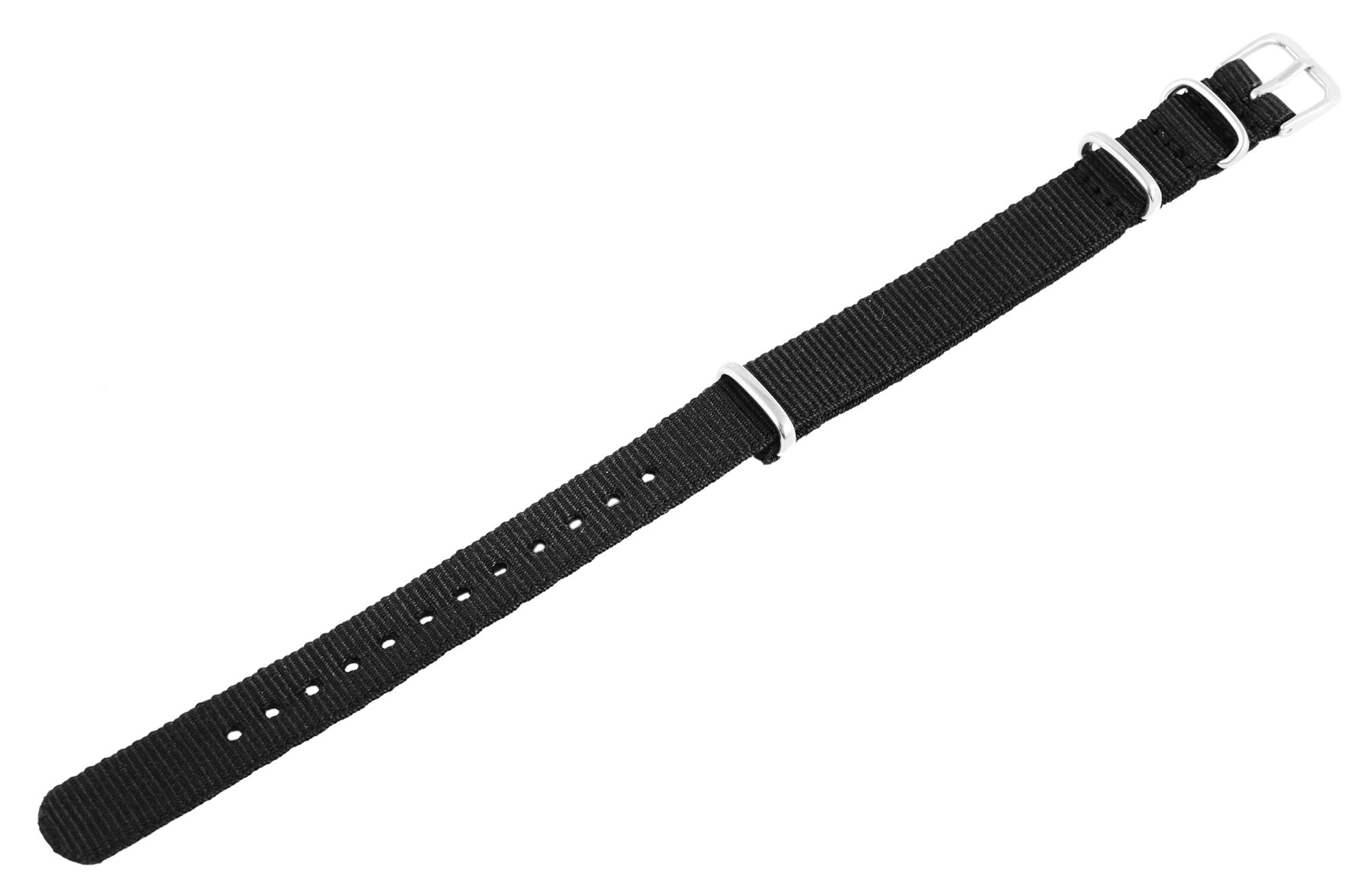 De zwarte nylon horlogeband is verkrijgbaar met lugbreedtes van 14 mm, 16 mm, 18 mm, 20 mm en 22 mm. Het kan eenvoudig aan de horlogekast worden bevestigd met twee standaard veerpennen. Het horlogebandje heeft een totale lengte van 24,5 cm, 25,5 cm, 26,5 cm en 28 cm. De totale lengte is afhankelijk van de breedte van de lug. Het horlogebandje kan worden geopend en gesloten met een zilverkleurige gesp. Twee metalen lussen zijn ook stevig aan het horlogebandje genaaid. Het zachte materiaal maakt de horlogeband bijzonder comfortabel om te dragen. Het eenvoudige uiterlijk maakt het mogelijk om de horlogeband aan elk type horloge te bevestigen. Het past goed bij het algemene uiterlijk van de horloges.