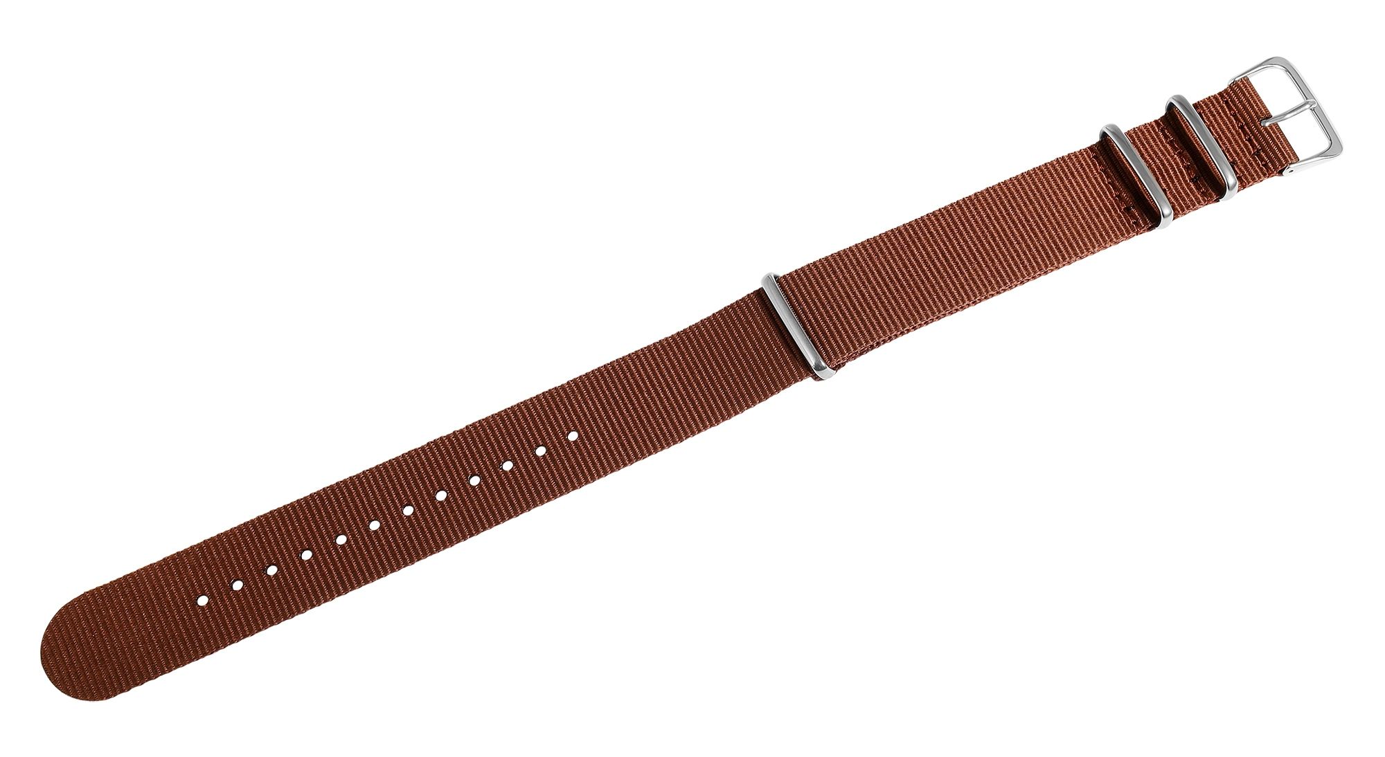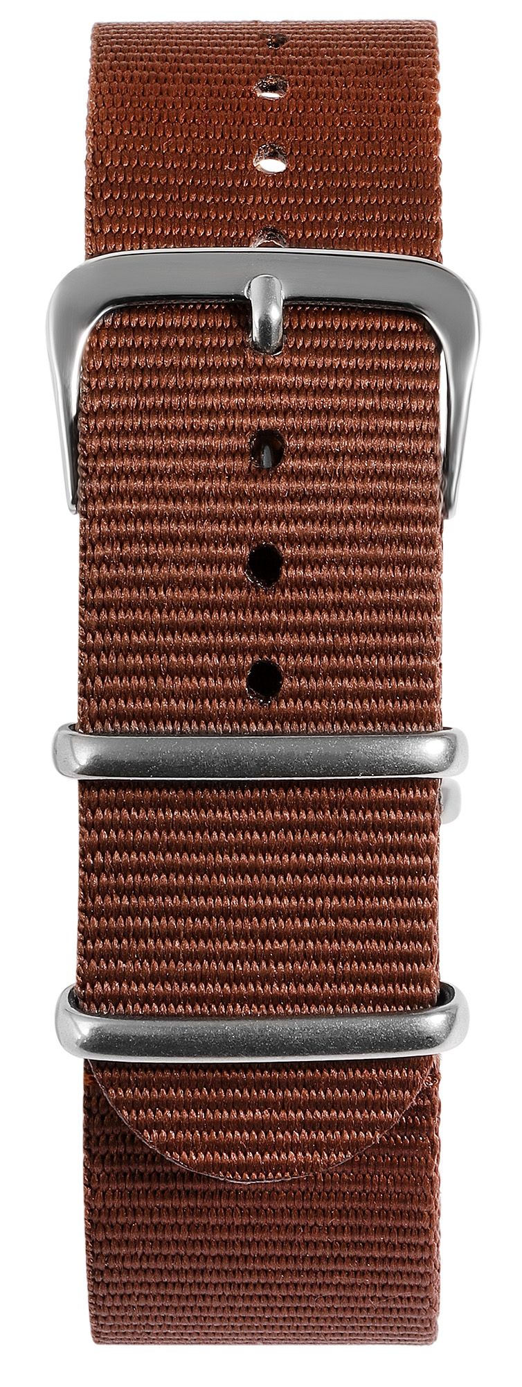 De donkerbruine nylon horlogeband heeft een lugbreedte van 18 mm. Het kan eenvoudig aan de horlogekast worden bevestigd met twee standaard veerbeugels. Het horlogebandje heeft een totale lengte van 26,5 cm. Het horlogebandje kan worden geopend en gesloten met een zilverkleurige gesp. Twee metalen lussen zijn ook stevig aan het horlogebandje genaaid. Het zachte materiaal maakt de horlogeband bijzonder comfortabel om te dragen. Het eenvoudige uiterlijk maakt het mogelijk om de horlogeband aan elk type horloge te bevestigen. Het past goed bij het algemene uiterlijk van de horloges.