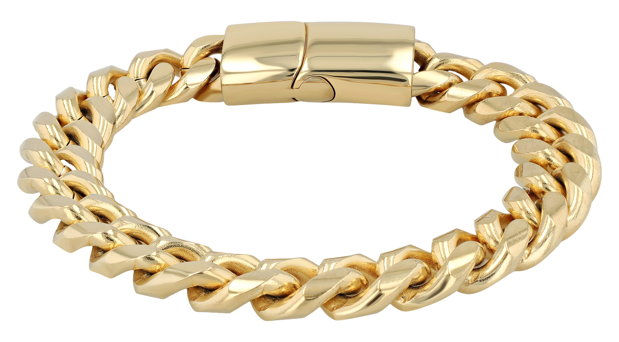 Verkrijgbaar in zilverkleurige, zwarte of goudkleurige plating, past deze armband bij elke stijl.
