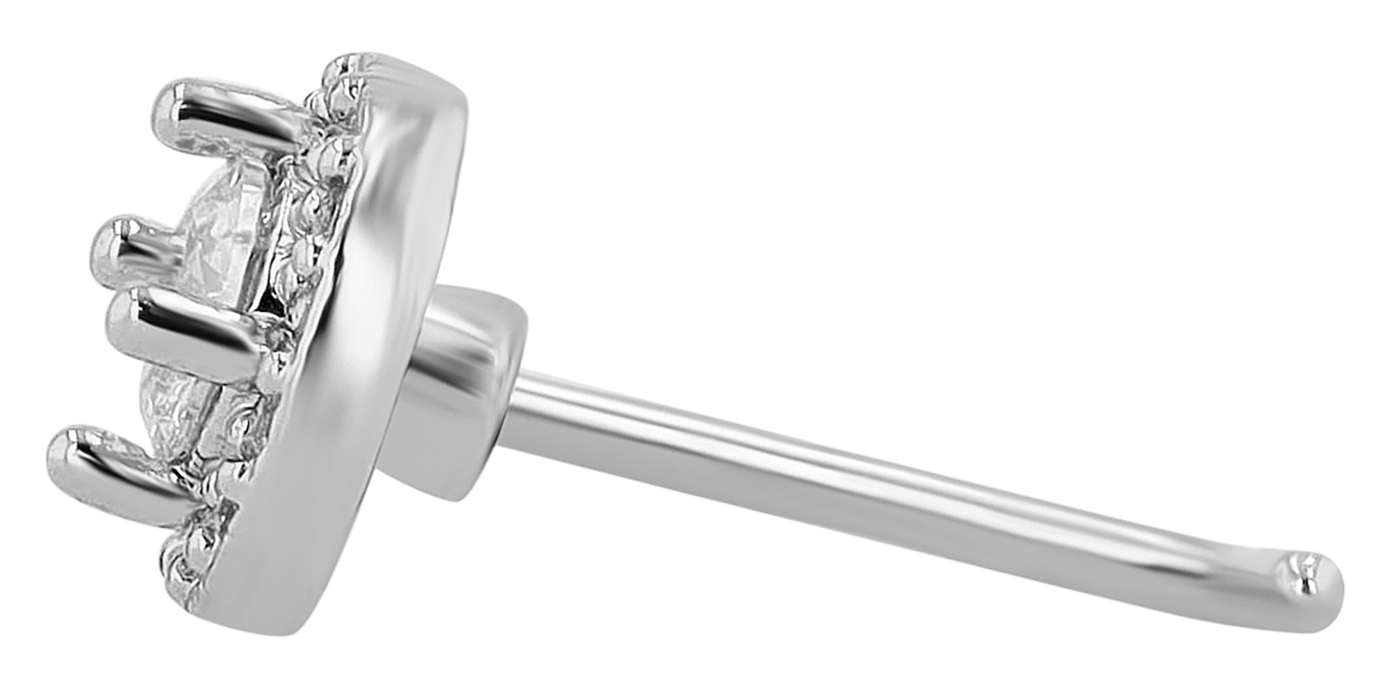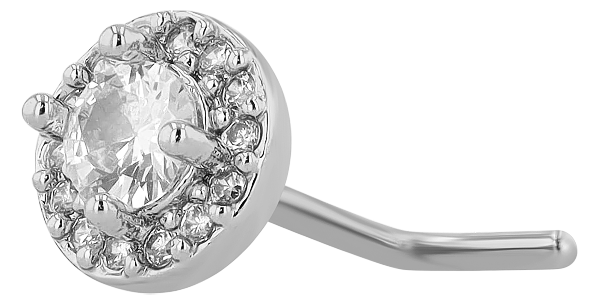 De ronde stud heeft een diameter van 6 mm en een hoogte van 4 mm. Versierd met een fonkelende zirkoon (Ø 3 mm), die op zijn plaats wordt gehouden door een klassieke 4-klauw zetting, zal deze piercing ieders aandacht trekken. Het centrale steentje wordt ook omlijst door 14 kleinere zirkonia steentjes, die het een stralende schittering geven. De L-vorm is een populaire optie voor neuspiercings vanwege de stevige grip en het gemakkelijk inbrengen en verwijderen.