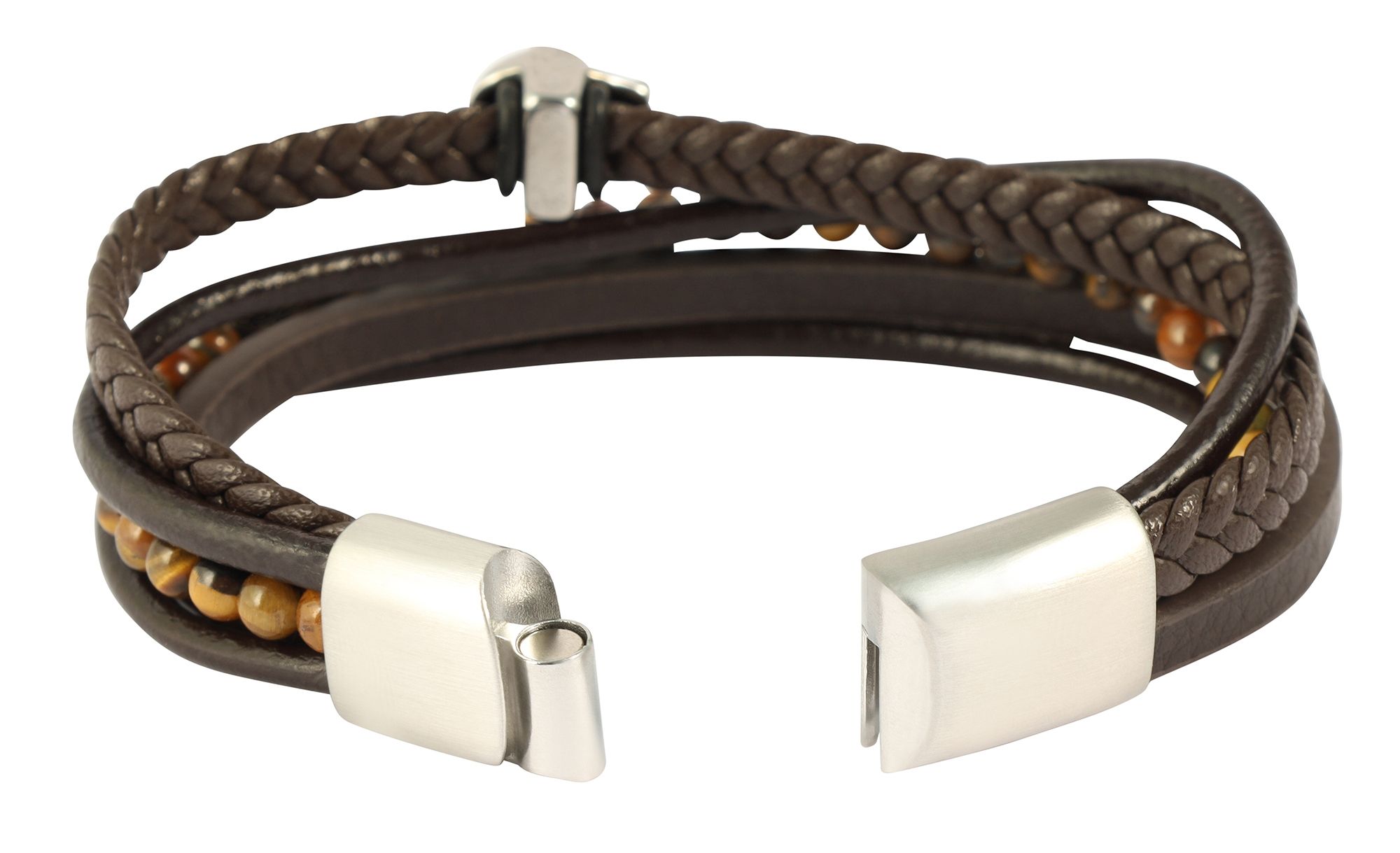 De "Perry"-armband wordt gekenmerkt door zijn gevarieerde structuur, die ontstaat door verschillende texturen van imitatieleer te combineren. De warme, aardse tinten van de bruine tijgeroogkralen geven de armband een natuurlijke elegantie, terwijl de opvallende roestvrijstalen hanger in de vorm van een schedel het ontwerp een rebels tintje geeft.