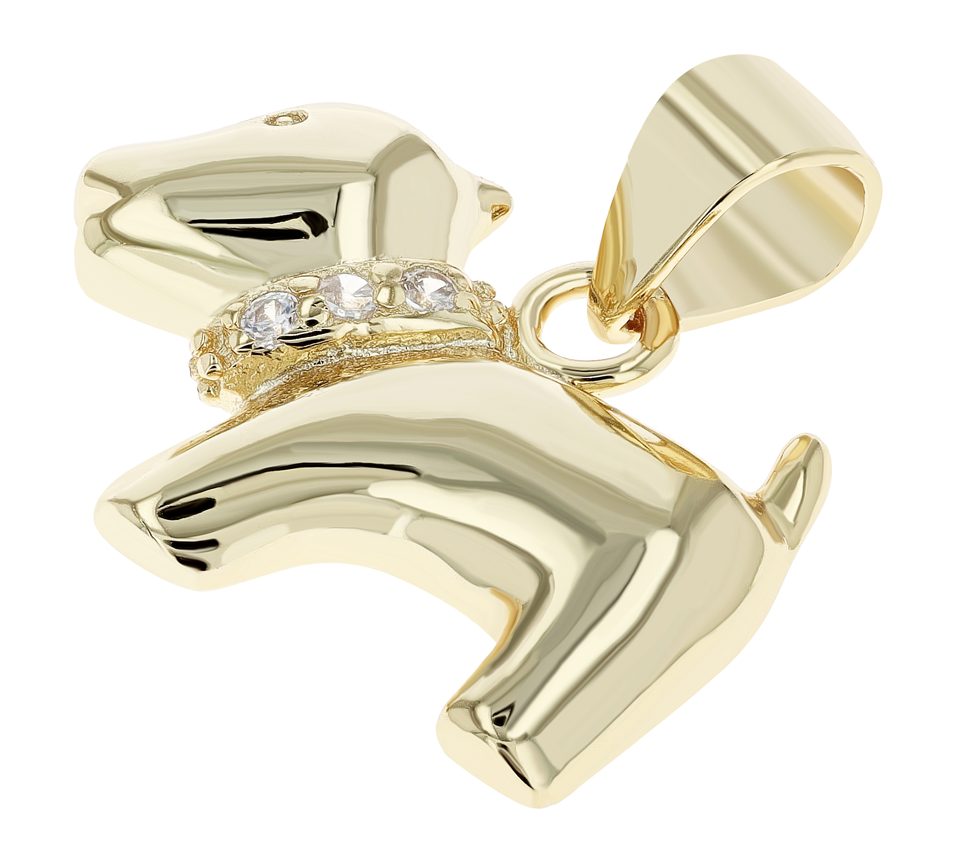 De halsband van de hond is versierd met 3 kleine zirkonia steentjes, die de delicate hanger zijn speciale charme geven en een uitdrukking zijn van dit liefdevolle ontwerp voor alle hondenfans. De hanger is 12 mm lang, 17 mm breed en 2,5 mm dik.